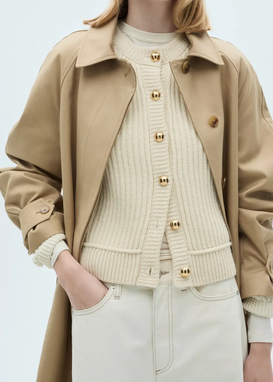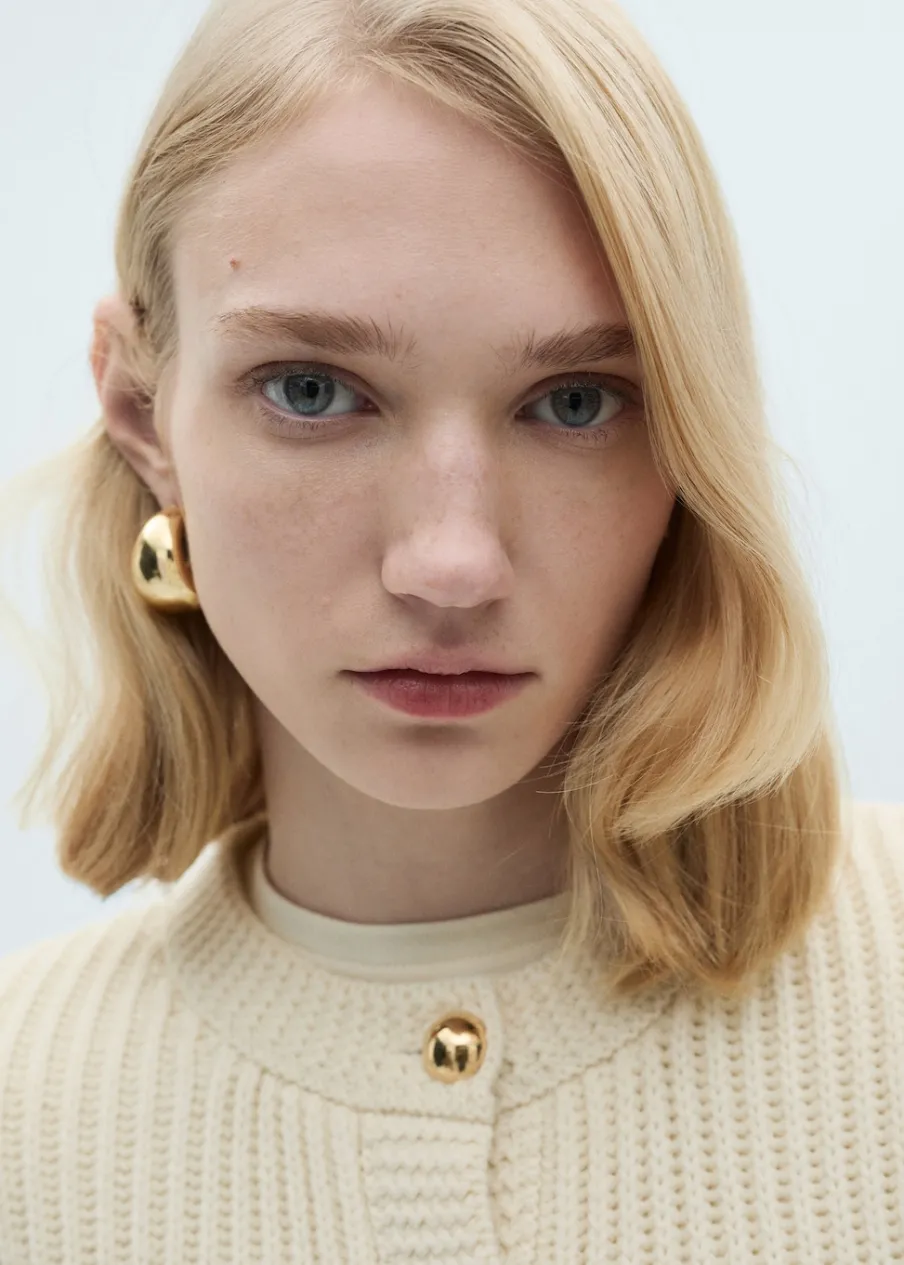 Dzianina o średniej grubości. Model standardowy. Model prosty. Okrągły dekolt. Długi rękaw. Zapięcie z przodu na guziki. Biżuteryjne guziki.