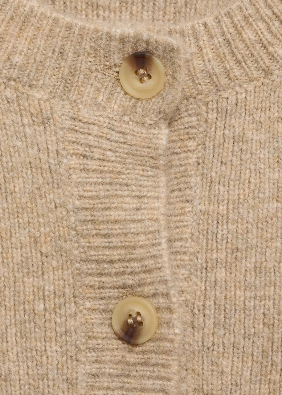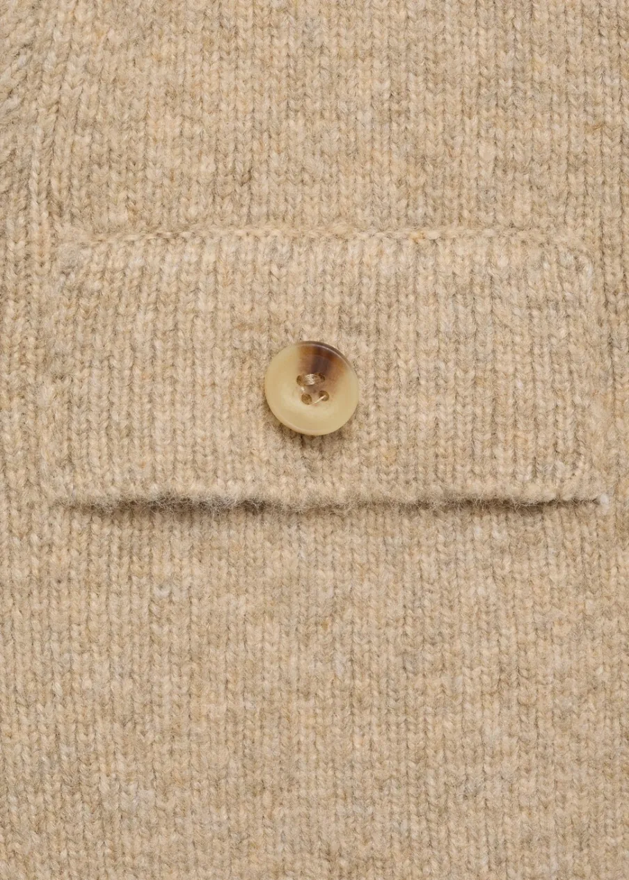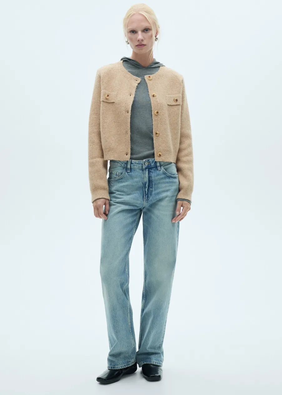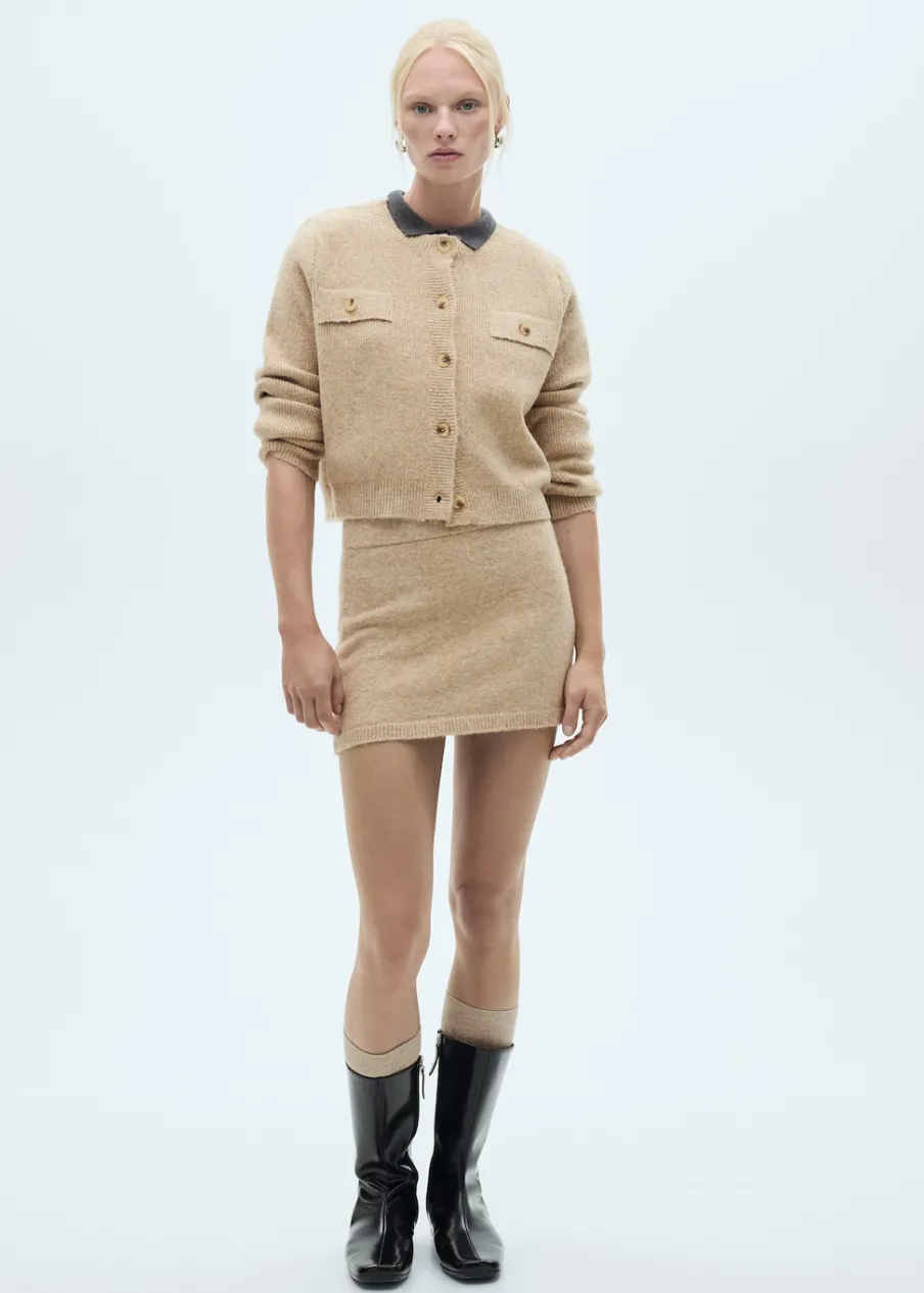 Tkanina mieszanka wełny. Ściągaczowa dzianina. Dzianina średniej grubości. Krótki krój. Model prosty. Okrągły dekolt. Długi rękaw. Zapięcie z przodu na guziki. Dwie przednie kieszenie z patką i guzikiem. Modelka ma 178 cm wzrostu i nosi rozmiar S/36. Total look.