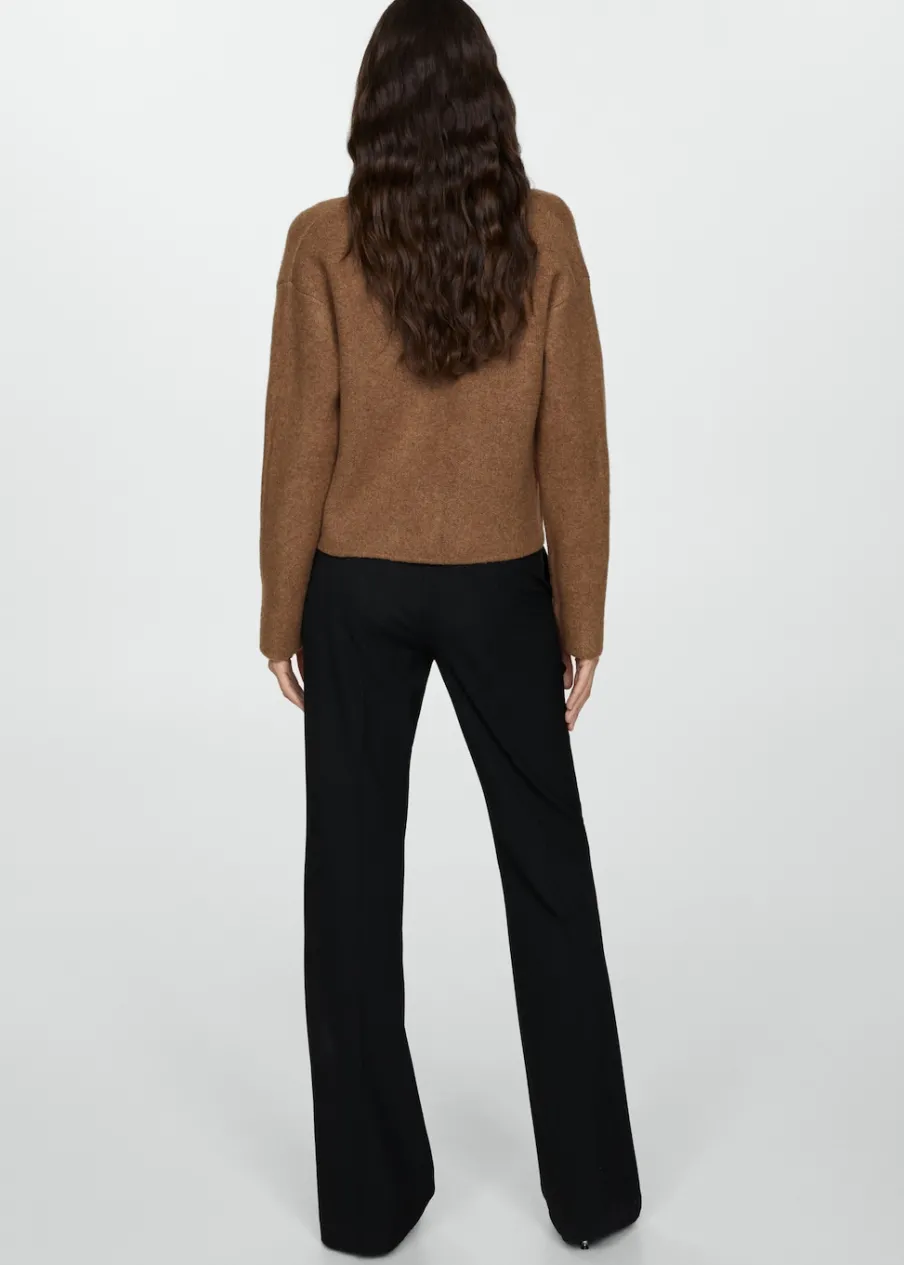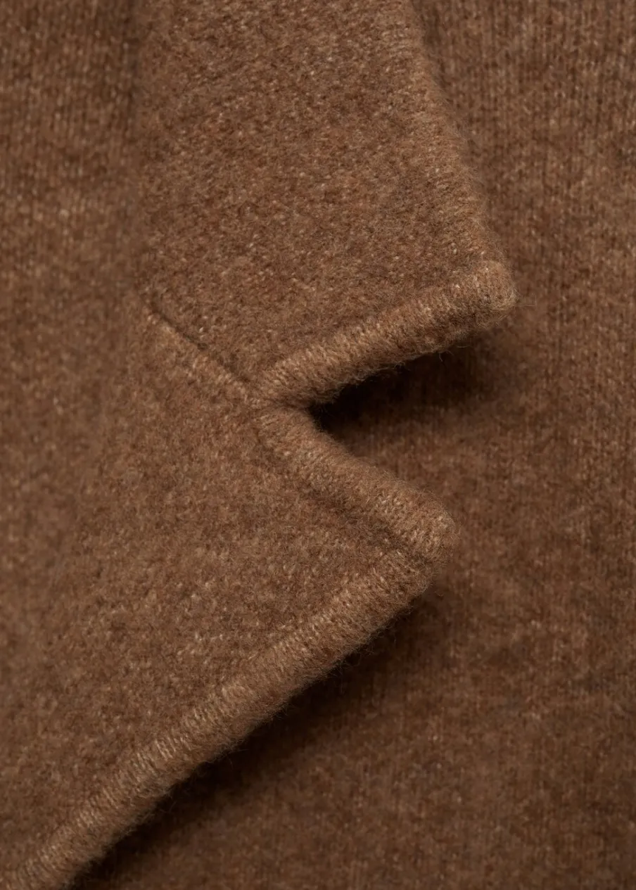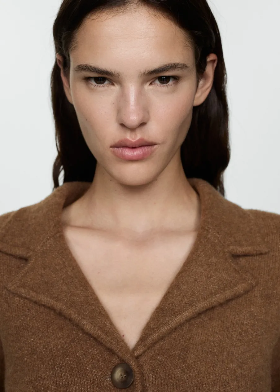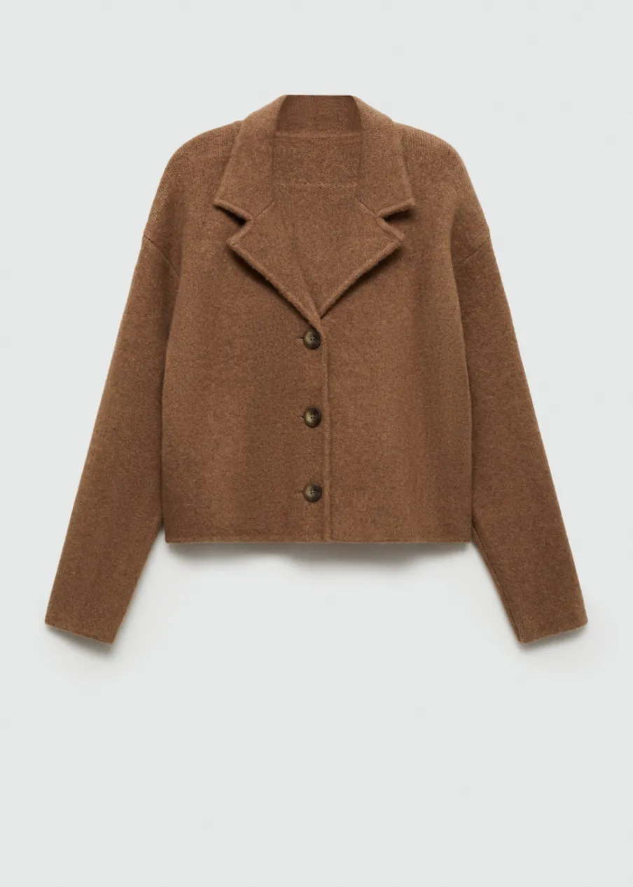 Tkanina z cienkiej dzianiny. Model prosty. Dekolt w szpic z kołnierzykiem. Długi rękaw. Zapięcie z przodu na guziki.