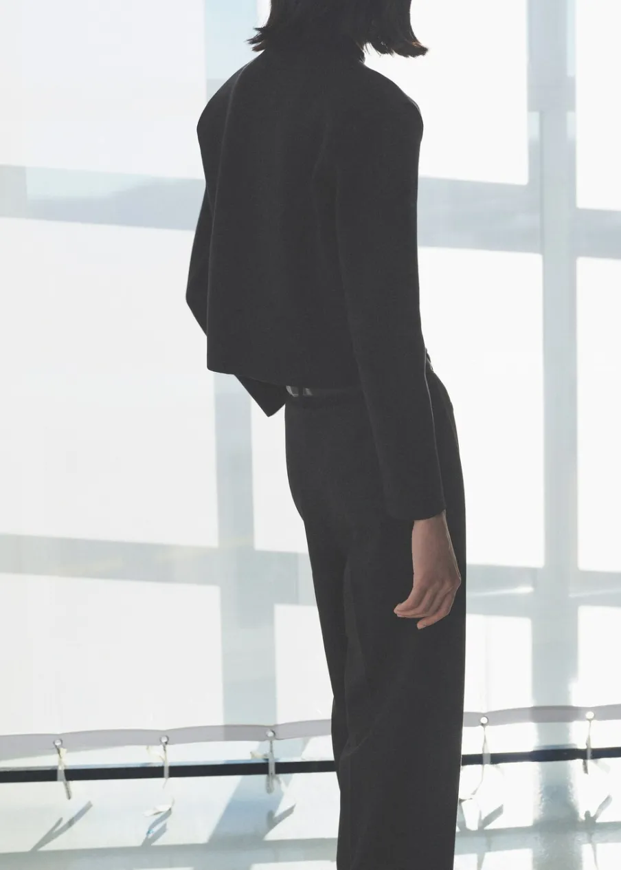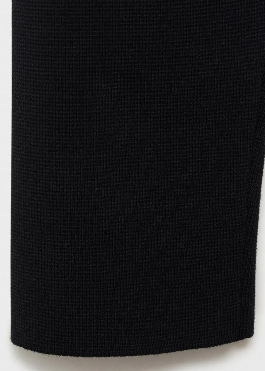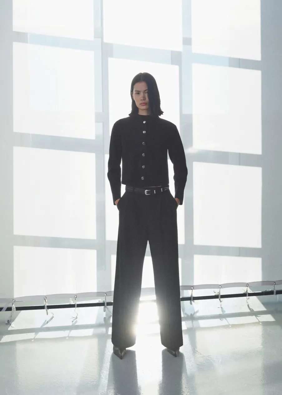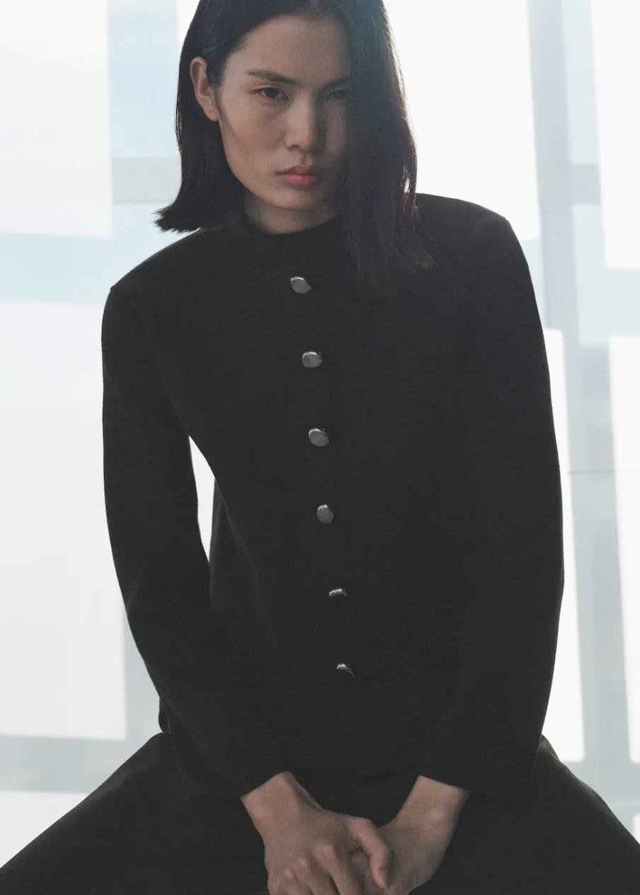 Tkanina z cienkiej dzianiny. Model prosty. Stójkowy kołnierzyk. Długi rękaw. Zapięcie na guziki z przodu. Biżuteryjne guziki.