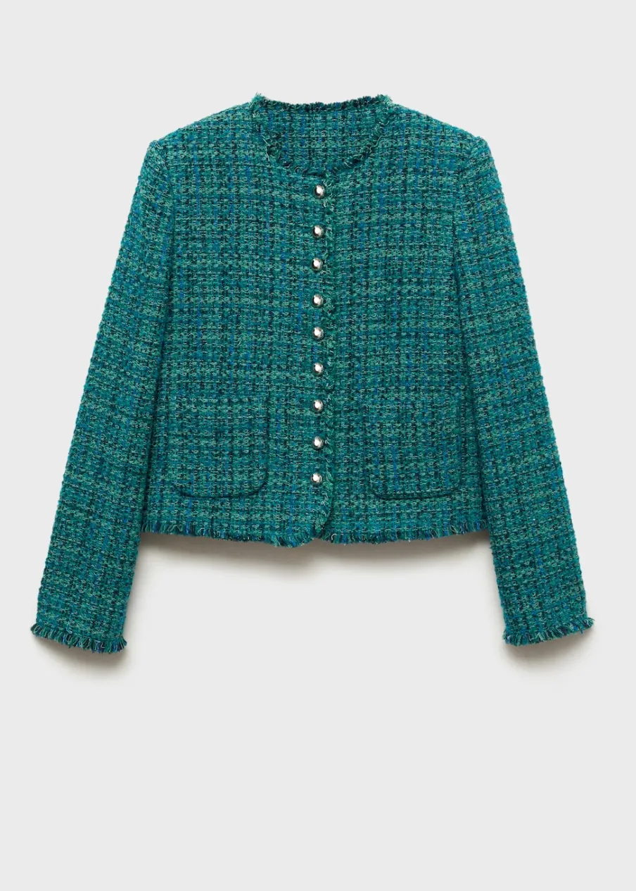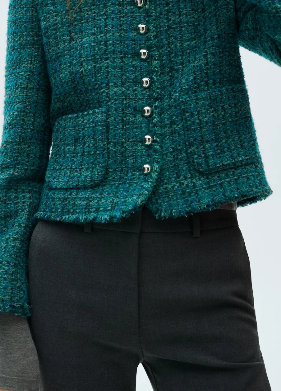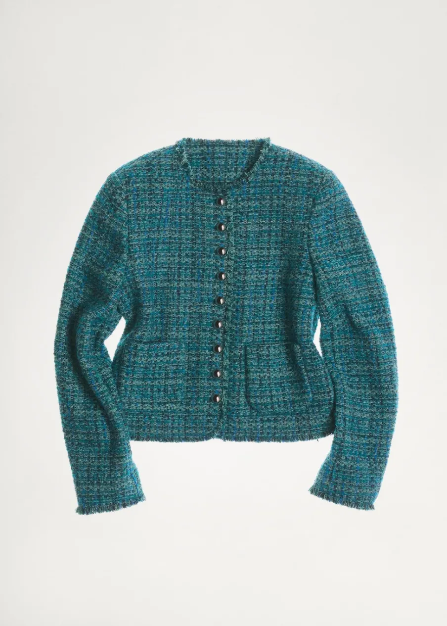 Tkanina tweedowa. Tkanina z mieszanki bawełny i wełny. Model prosty. Okrągły dekolt. Długi rękaw. Dwie kieszenie nakładane z przodu. Zapięcie z przodu na guziki. Biżuteryjne guziki. Postrzępione wykończenia. Wewnętrzna podszewka.