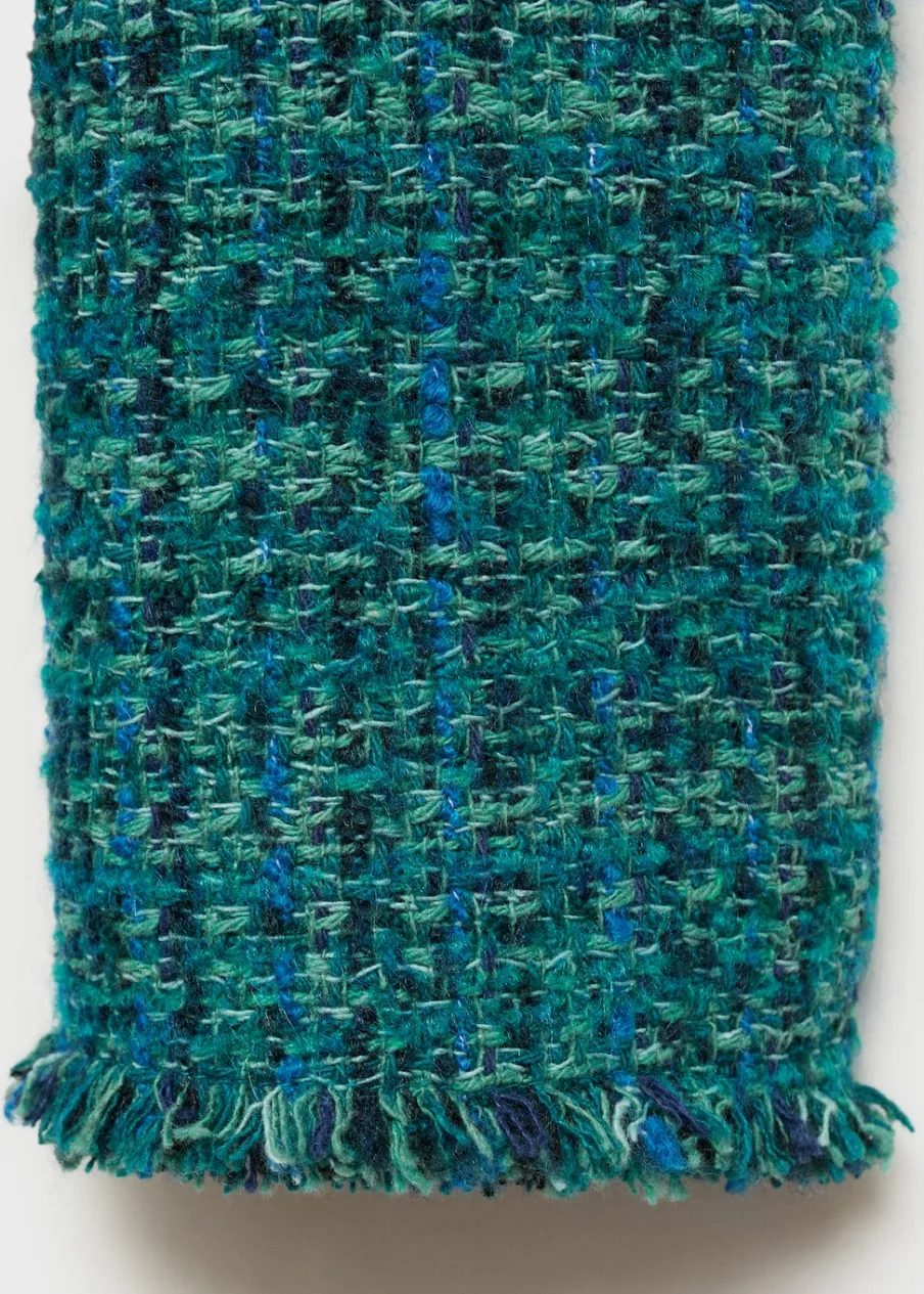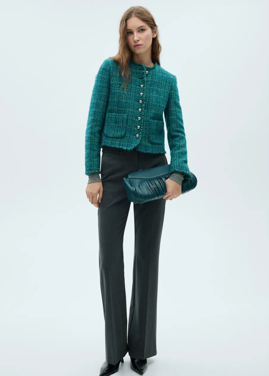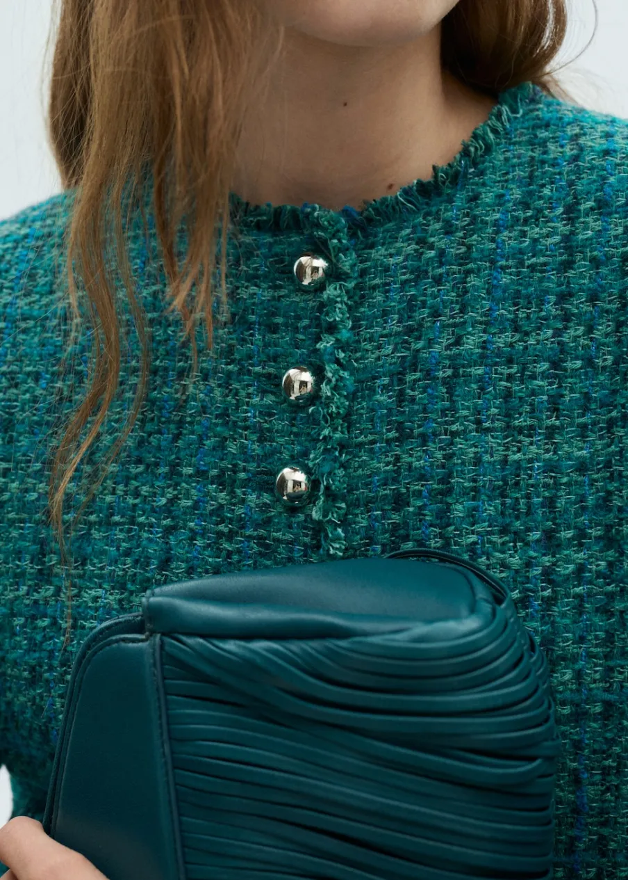 Tkanina tweedowa. Tkanina z mieszanki bawełny i wełny. Model prosty. Okrągły dekolt. Długi rękaw. Dwie kieszenie nakładane z przodu. Zapięcie z przodu na guziki. Biżuteryjne guziki. Postrzępione wykończenia. Wewnętrzna podszewka.