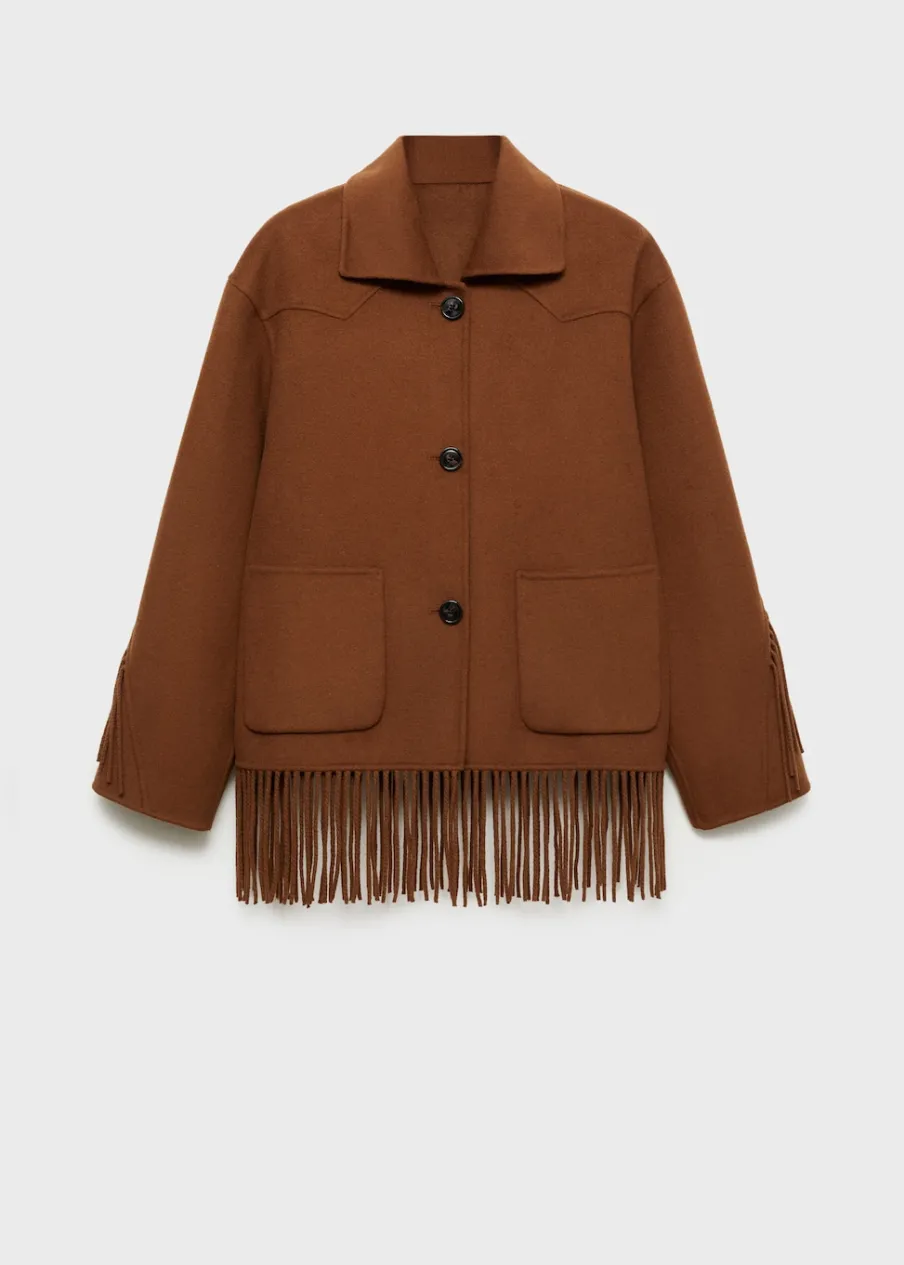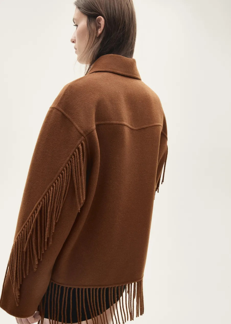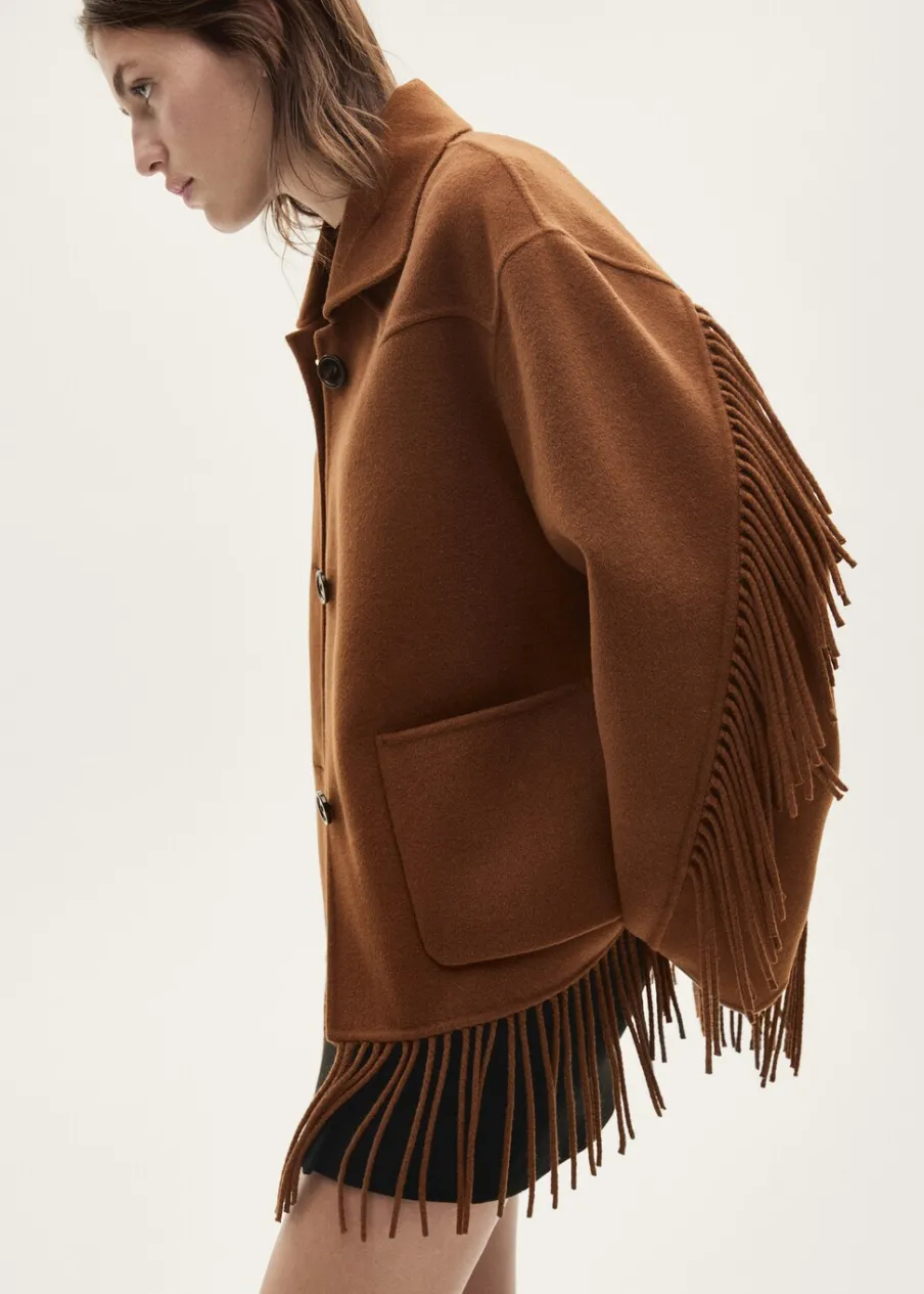 Tkanina mieszanka wełny. Model oversize. Koszulowy kołnierz. Długi rękaw. Frędzlowe wykończenie. Dwie kieszenie nakładane z przodu. Zapięcie z przodu na guziki. Modelka ma 178 cm wzrostu i nosi rozmiar S/36.