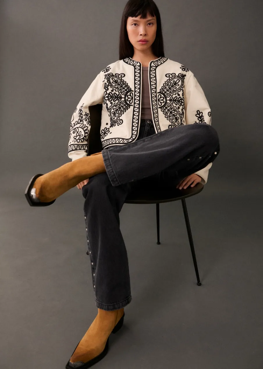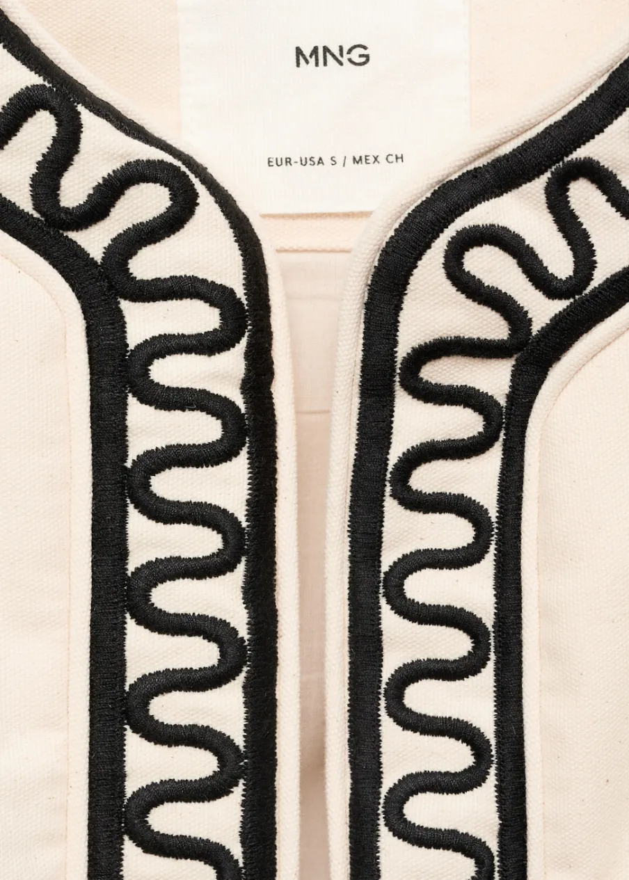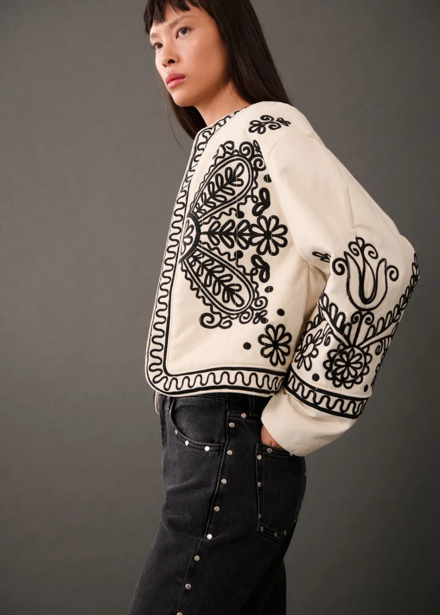Bawełna 100%. Model prosty. Model pikowany. Okrągły dekolt. Długi rękaw. Wewnętrzna podszewka. Ozdobny haft. Modelka ma 177 cm wzrostu i nosi rozmiar S/36.