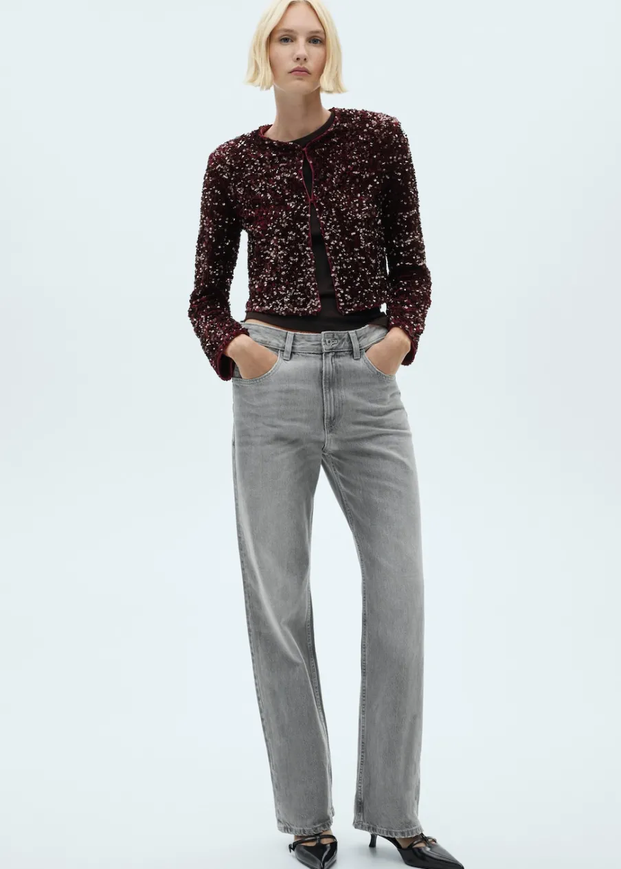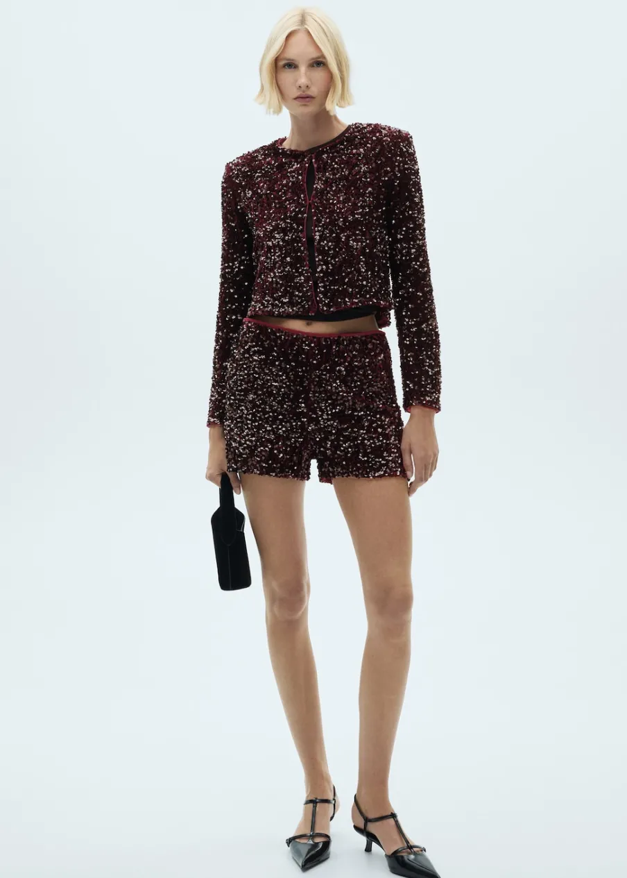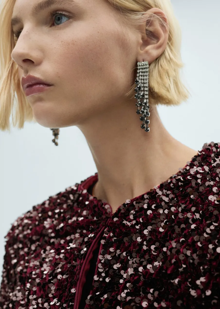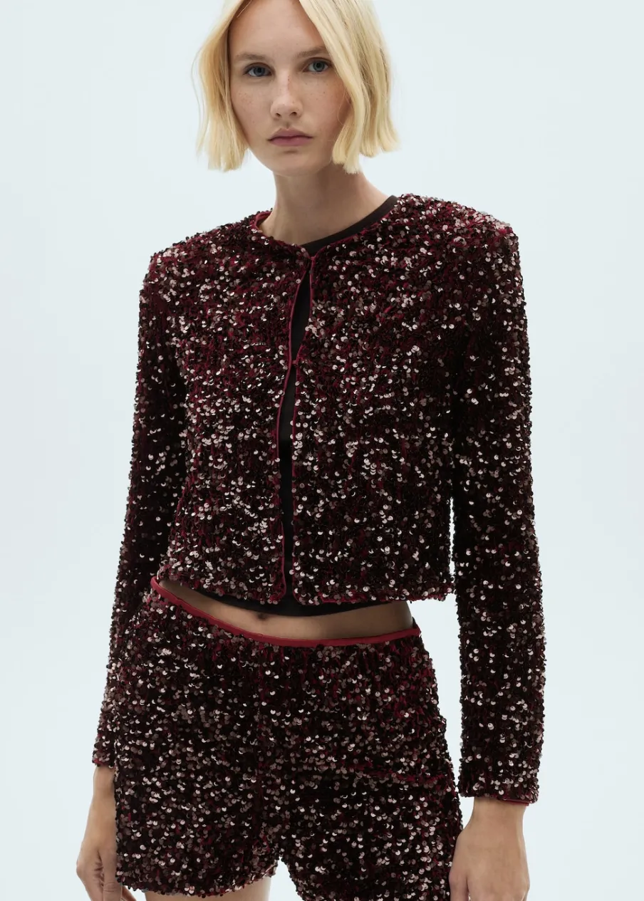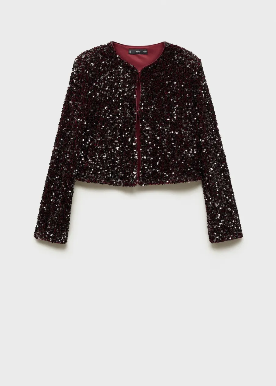 Cekinowa tkanina. Model prosty. Okrągły dekolt. Długi rękaw. Zapięcie z przodu na haftkę. Wewnętrzna podszewka. Total look. Kolekcja wizytowa.