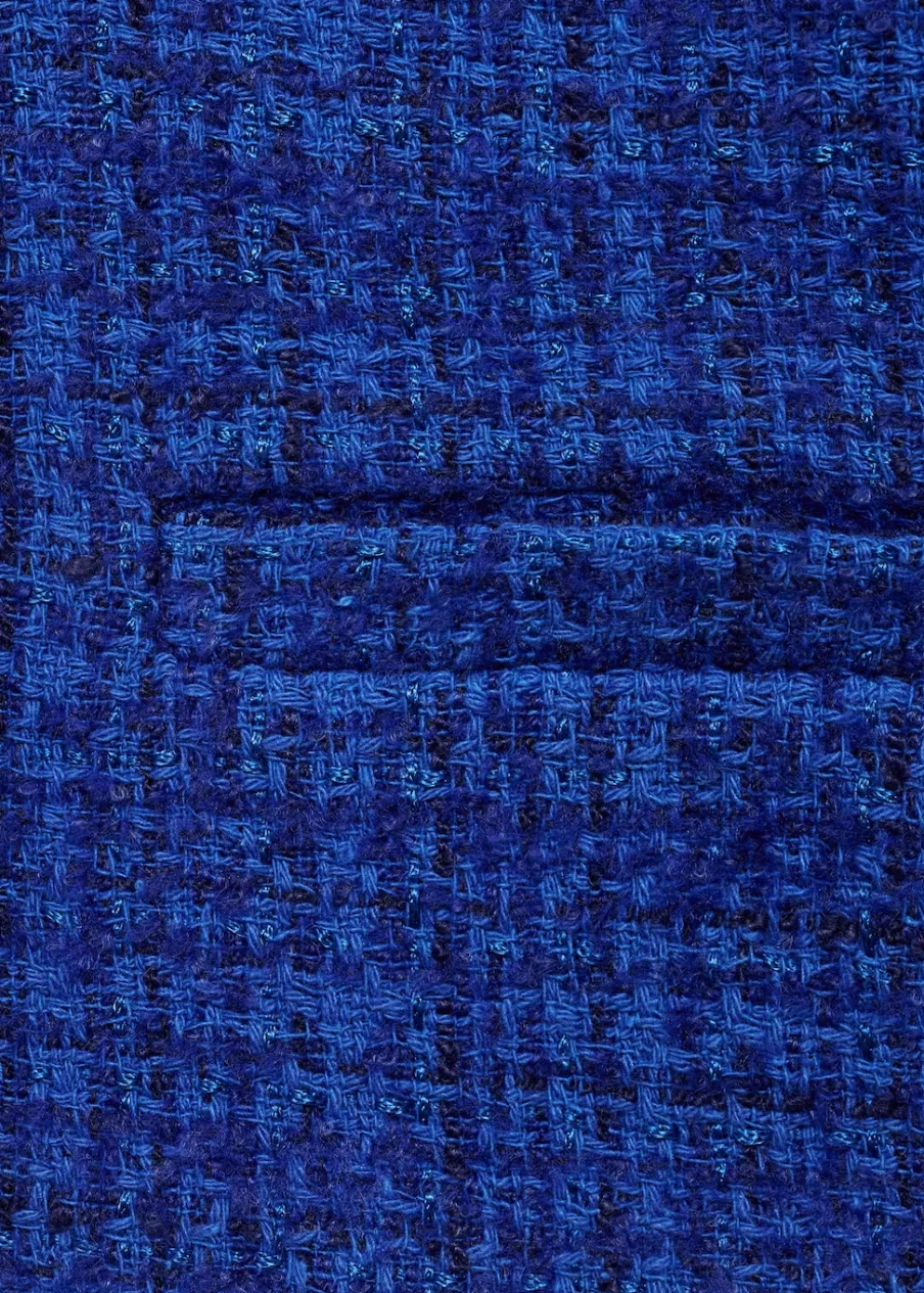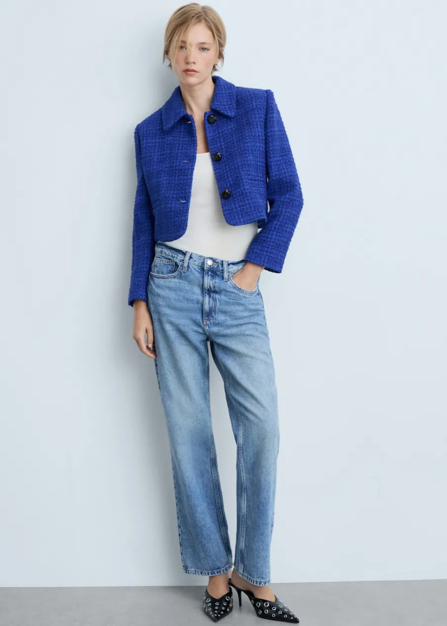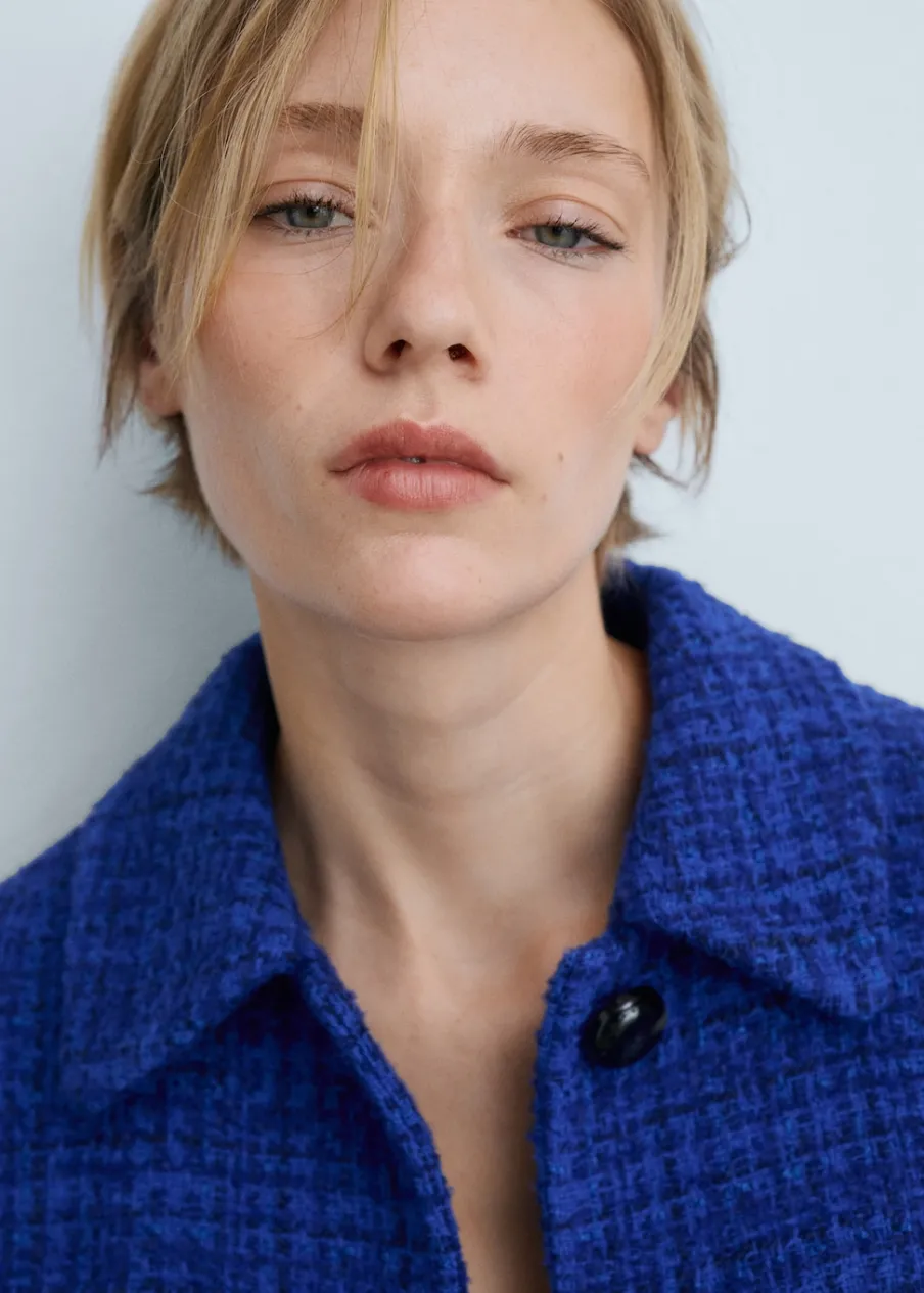 Tkanina mieszanka bawełny. Tkanina tweedowa. Model prosty. Krótki krój. Koszulowy kołnierz. Długi rękaw. Zapięcie z przodu na guziki. Dwie wpuszczene kieszenie z przodu.