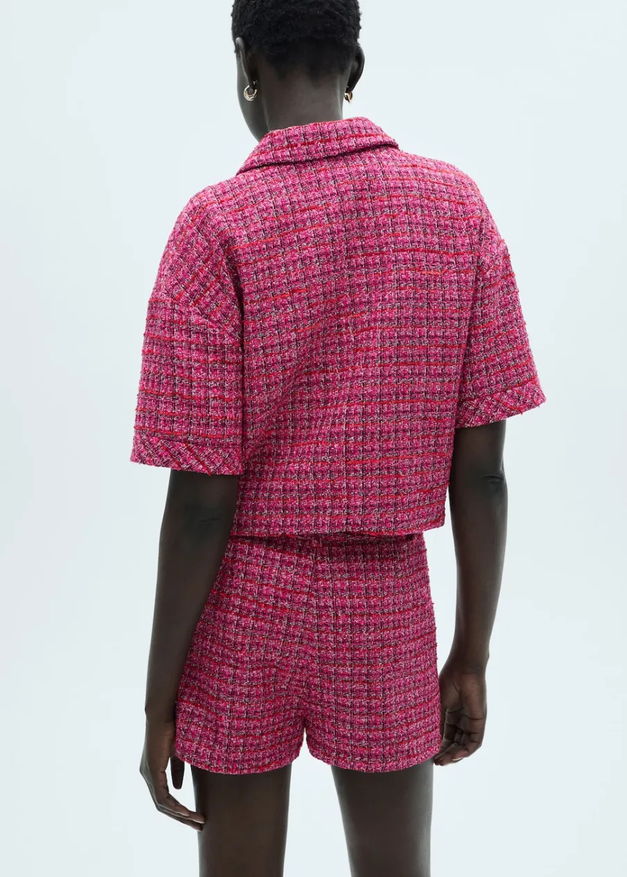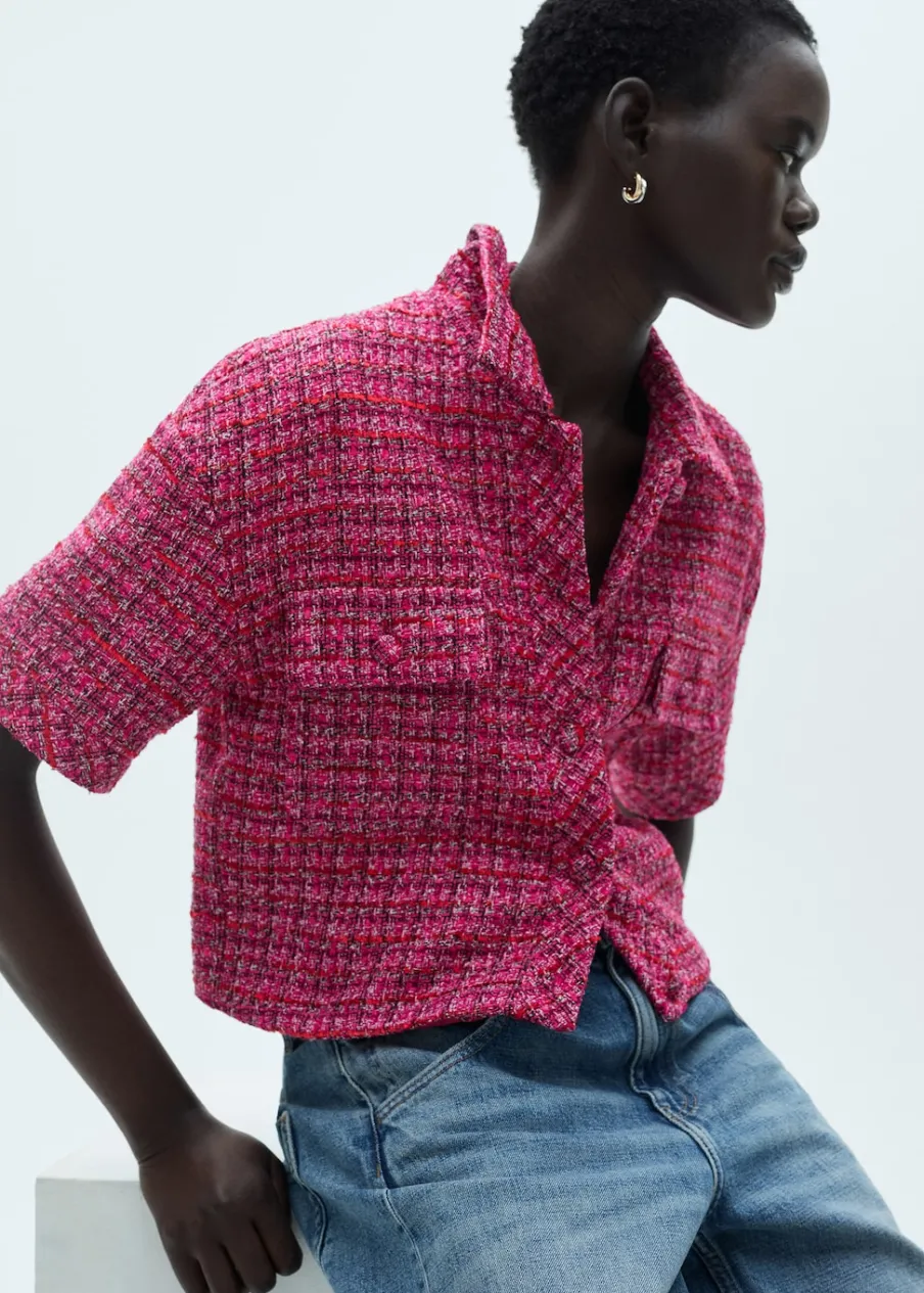 Tkanina tweedowa. Model oversize. Krótki rękaw. Dwie kieszenie z klapą naszyte z przodu. Zapięcie z przodu na guziki. Modelka ma 178 cm wzrostu i nosi rozmiar S/36. Koszulowy kołnierz. Modelka ma 179 cm wzrostu i nosi rozmiar S/36. Total look.