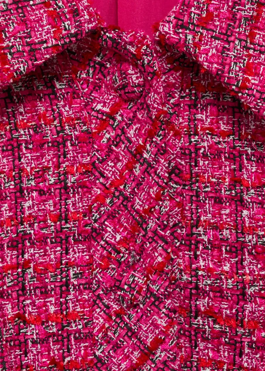 OpisTkanina tweedowa. Model oversize. Krótki rękaw. Dwie kieszenie z klapą naszyte z przodu. Zapięcie z przodu na gu…