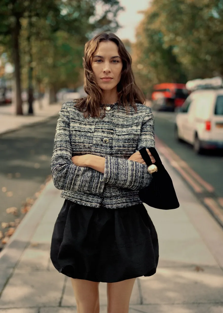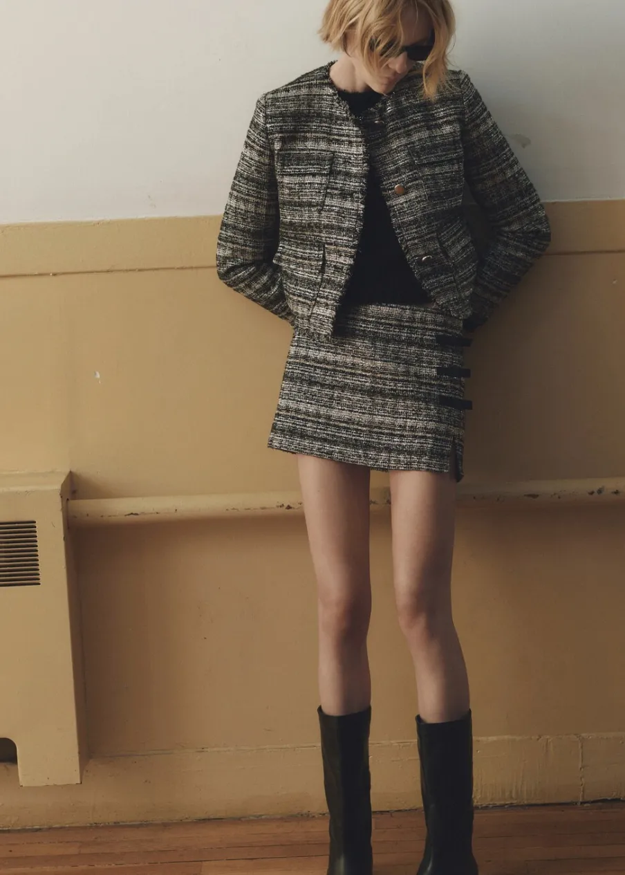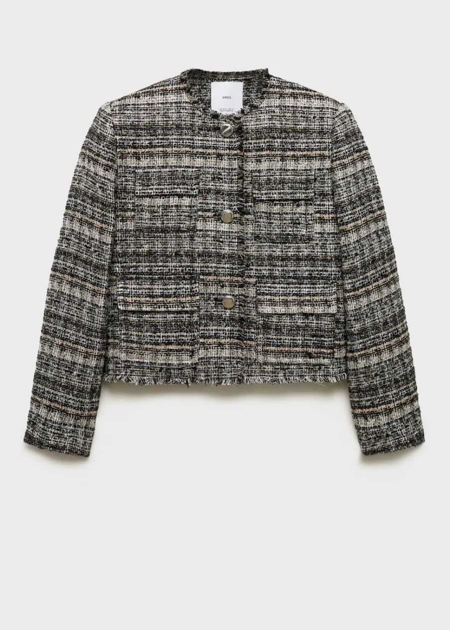 Tkanina tweedowa. Model prosty. Okrągły dekolt. Długi rękaw. Cztery kieszenie z patkami z przodu. Zapięcie z przodu na guziki. Metalowe guziki. Wewnętrzna podszewka. Total look. Modelka ma 178 cm wzrostu i nosi rozmiar S/36.