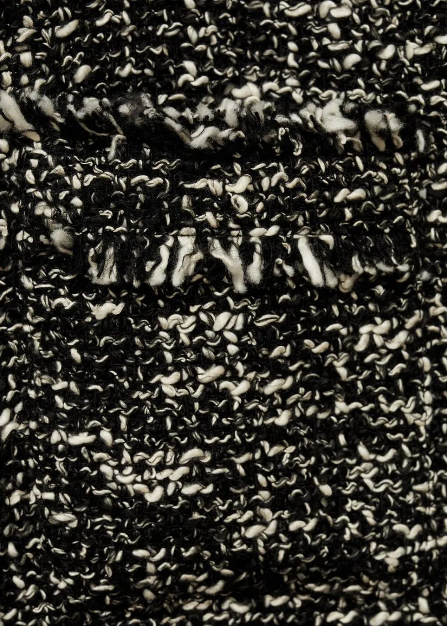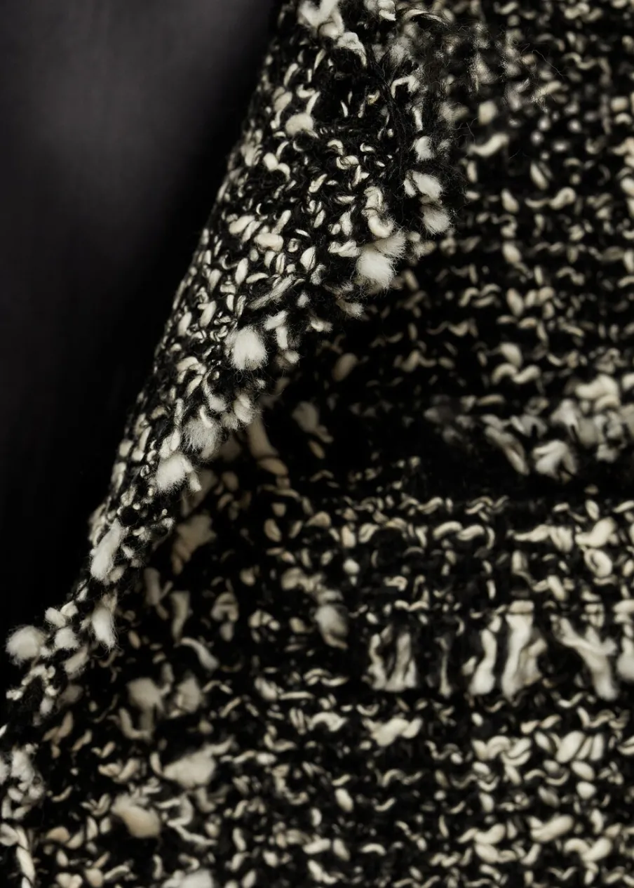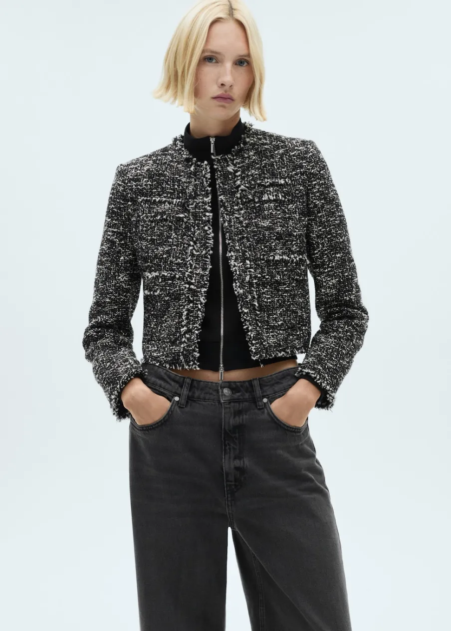 Tkanina mieszanka bawełny. Tkanina tweedowa. Deseń melanżowy. Model prosty. Krótki krój. Okrągły dekolt. Dwie kieszenie z wypustkami z przodu. Postrzępione wykończenia. Total look. Modelka ma 179 cm wzrostu i nosi rozmiar S/36.