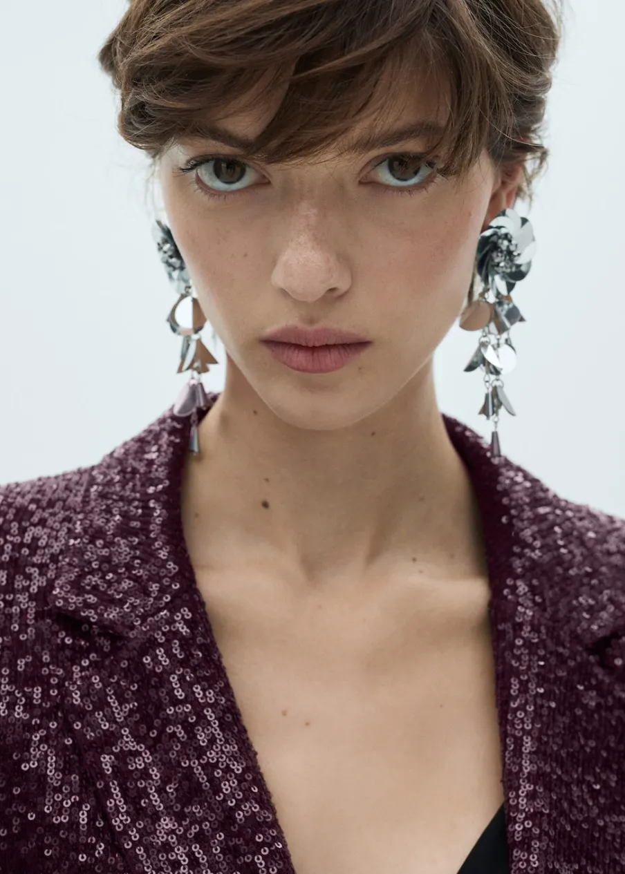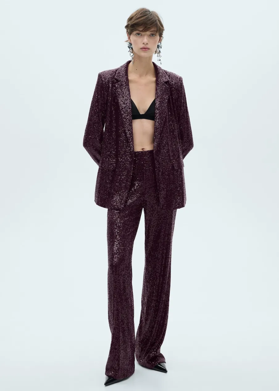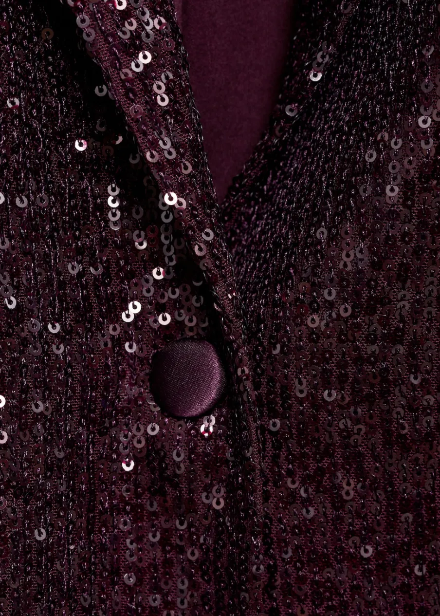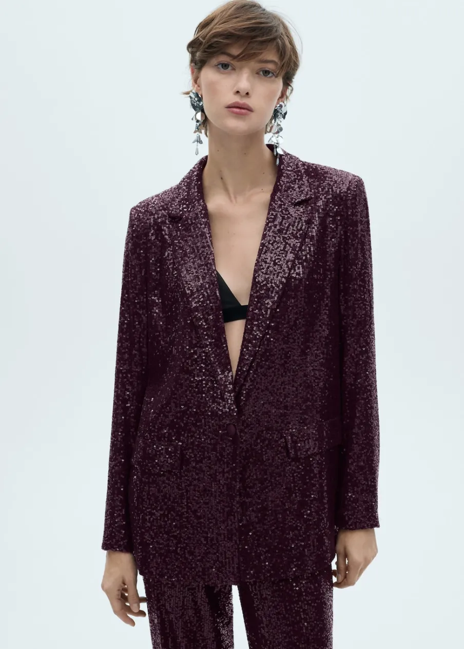 Tkanina z cekinami. Model prosty. Dekolt w szpic z kołnierzykiem. Długi rękaw. Dwie kieszenie z przodu z wypustkami i patką. Zapięcie z przodu na guzik. Total look. Kolekcja wizytowa.