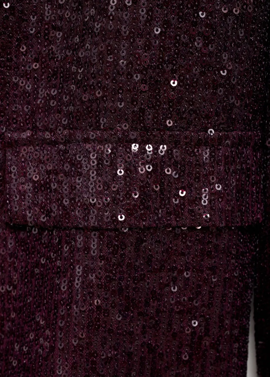 OpisTkanina z cekinami. Model prosty. Dekolt w szpic z kołnierzykiem. Długi rękaw. Dwie kieszenie z przodu z wypustka…