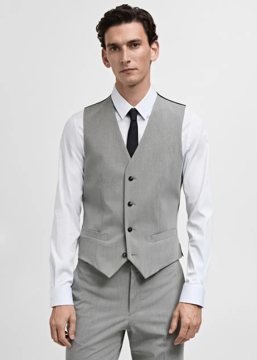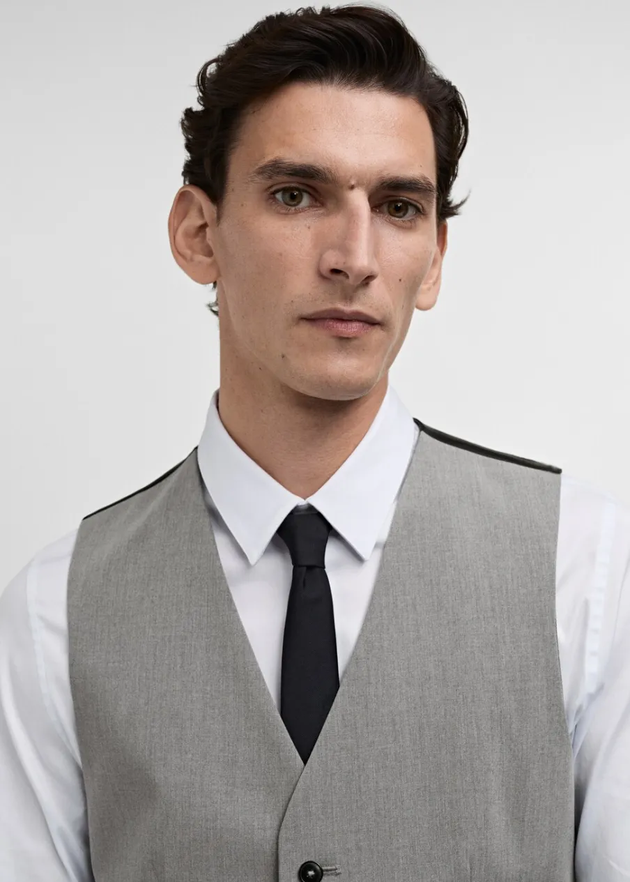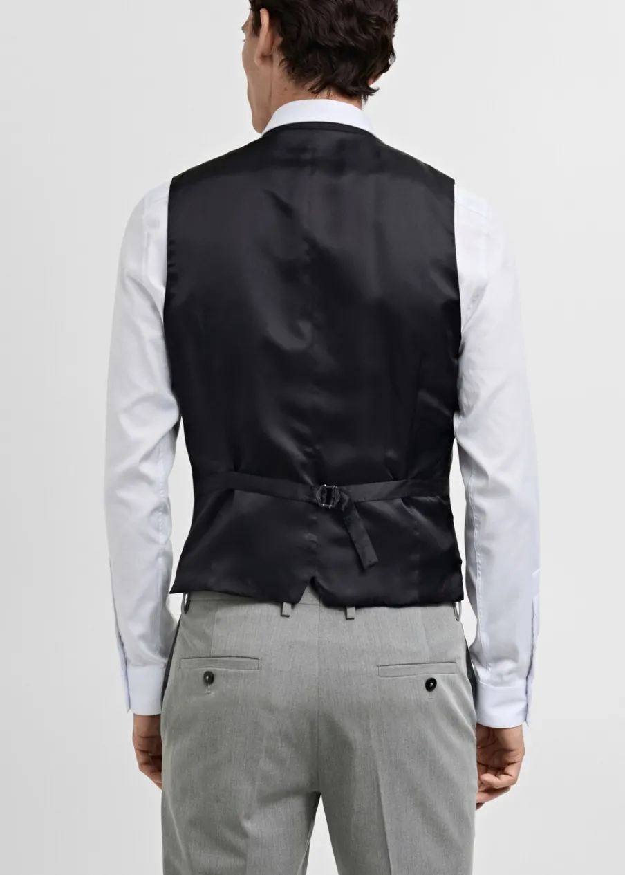 Super slim-fit. Tkanina stretch, która zapewnia maksymalną wygodę i swobodę ruchów. Dekolt V. Zapięcie na guziki z przodu. Dwie kieszenie z wypustkami z przodu. Bez rękawów. Regulacja na klamerkę z tyłu. Wewnętrzna podszewka. Wewnętrzna kieszeń. Model ma 190 cm wzrostu i nosi rozmiar 50.