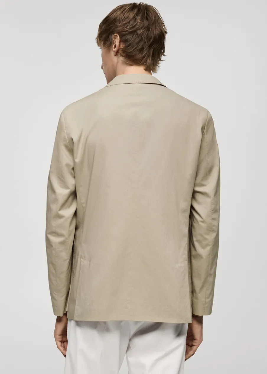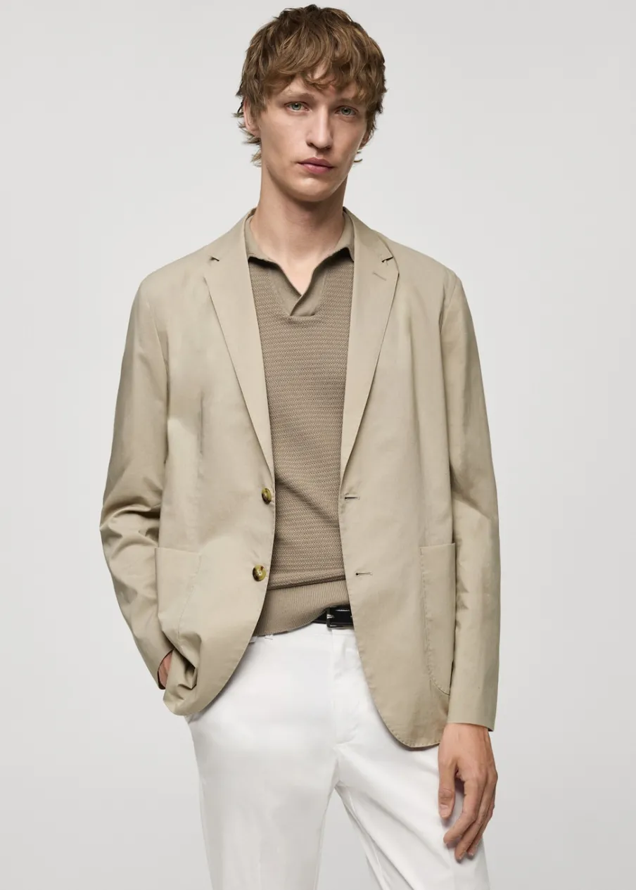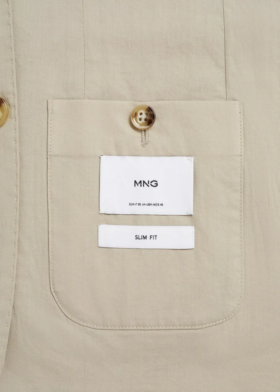 Cienka tkanina. Slim-fit. Klapy otwarte z butonierką. Długi rękaw z guzikami na mankietach. Dwie kieszenie nakładane z przodu. Wewnętrzna podszewka. Prosty dół. Naszywana kieszeń z guzikiem po wewnętrznej stronie. Dwie szlice z tyłu. Model ma 190 cm wzrostu i nosi rozmiar 50. Tkanina z 100% bawełny. Zapięcie na guziki z przodu.