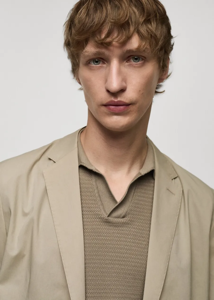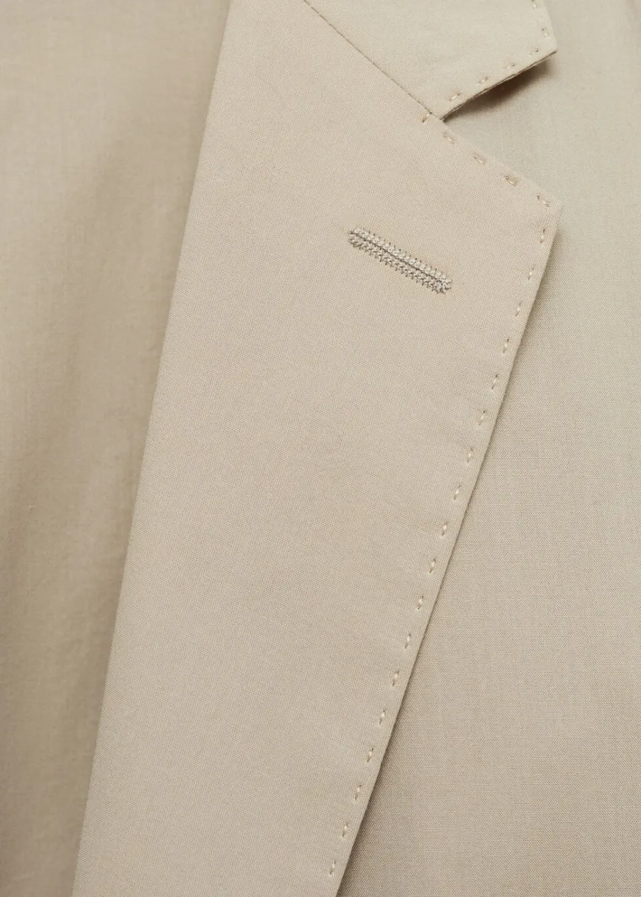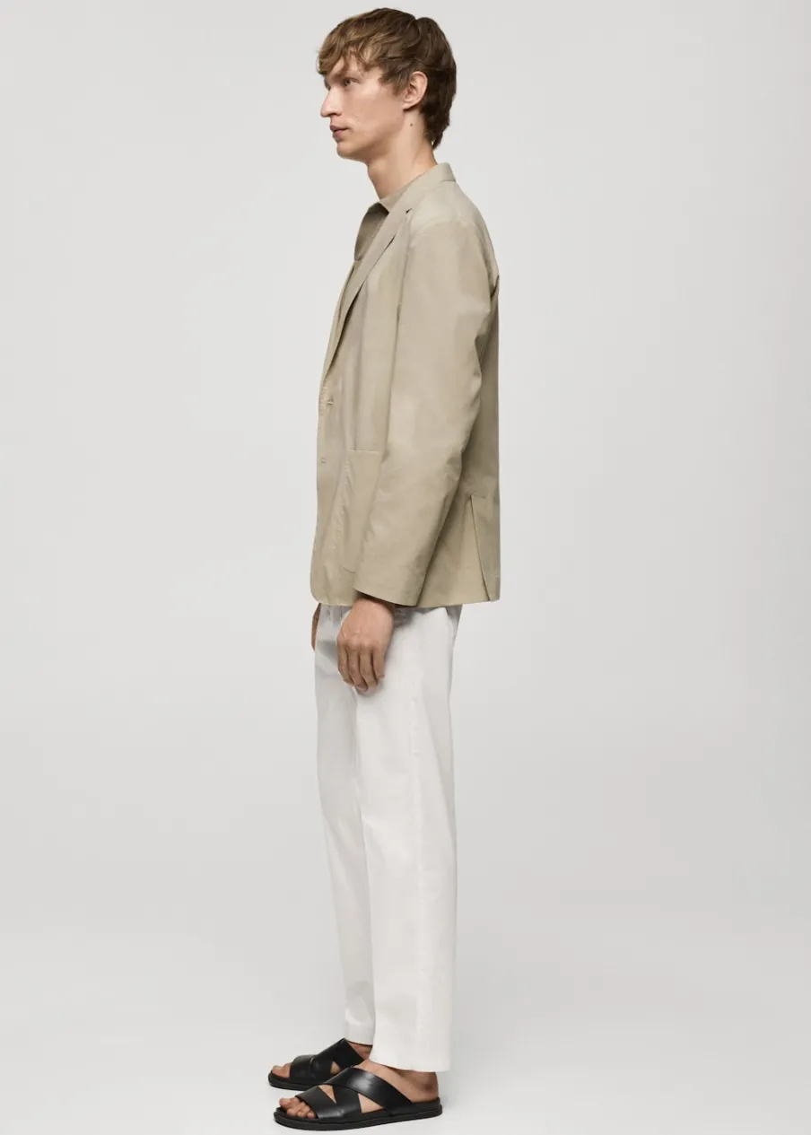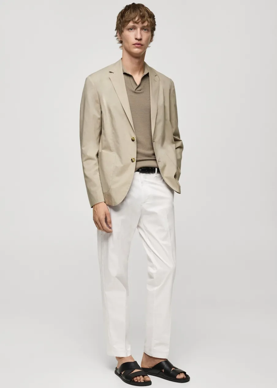 Cienka tkanina. Slim-fit. Klapy otwarte z butonierką. Długi rękaw z guzikami na mankietach. Dwie kieszenie nakładane z przodu. Wewnętrzna podszewka. Prosty dół. Naszywana kieszeń z guzikiem po wewnętrznej stronie. Dwie szlice z tyłu. Model ma 190 cm wzrostu i nosi rozmiar 50. Tkanina z 100% bawełny. Zapięcie na guziki z przodu.