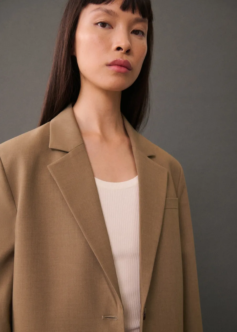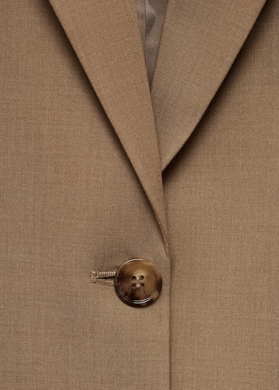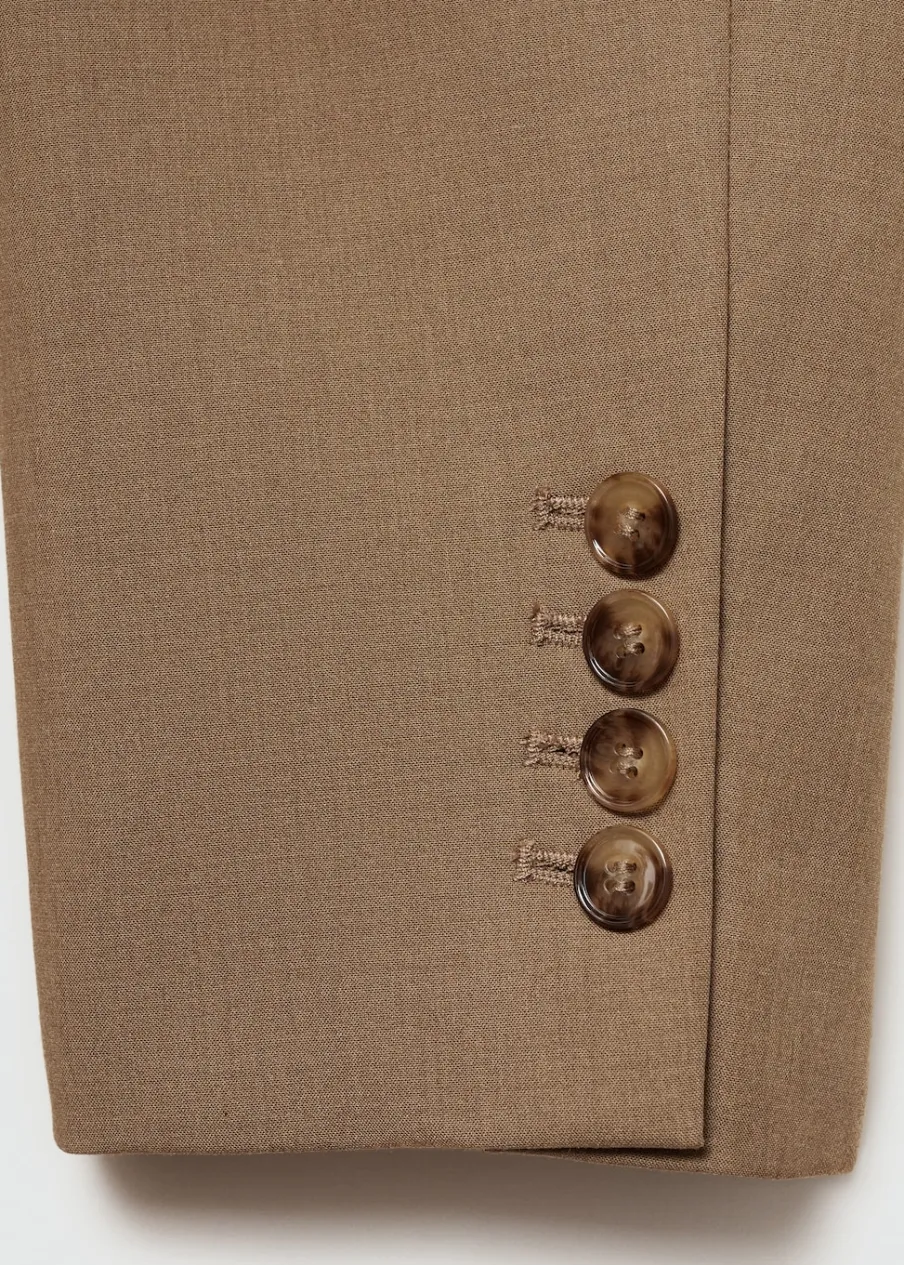 OpisModel prosty. Dekolt w szpic z kołnierzykiem. Klapy z nacięciem. Długi rękaw z guzikami na mankietach. Dwie kies…