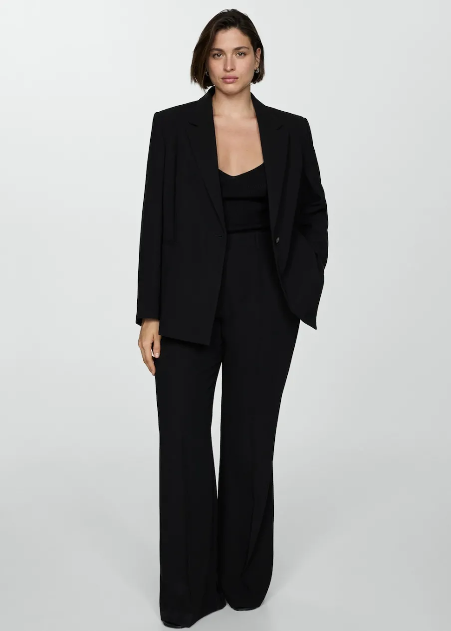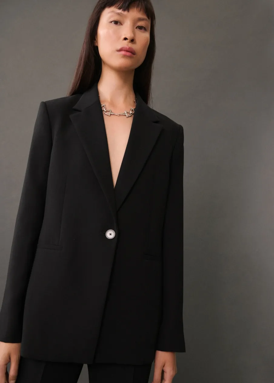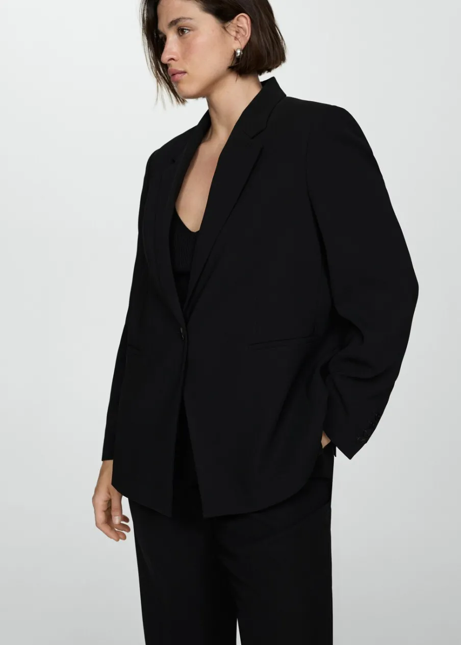 Model prosty. Dekolt w szpic z kołnierzykiem. Klapy z nacięciem. Długi rękaw z guzikami na mankietach. Dwie kieszenie z przodu z wypustkami i patką. Zapięcie na dwa guziki z przodu. Total look. Wewnętrzna podszewka. Stylizacje biurowe. Dostępne w Plus Size.