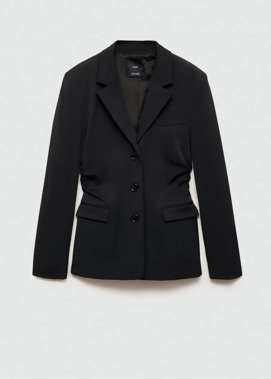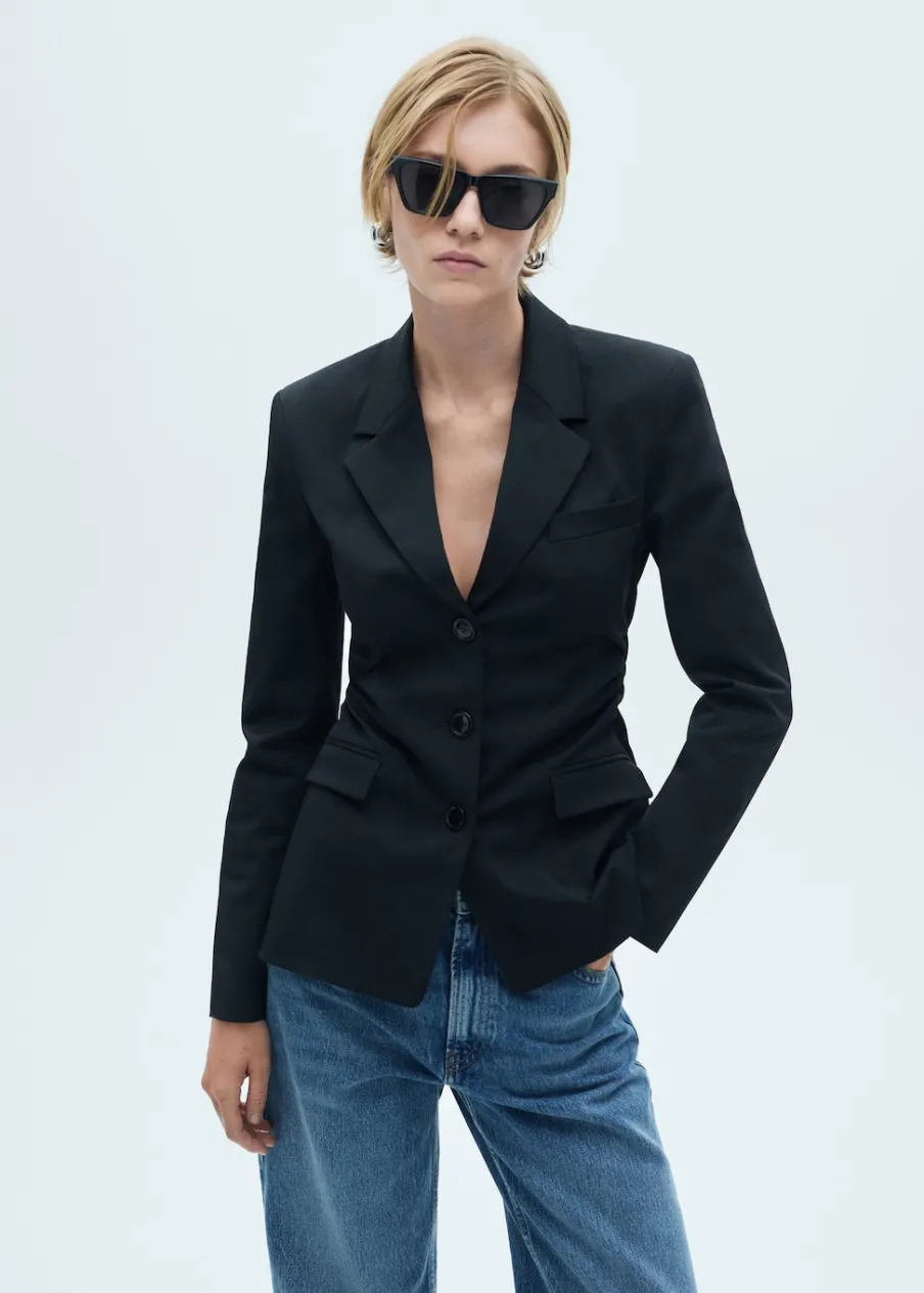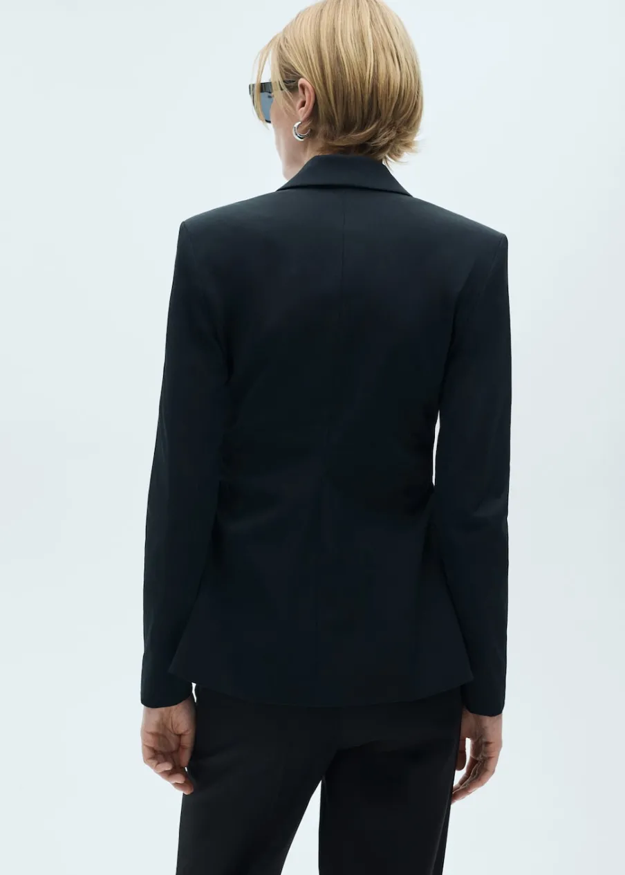 Model prosty. Model wcięty. Fason garniturowy. Dekolt w szpic z kołnierzykiem. Klapy z nacięciem. Długi rękaw. Dwie kieszenie z przodu z wypustkami i patką. Kieszeń wpuszczana na piersi. Zapięcie na guziki z przodu. Marszczona tekstura. Total look. Wewnętrzna podszewka. Modelka ma 181 cm wzrostu i nosi rozmiar S/36.