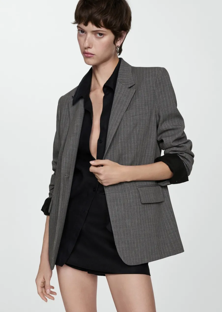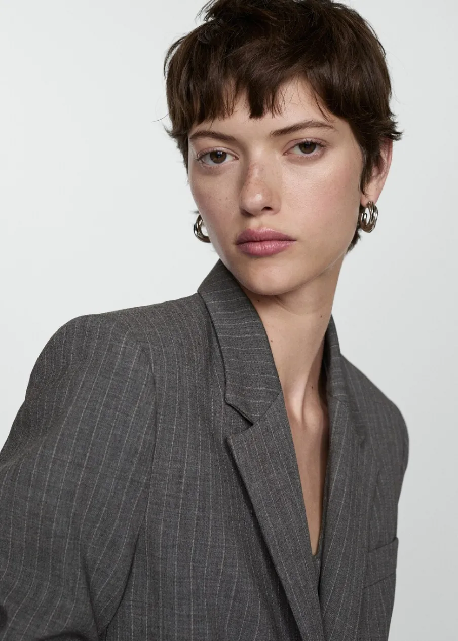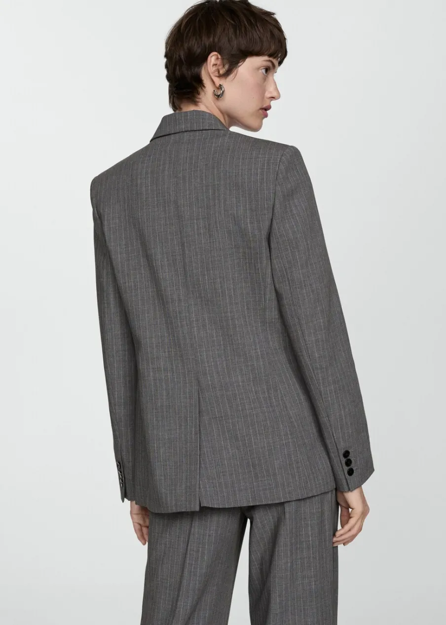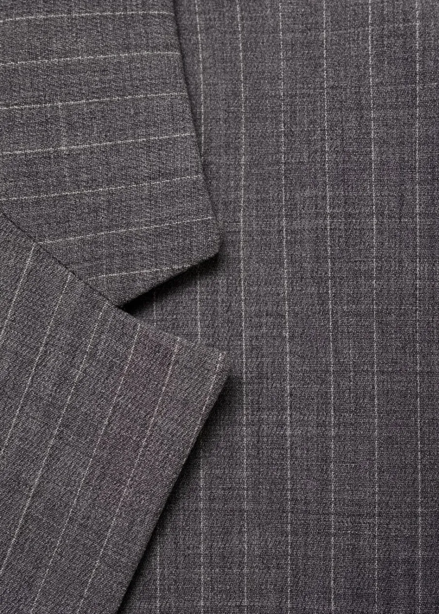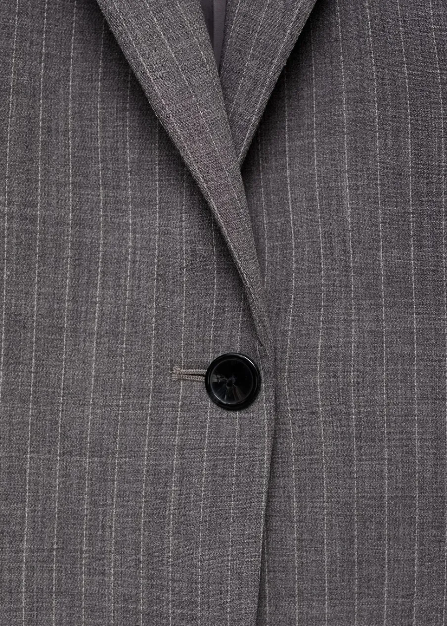 Model prosty. Deseń w prążki. Dekolt w szpic z kołnierzykiem. Kieszeń wpuszczana z ozdobną patką. Zapięcie z przodu na guzik. Wewnętrzna podszewka. Total look. Długi rękaw z zapięciem na guziki.