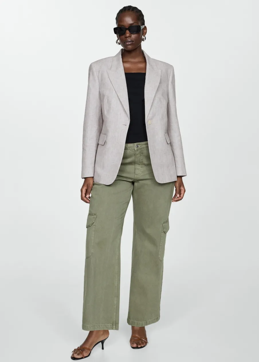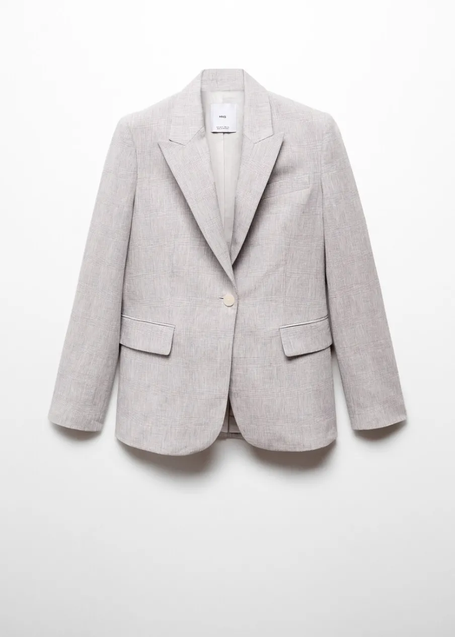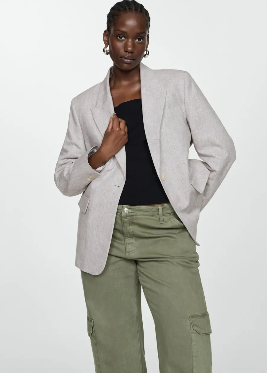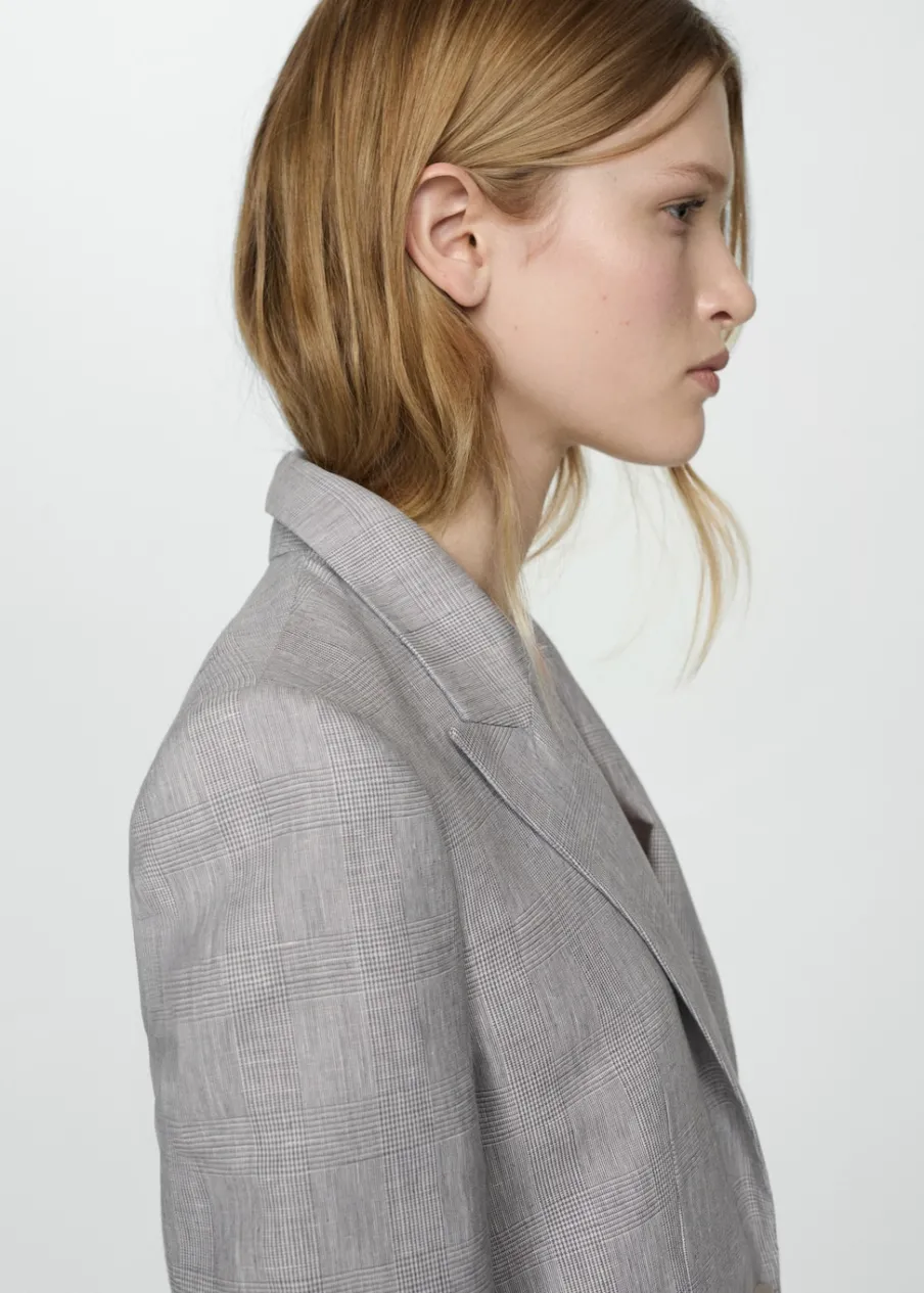 Tkanina mieszanka bawełny i lnu. Model prosty. Wzór w kurzą stopkę. Dekolt w szpic z kołnierzykiem. Klapy z nacięciem. Długi rękaw. Dwie kieszenie z przodu z wypustkami i patką. Zapięcie z przodu na guzik. Wewnętrzna podszewka. Dostępne w Plus Size.