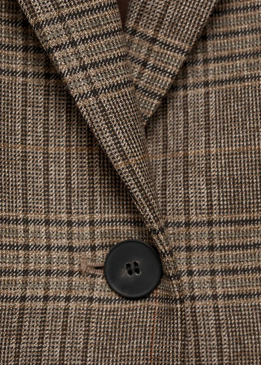 OpisDeseń w kratę. Model prosty. Dekolt w szpic z kołnierzykiem. Długi rękaw z zapięciem na guziki. Dwie kieszenie…