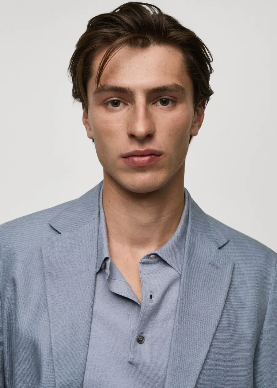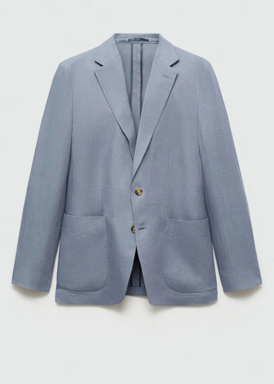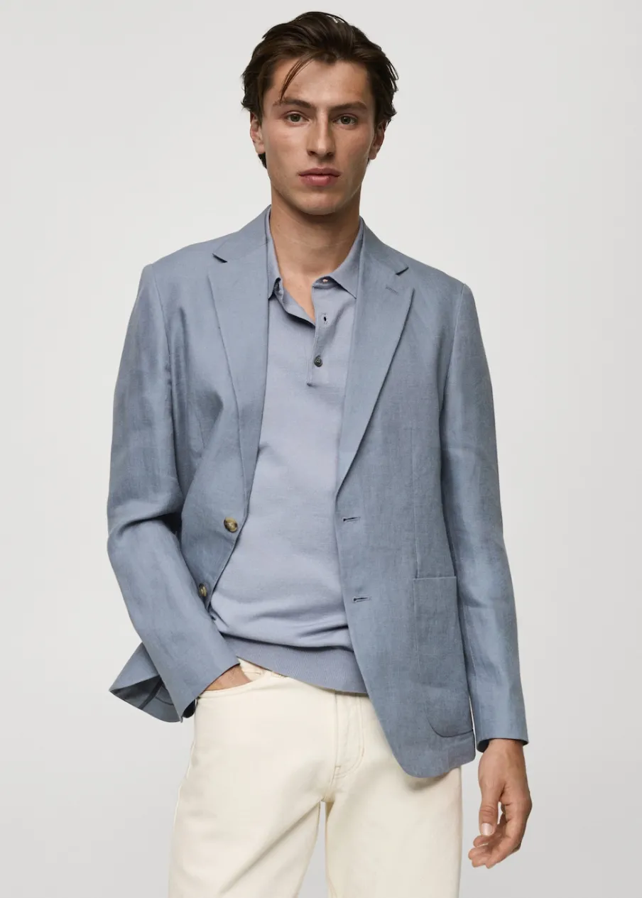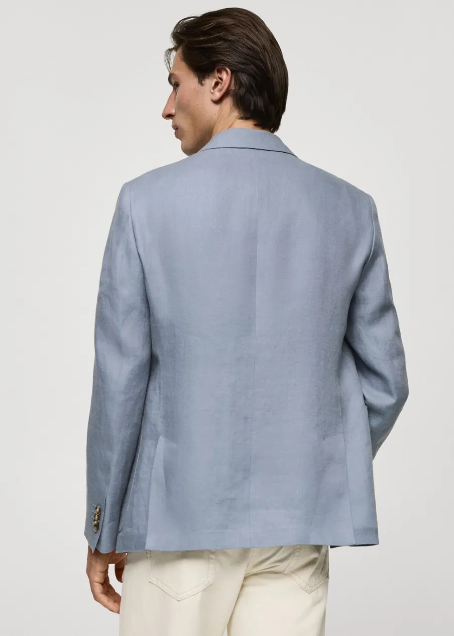 Slim-fit. Tkanina z 100% lnu. Kołnierz z klapami. Zapięcie na dwa guziki z przodu. Dwie kieszenie nakładane z przodu. Długi rękaw z guzikami na mankietach. Bez podszewki. Model ma 187 cm wzrostu i nosi rozmiar 50. Naszywana kieszeń z guzikiem po wewnętrznej stronie. Kieszeń z wypustkami po wewnętrznej stronie. Dwie szlice z tyłu.