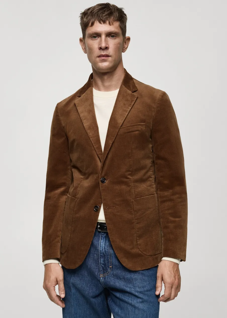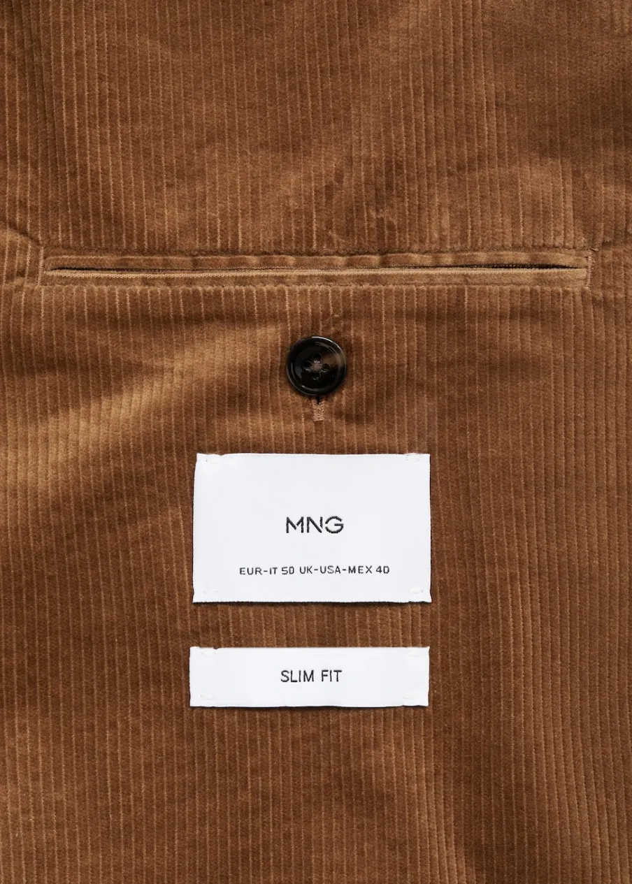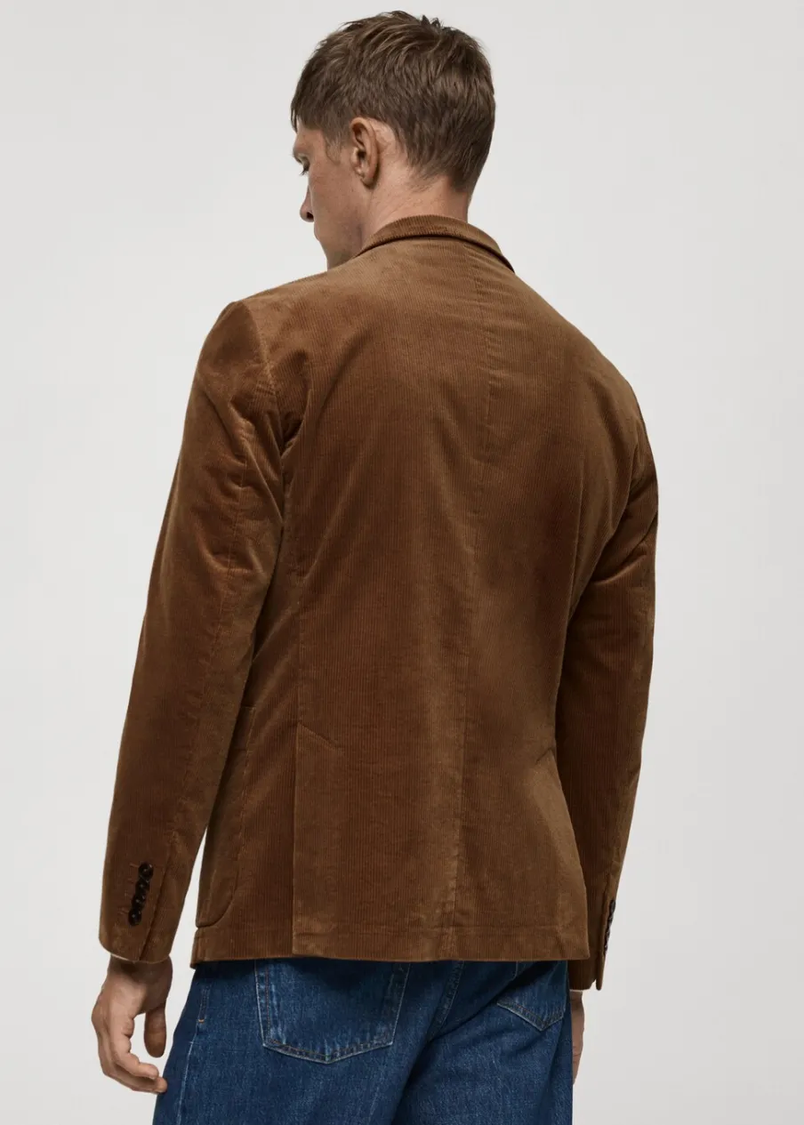 Slim-fit. Sztruksowa tkanina. Podwójne rozcięcie z tyłu. Dwie kieszenie nakładane po bokach. Kieszeń wpuszczana na piersi. Zapięcie na guziki. Model ma 190 cm wzrostu i nosi rozmiar M. Klapy otwarte. Długi rękaw z zapięciem na guziki.