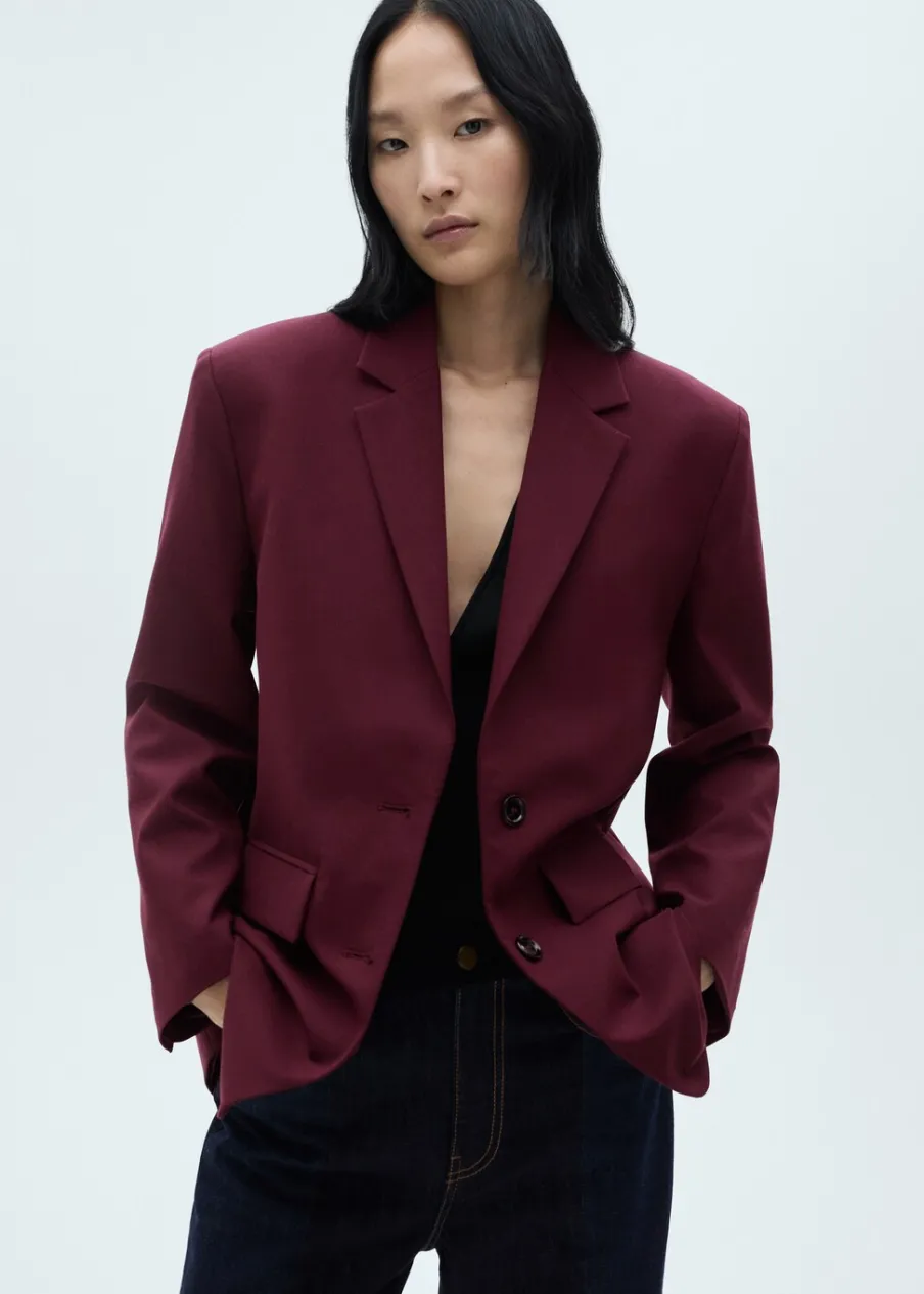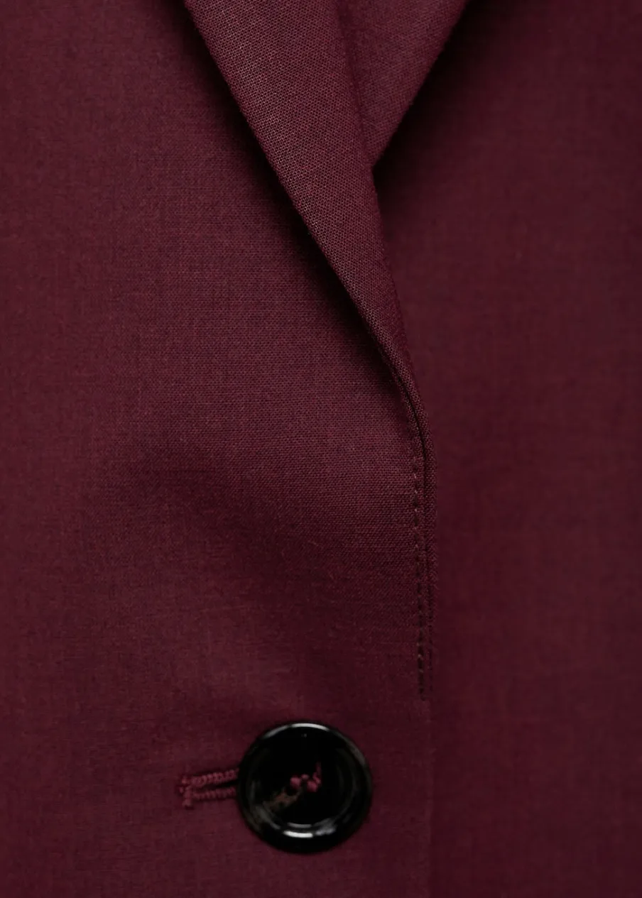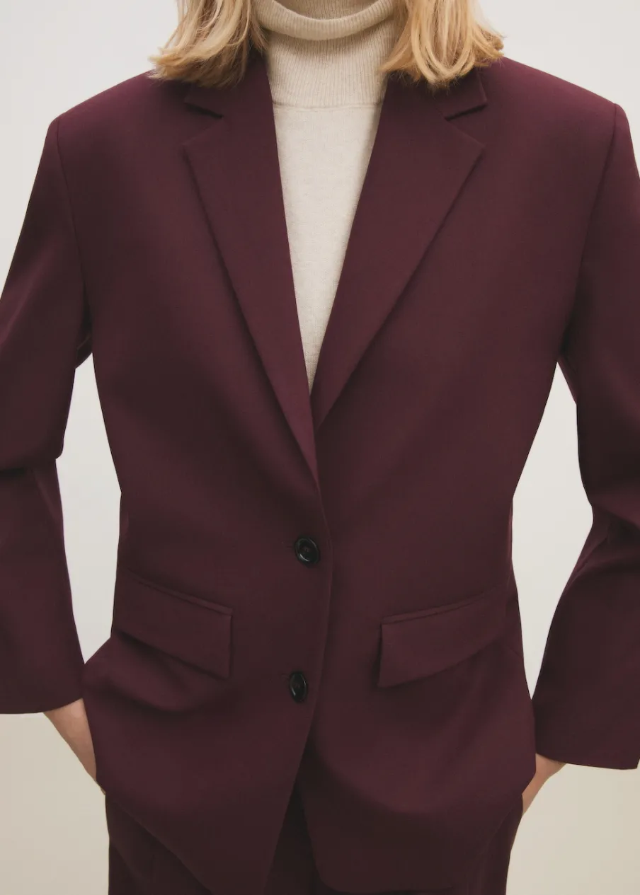 Tkanina z wełną. Model prosty. Dekolt w szpic z kołnierzykiem. Długi, zapinany rękaw. Detal z rozcięciem z tyłu. Zapięcie z przodu na guziki. Total look. Dwie wpuszczene kieszenie z przodu. Długi rękaw z zapięciem na guziki.