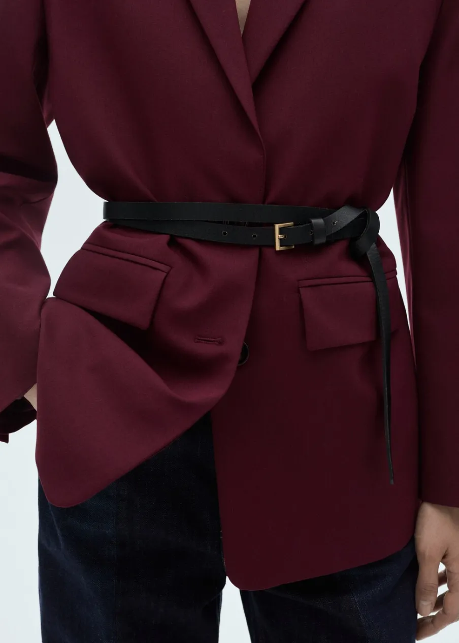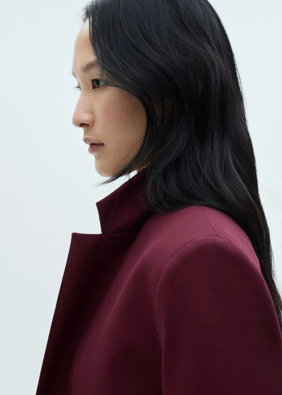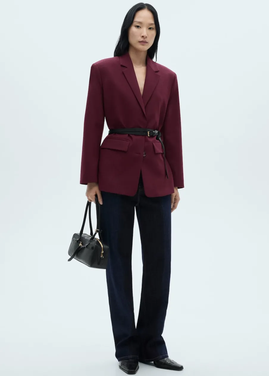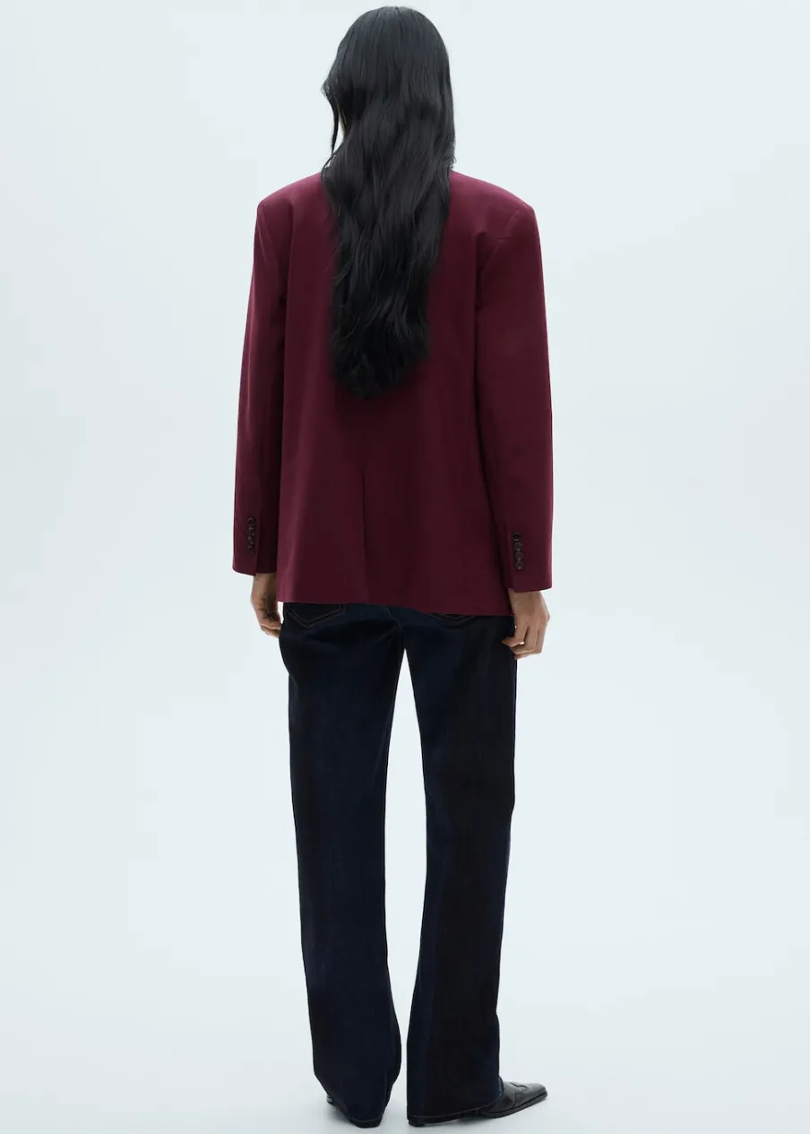 Tkanina z wełną. Model prosty. Dekolt w szpic z kołnierzykiem. Długi, zapinany rękaw. Detal z rozcięciem z tyłu. Zapięcie z przodu na guziki. Total look. Dwie wpuszczene kieszenie z przodu. Długi rękaw z zapięciem na guziki.