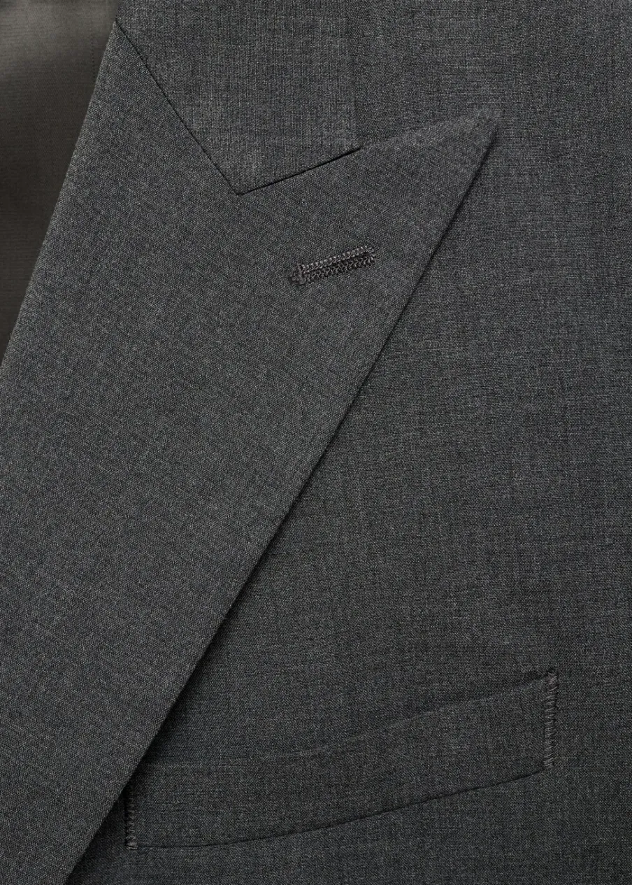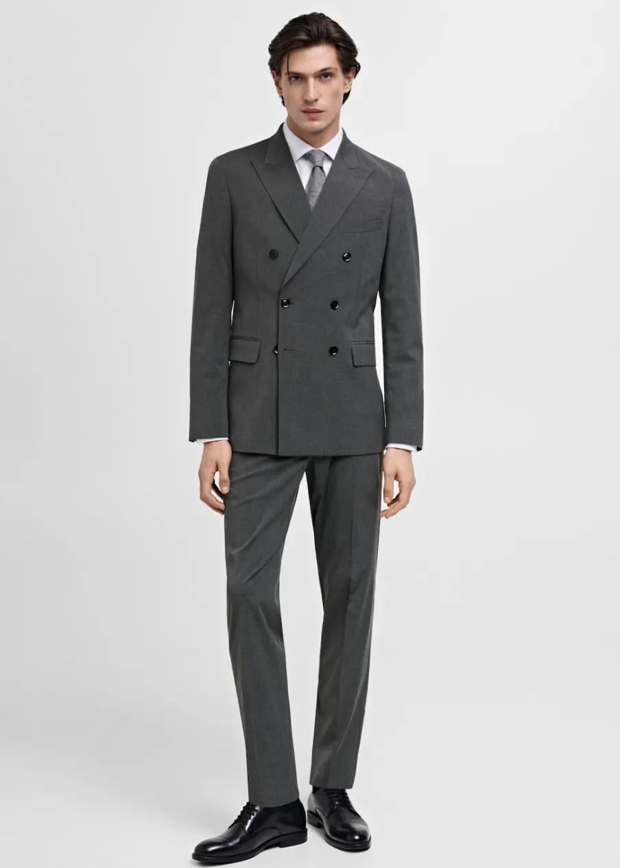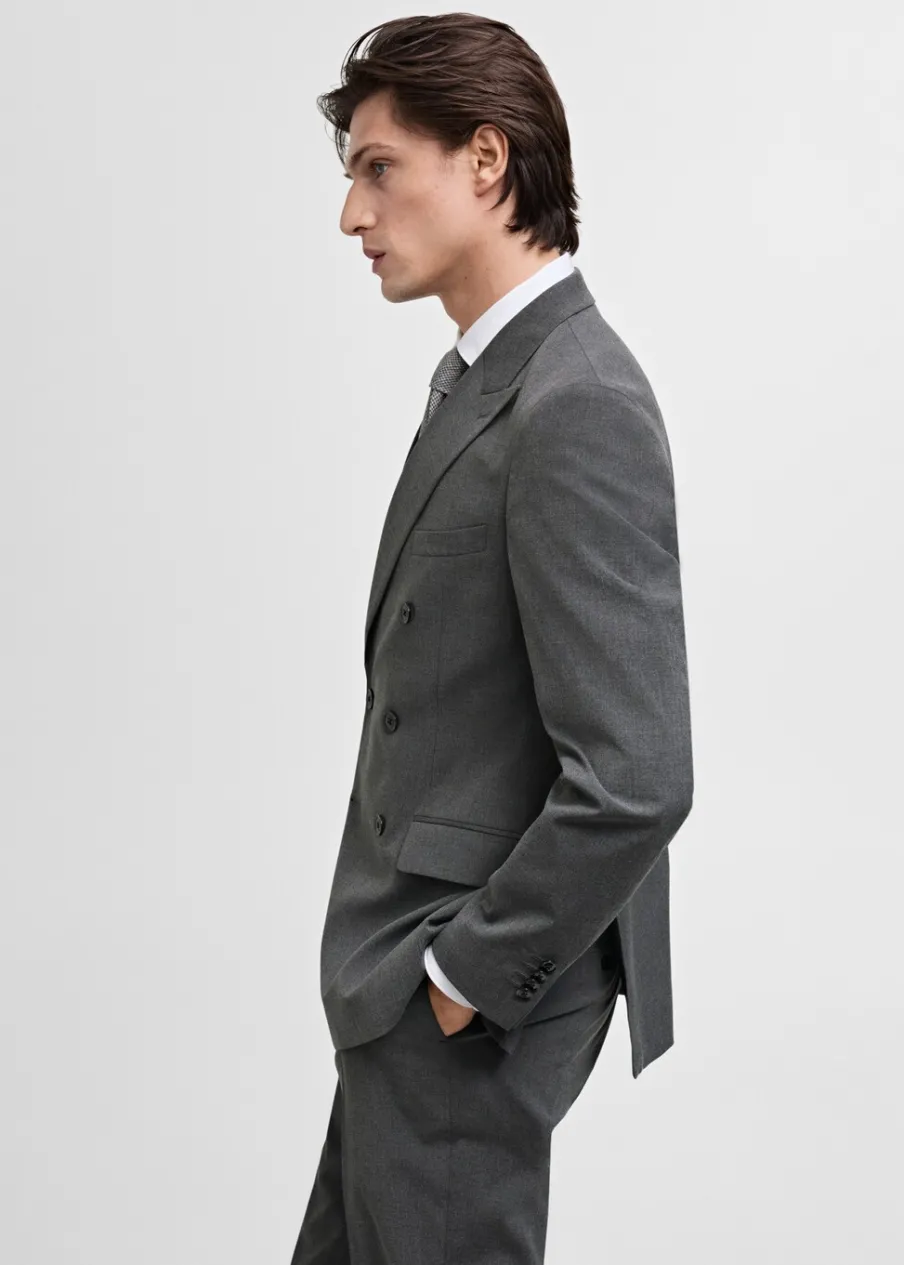 Slim-fit. Klapy zamknięte. Dwurzędowe zapięcie na guziki z przodu. Kieszeń wpuszczana na piersi. Dwie wpuszczane kieszenie z patkami z przodu. Długi rękaw z guzikami na mankietach. Dwie szlice z tyłu. Prosty dół. Wewnętrzna podszewka. Wewnętrzna kieszeń. Model ma 190 cm wzrostu i nosi rozmiar 50.