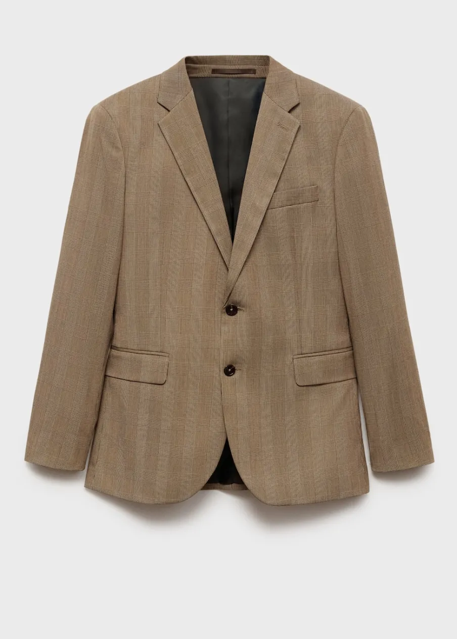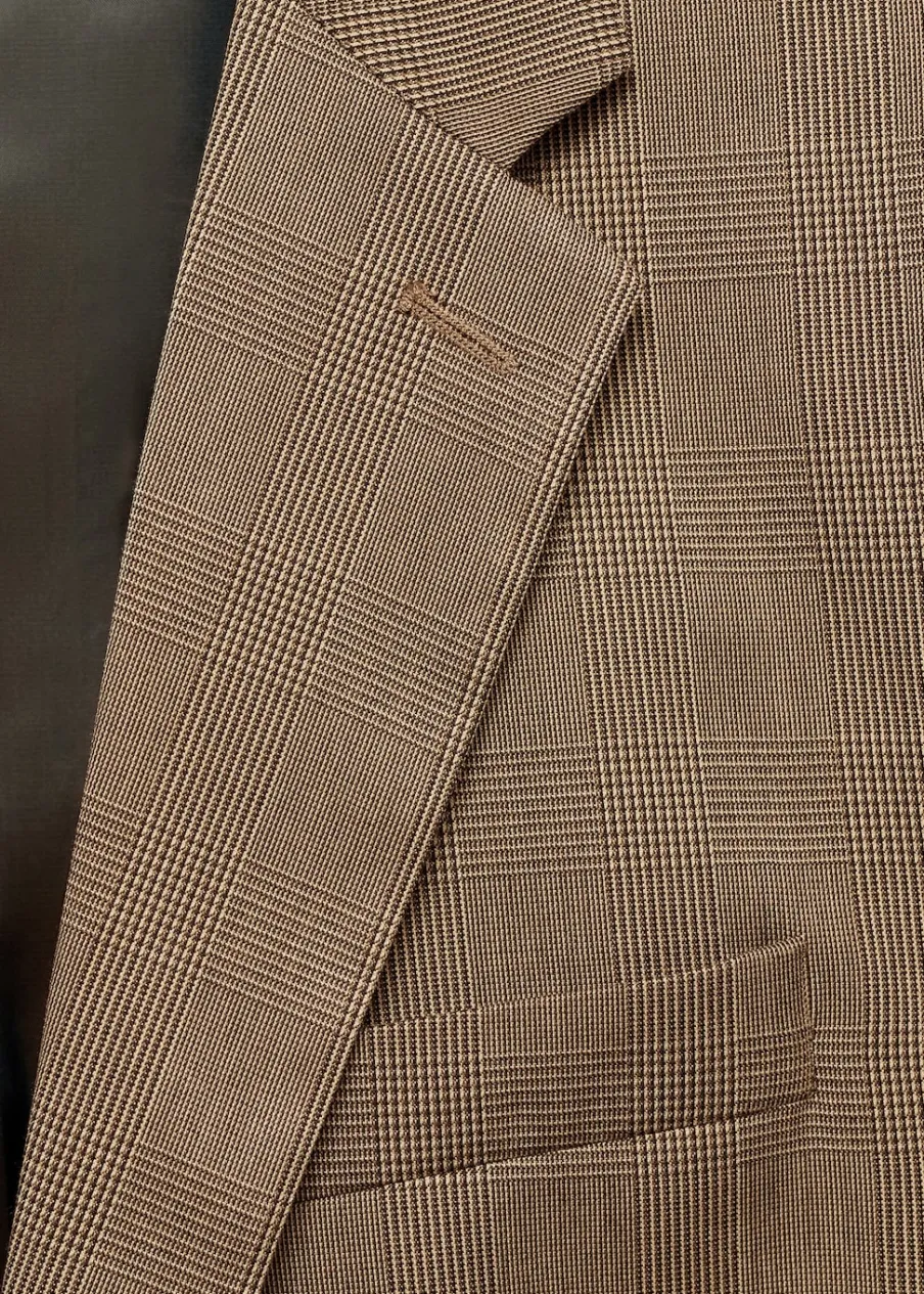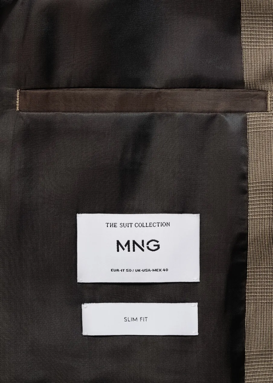 Slim Fit. Wzór w kratę księcia Walii. Kołnierz z klapami. Dwurzędowe zapięcie. Dwie kieszenie z patkami z przodu. Kieszeń wpuszczana na piersi. Wewnętrzna kieszeń. Rozcięcie z tyłu. Wewnętrzna podszewka. Model ma 185 cm wzrostu i nosi rozmiar 50.