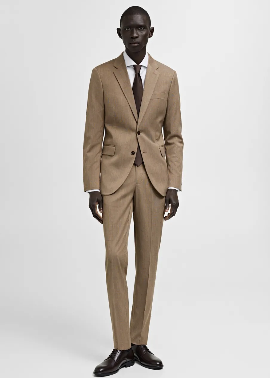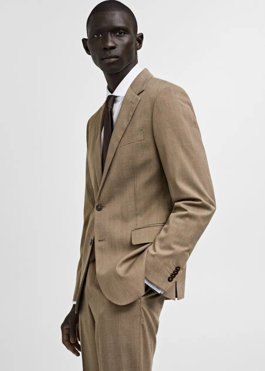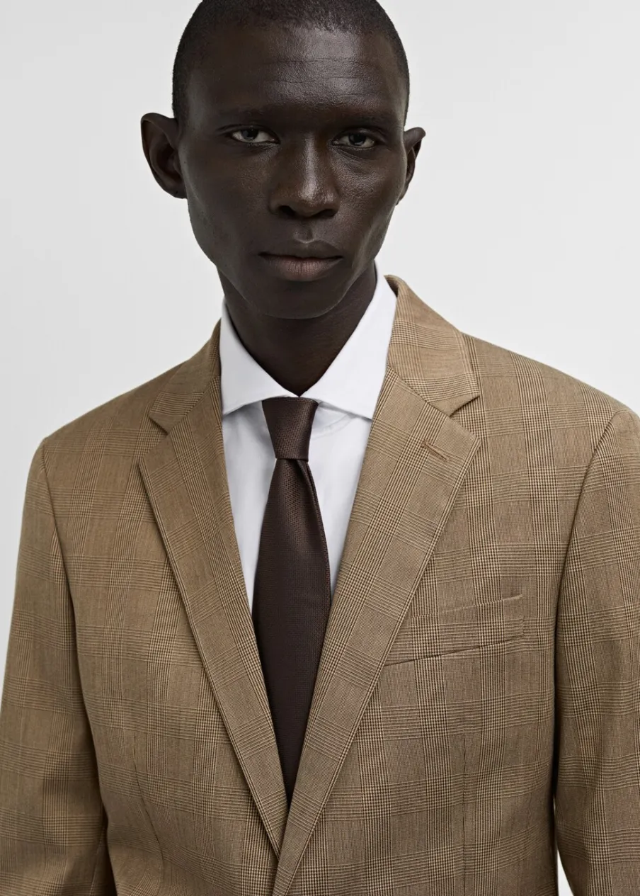 Slim Fit. Wzór w kratę księcia Walii. Kołnierz z klapami. Dwurzędowe zapięcie. Dwie kieszenie z patkami z przodu. Kieszeń wpuszczana na piersi. Wewnętrzna kieszeń. Rozcięcie z tyłu. Wewnętrzna podszewka. Model ma 185 cm wzrostu i nosi rozmiar 50.