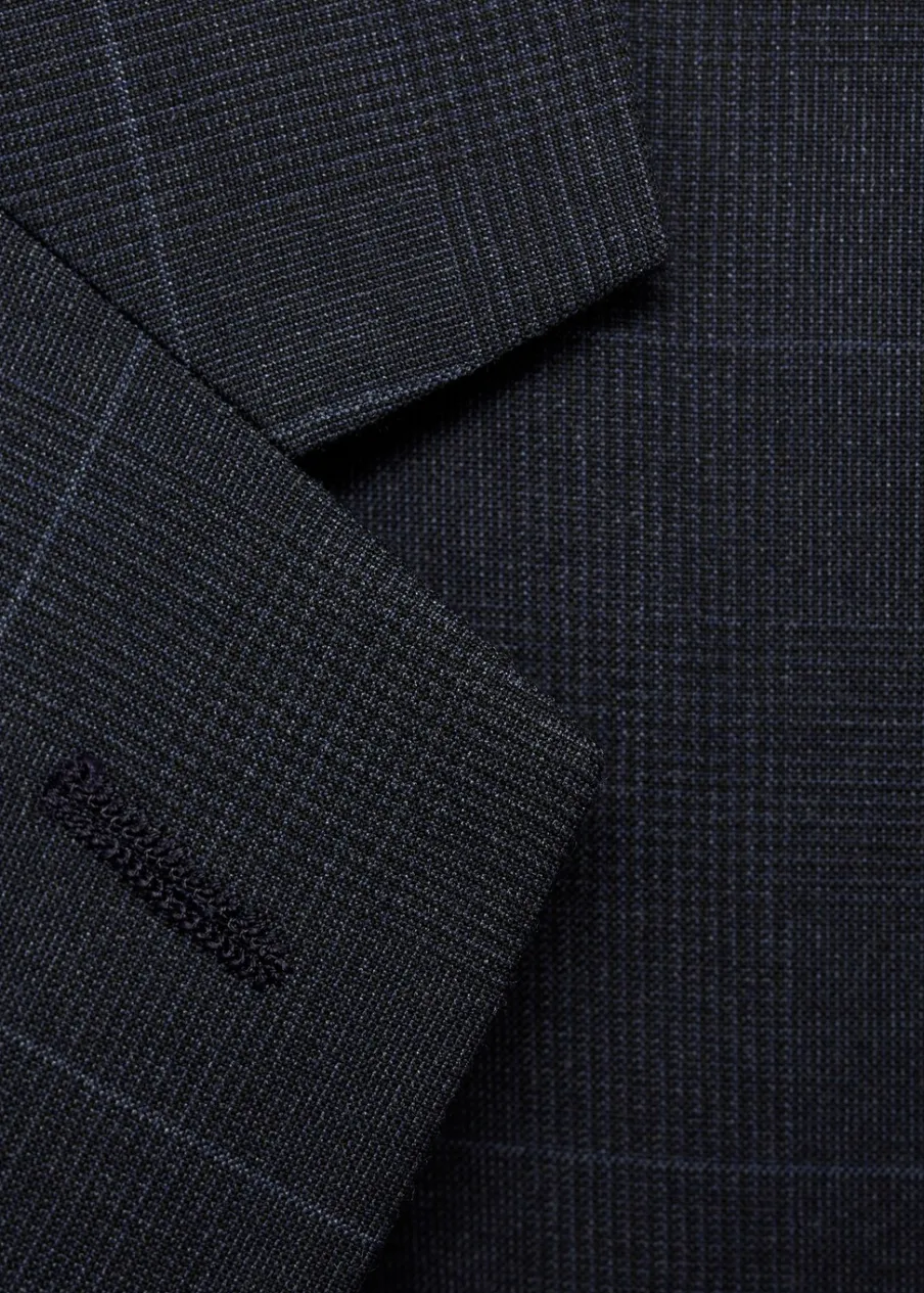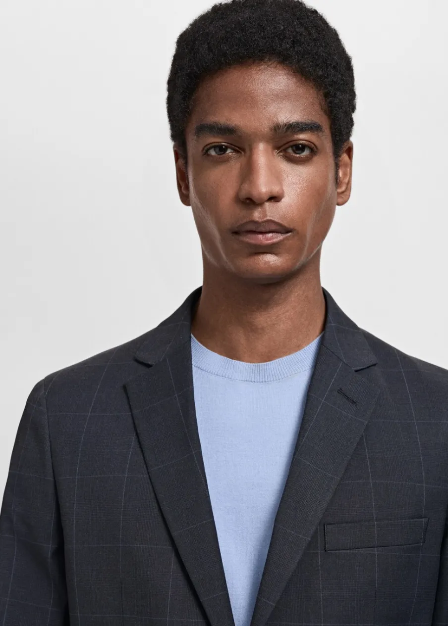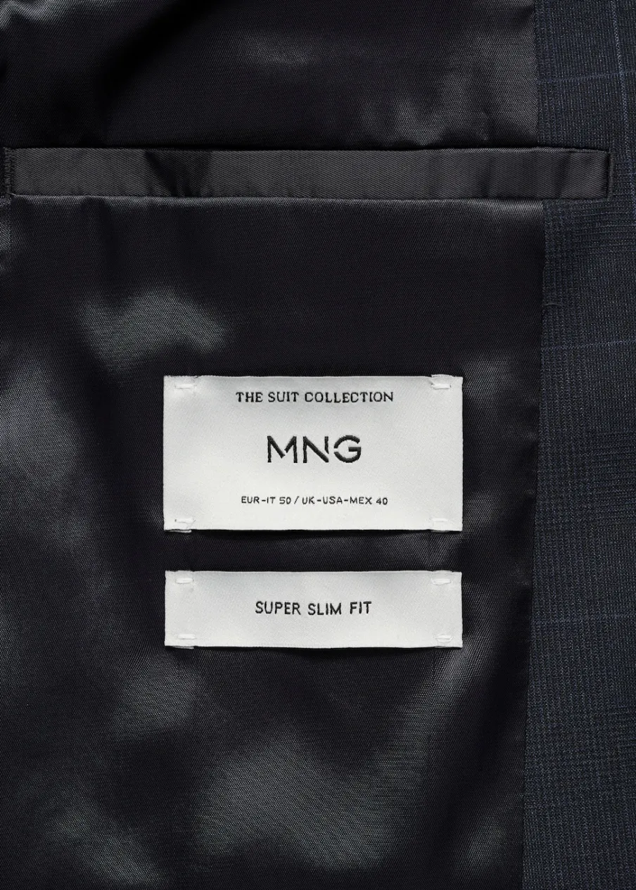 Super slim-fit. Wzór w kratę windowpane. Kołnierz z klapami. Zapięcie na guziki z przodu. Kieszeń wpuszczana na piersi. Dwie wpuszczane kieszenie z patkami z przodu. Dwie szlice z tyłu. Wewnętrzna podszewka. Wewnętrzna kieszeń. Model ma 190 cm wzrostu i nosi rozmiar 50.