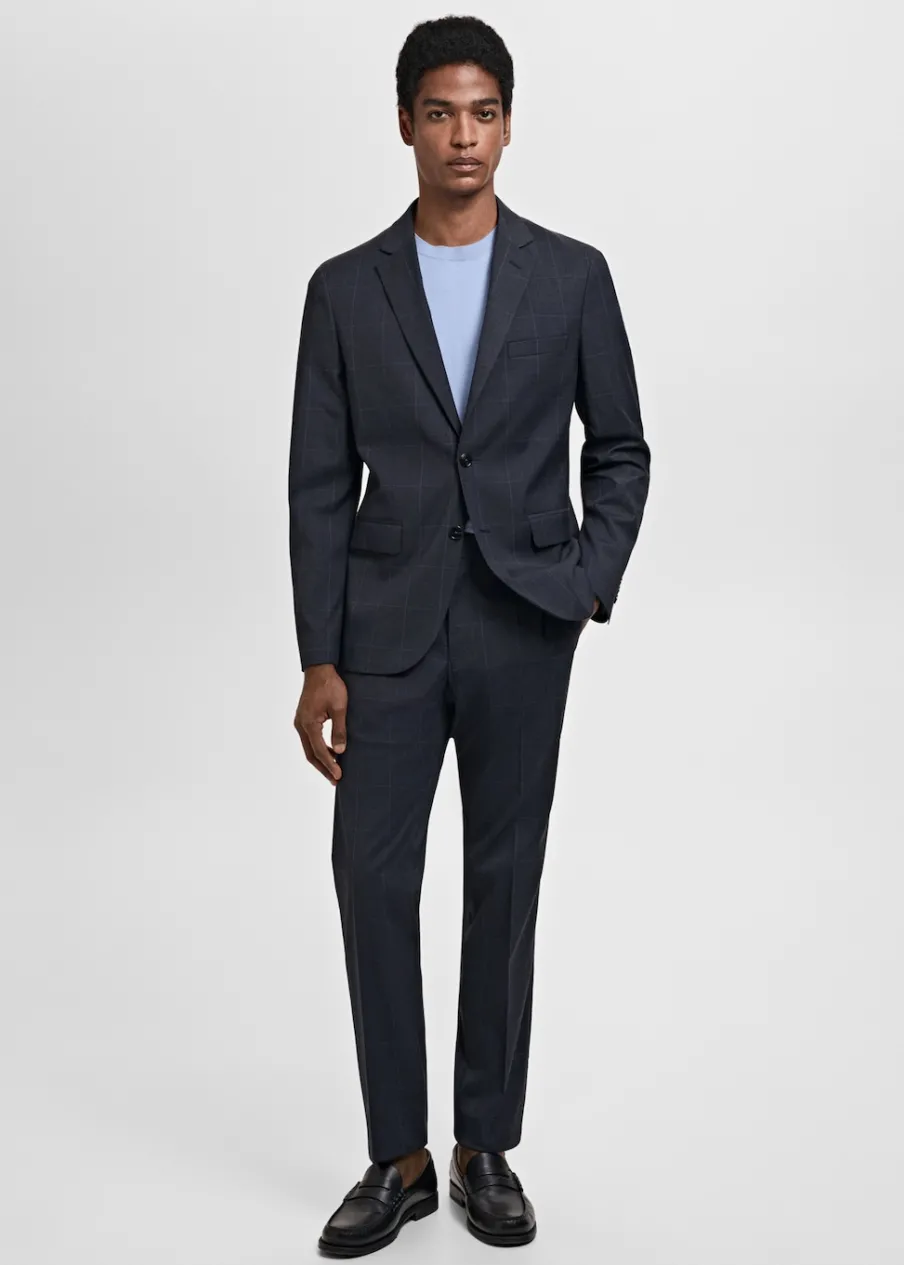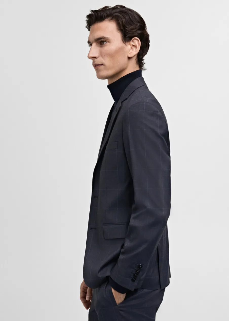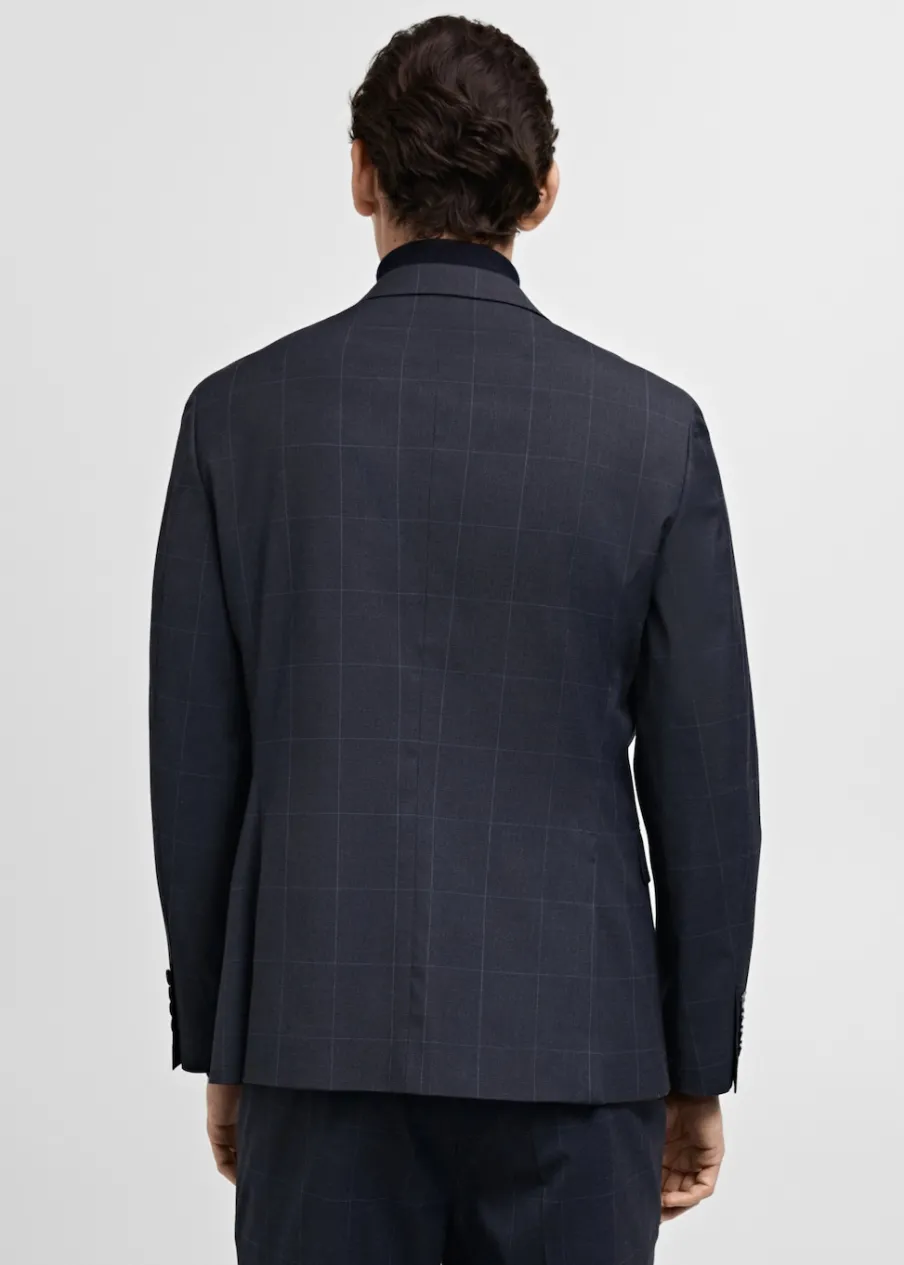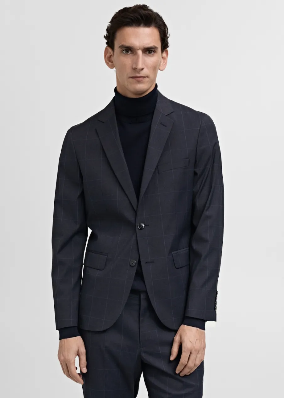 Super slim-fit. Wzór w kratę windowpane. Kołnierz z klapami. Zapięcie na guziki z przodu. Kieszeń wpuszczana na piersi. Dwie wpuszczane kieszenie z patkami z przodu. Dwie szlice z tyłu. Wewnętrzna podszewka. Wewnętrzna kieszeń. Model ma 190 cm wzrostu i nosi rozmiar 50.