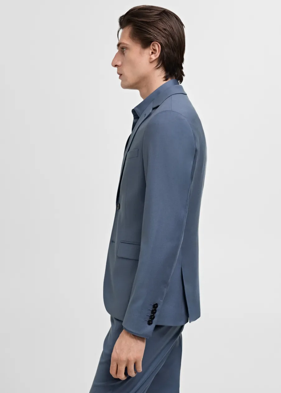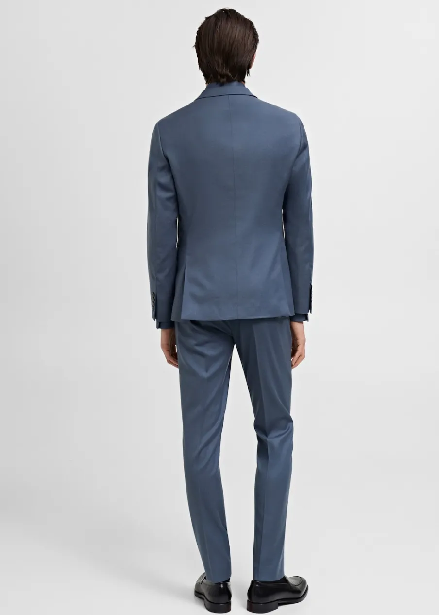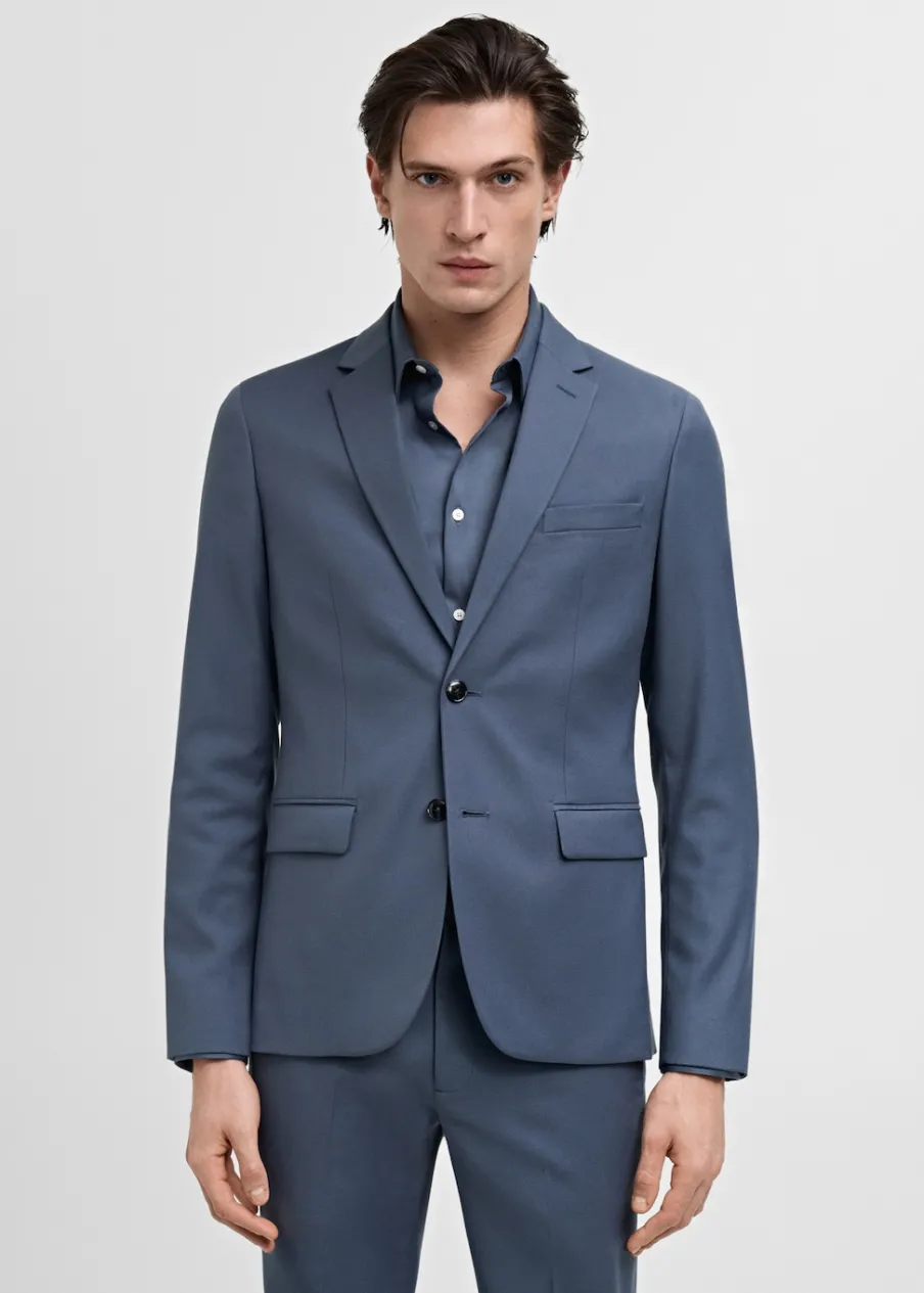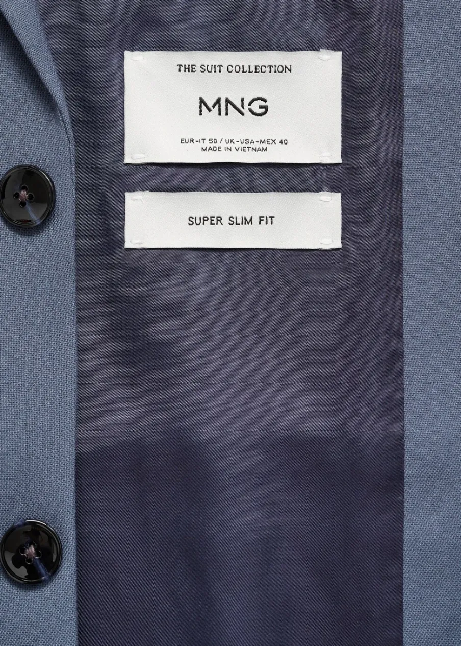 Super slim-fit. Kołnierz z klapami. Kieszonka z obszyciem na piersi. Dwie kieszenie z patkami z przodu. Zapinane mankiety. Dwurzędowe zapięcie. Wewnętrzna kieszeń. Wewnętrzna podszewka. Rozcięcie z tyłu. Model ma 185 cm wzrostu i nosi rozmiar 50.
