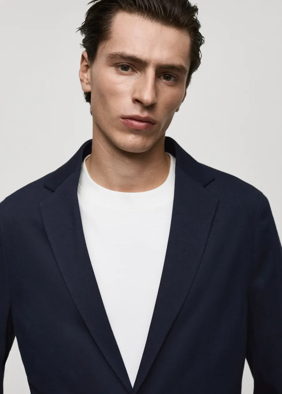 Tkanina mieszanka bawełny. Slim-fit. Tkanina z mikroteksturą. Kołnierz z klapami. Zapięcie na guziki z przodu. Dwie wpuszczane kieszenie z patkami z przodu. Długi rękaw z guzikami na mankietach. Dwie szlice z tyłu. Częściowa podszewka. Wewnętrzna kieszeń. Model ma 190 cm wzrostu i nosi rozmiar M.