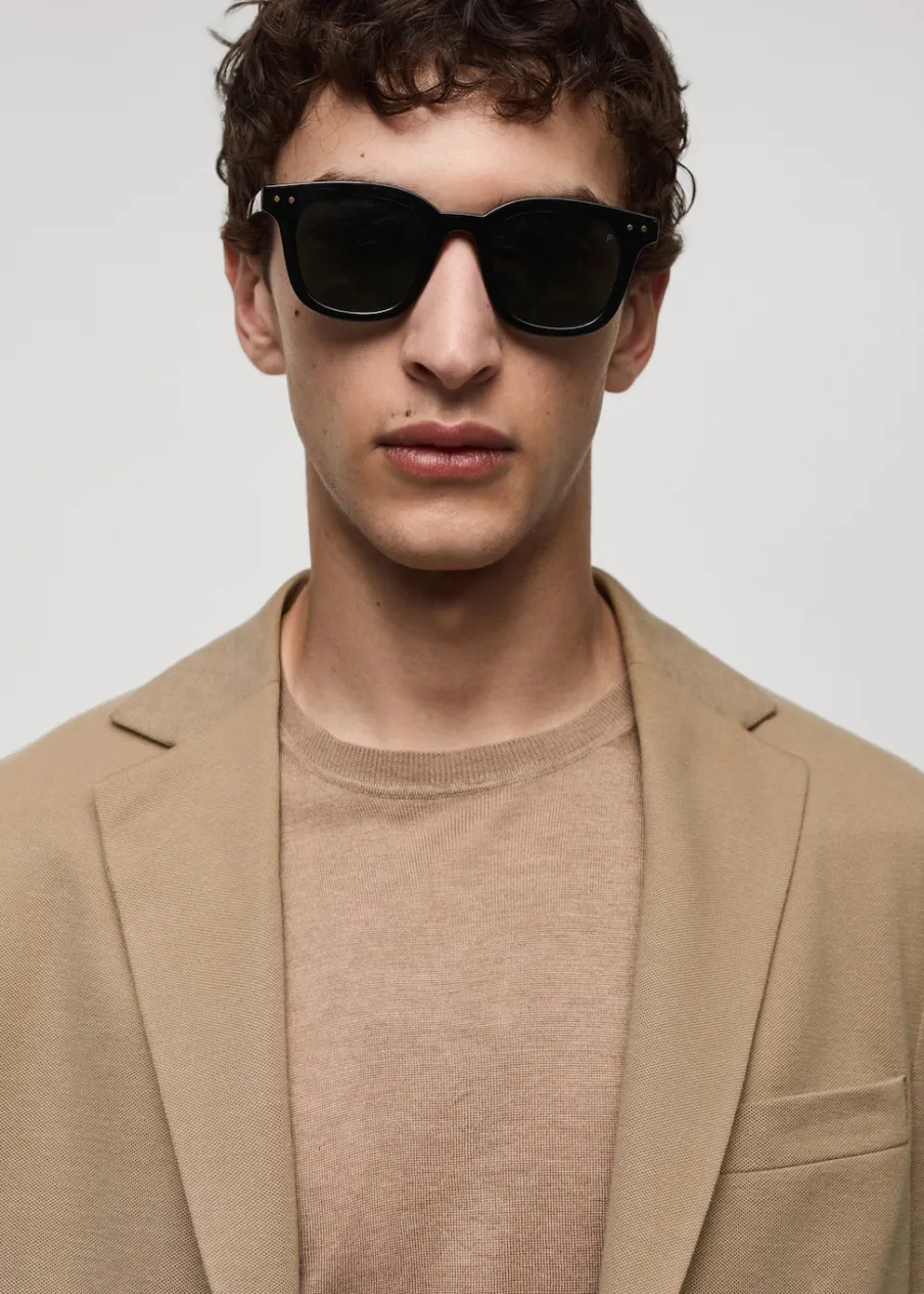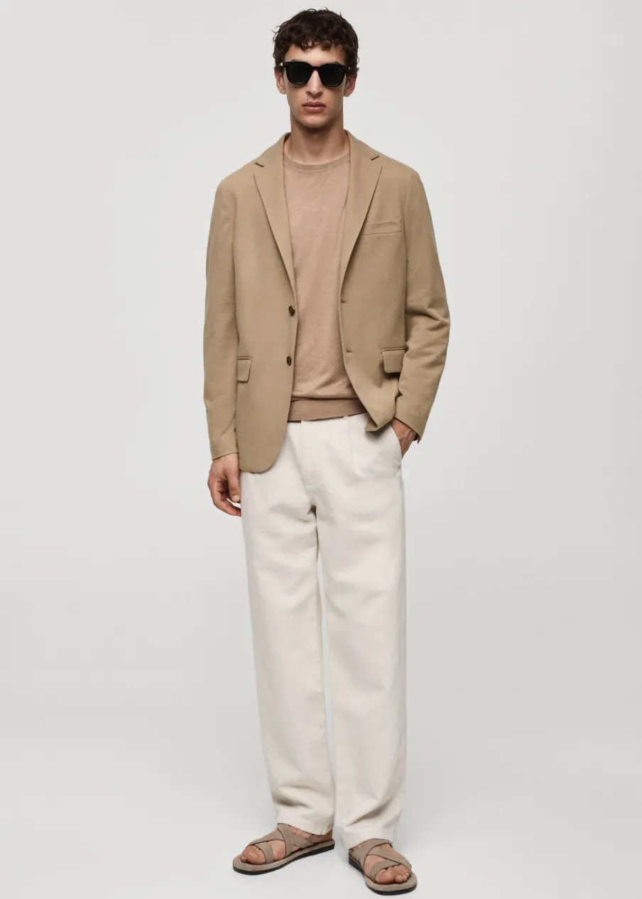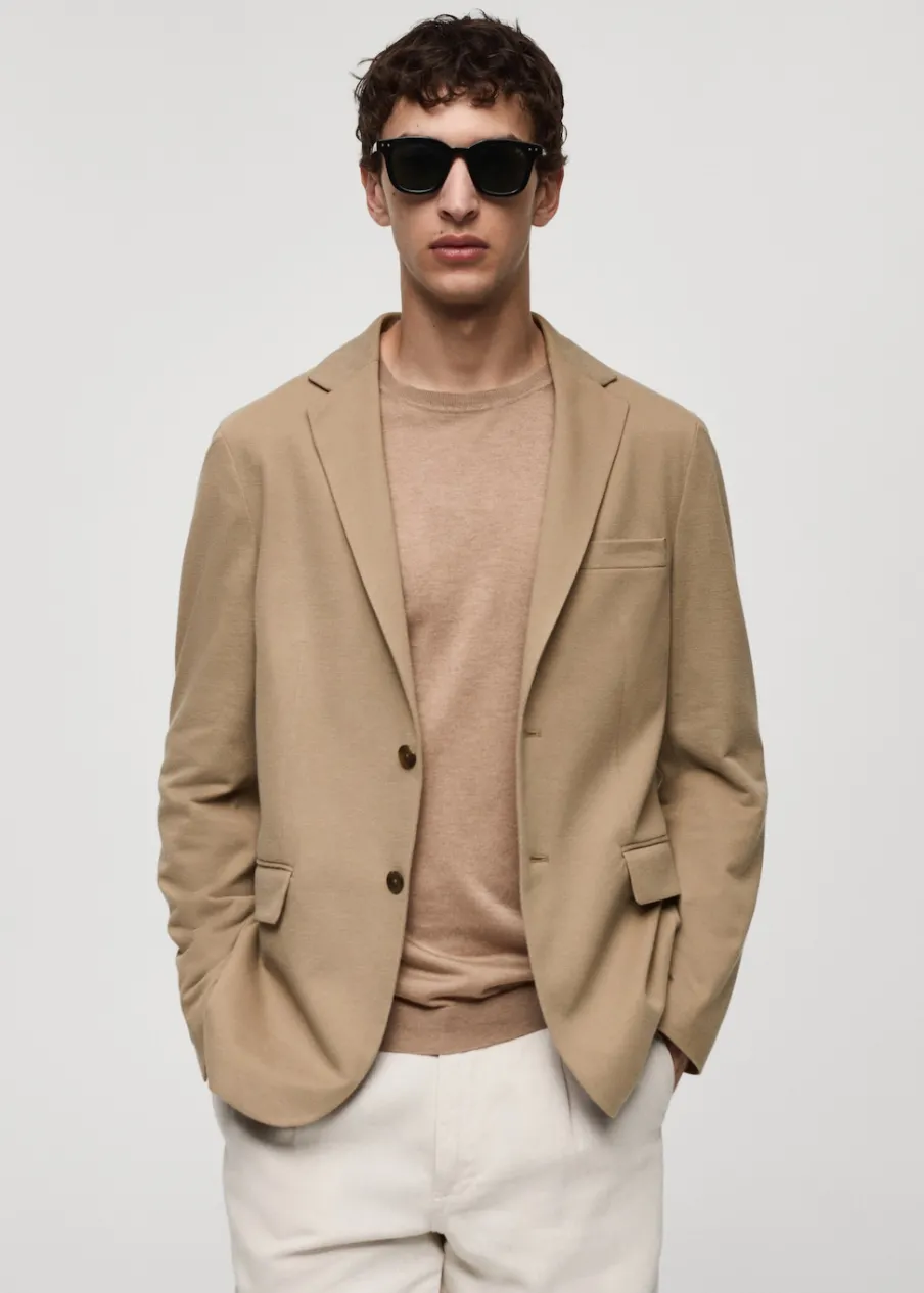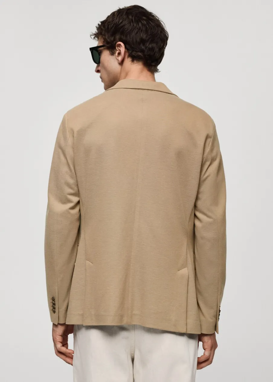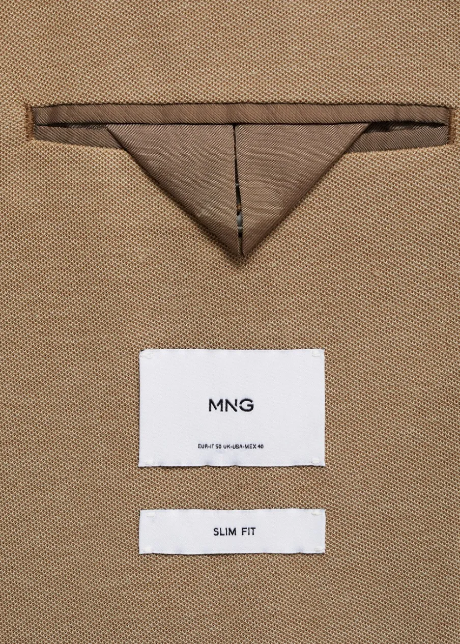 Slim-fit. Strukturalna tkanina. Cienka tkanina. Nacięte klapy. Zapięcie na dwa guziki z przodu. Długi rękaw z guzikami na mankietach. Kieszeń wpuszczana na piersi. Dwie kieszenie z patkami z przodu. Podszewka z przodu. Dwie kieszenie z wypustkami po wewnętrznej stronie. Model ma 187 cm wzrostu i nosi rozmiar 50. Dwie szlice z tyłu.