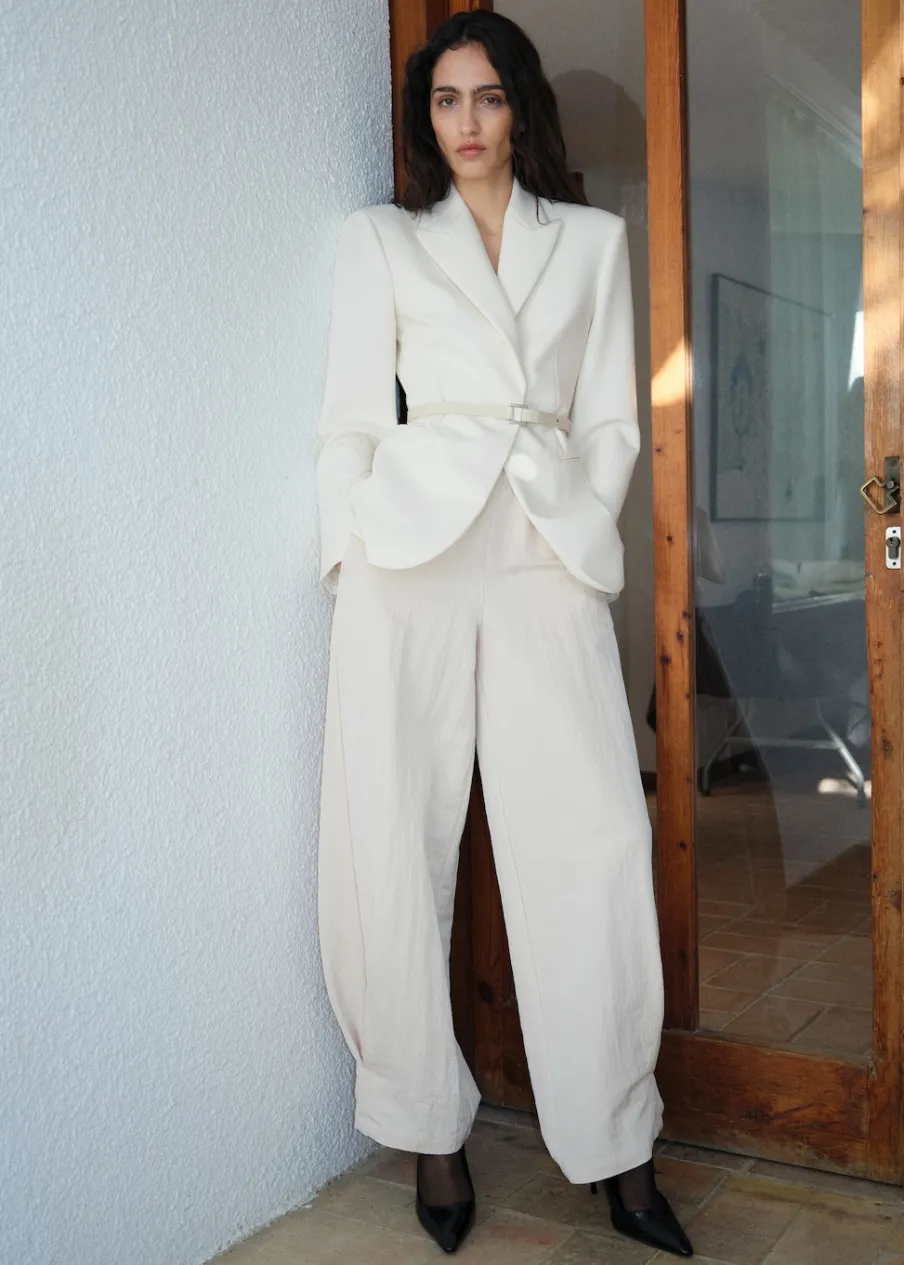 OpisModel strukturalny. Model prosty. Wyraźne ramiona. Dekolt w szpic z kołnierzykiem. Długi rękaw z guzikami na man…