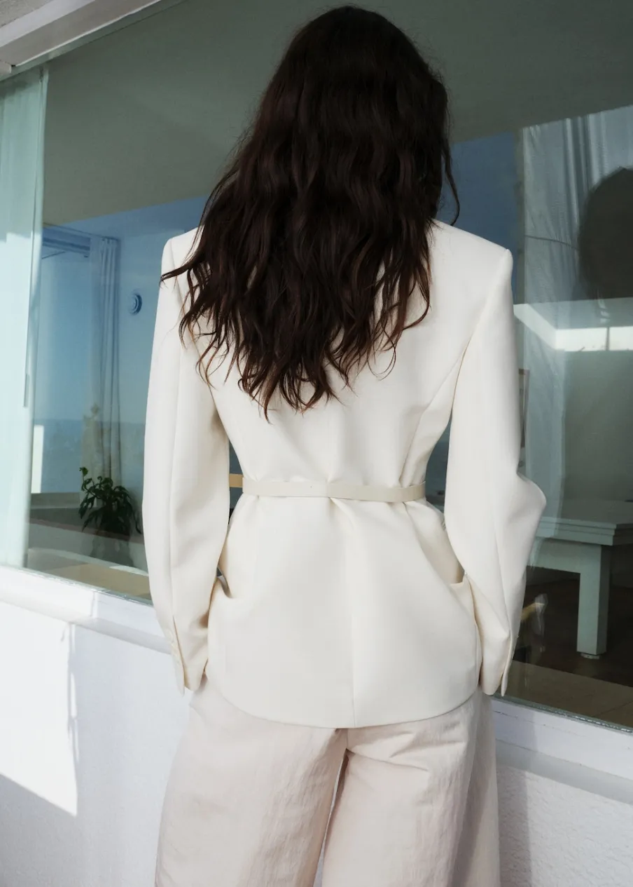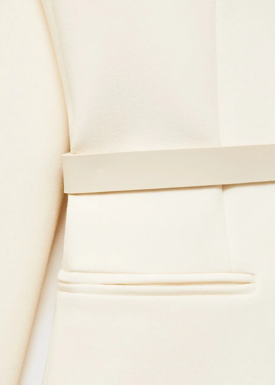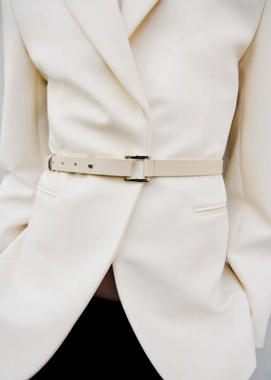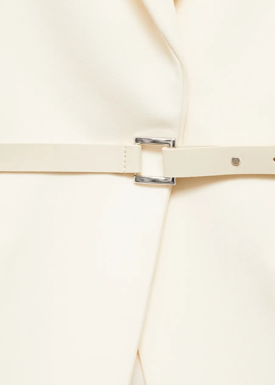 Model strukturalny. Model prosty. Wyraźne ramiona. Dekolt w szpic z kołnierzykiem. Długi rękaw z guzikami na mankietach. Odpinany pasek. Dwie kieszenie z wypustkami z przodu. Zapięcie paska na sprzączkę. Wewnętrzna podszewka.