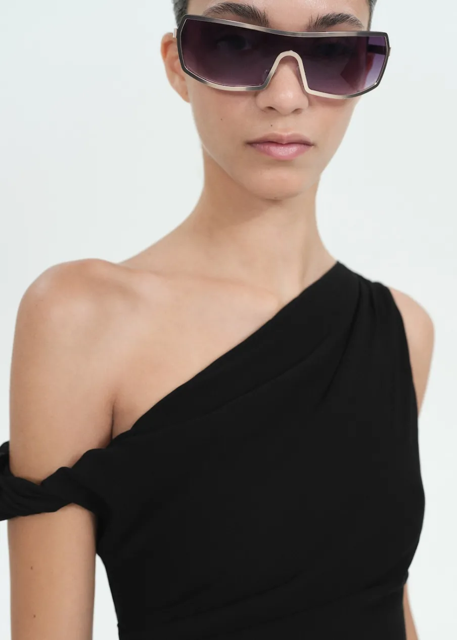 Metalowe oprawki. Styl bez oprawki. Całkowity wskaźnik ochronny z filtrem UV kategorii 3. Te okulary zostały wytworzone z recyklowanych odpadów z procesu produkcji okularów z poliwęglanu. Otrzymany materiał zachowuje właściwości poliwęglanu, jeśli chodzi o elastyczność i trwałość. Kolekcja wizytowa. Kolekcja Selection. Modelka ma 177 cm wzrostu i nosi rozmiar S/36.