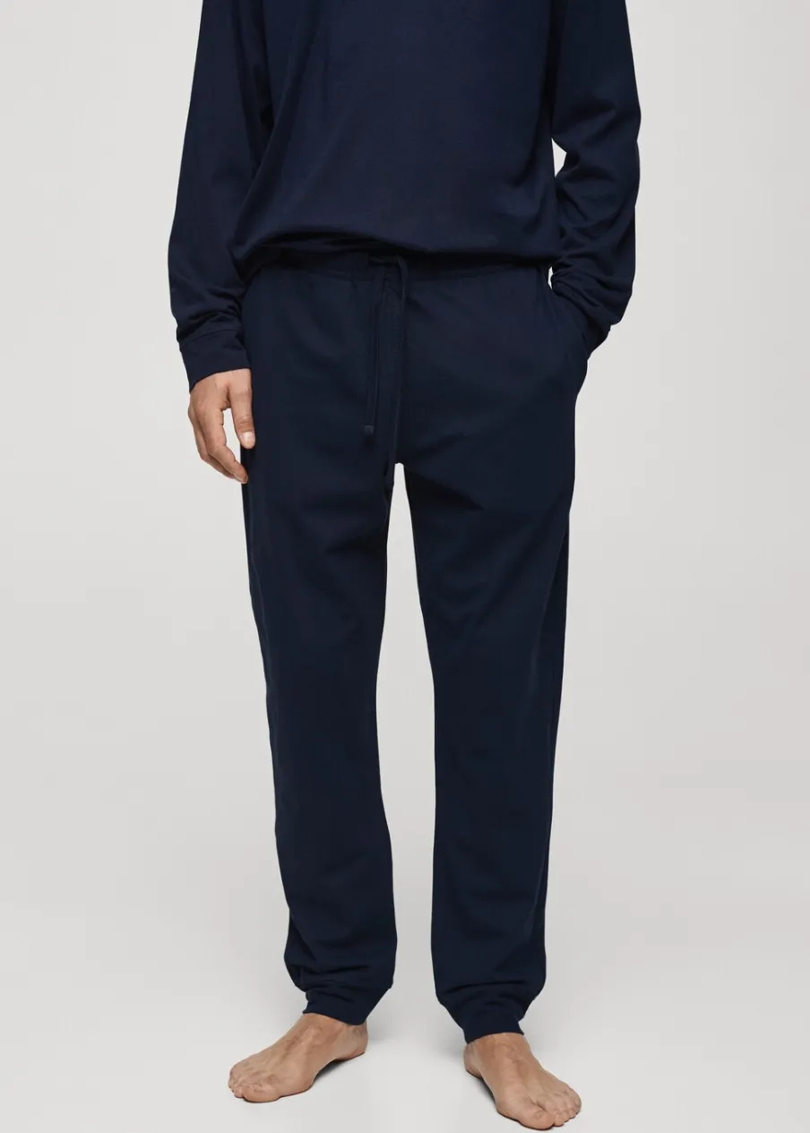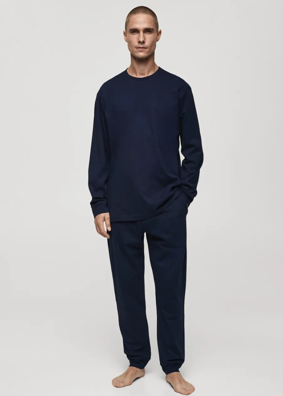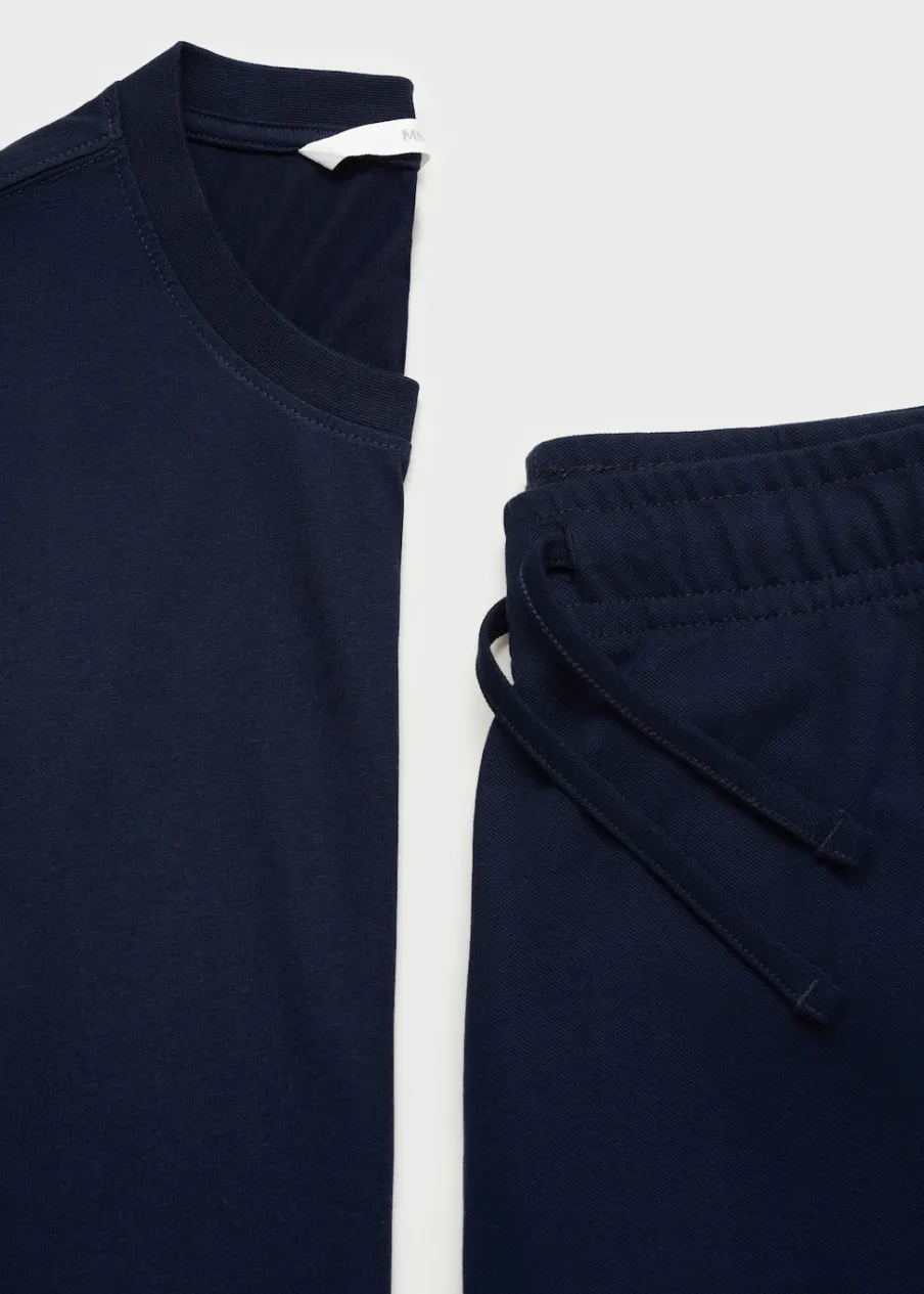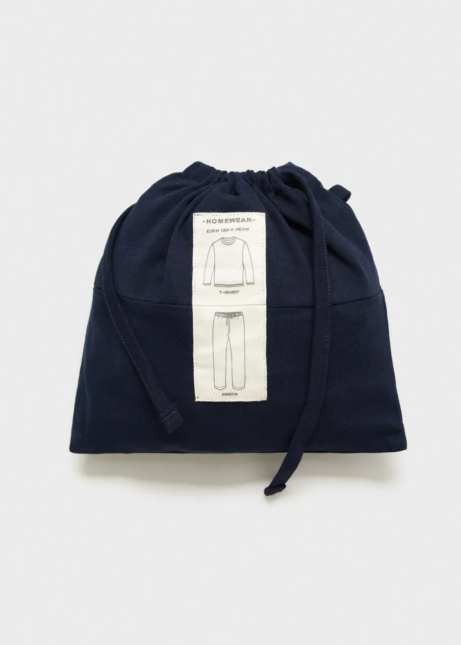 Zestaw piżamowy: koszulka i spodnie. 100% bomull. Koszulka z okrągłym dekoltem i prążkowanym wykończeniem. Spodnie z gumką i sznurkiem w pasie. W komplecie worek do przechowywania.