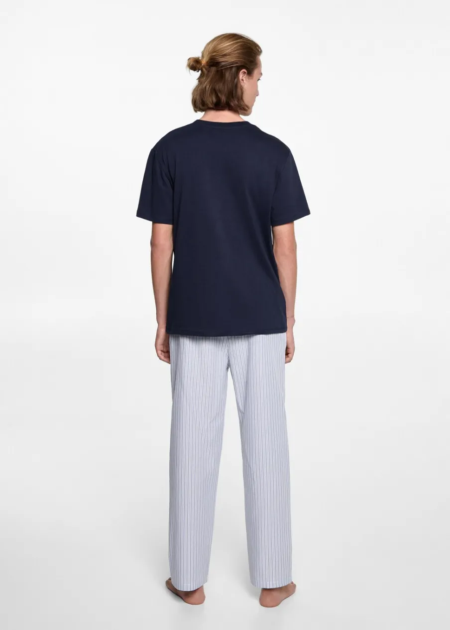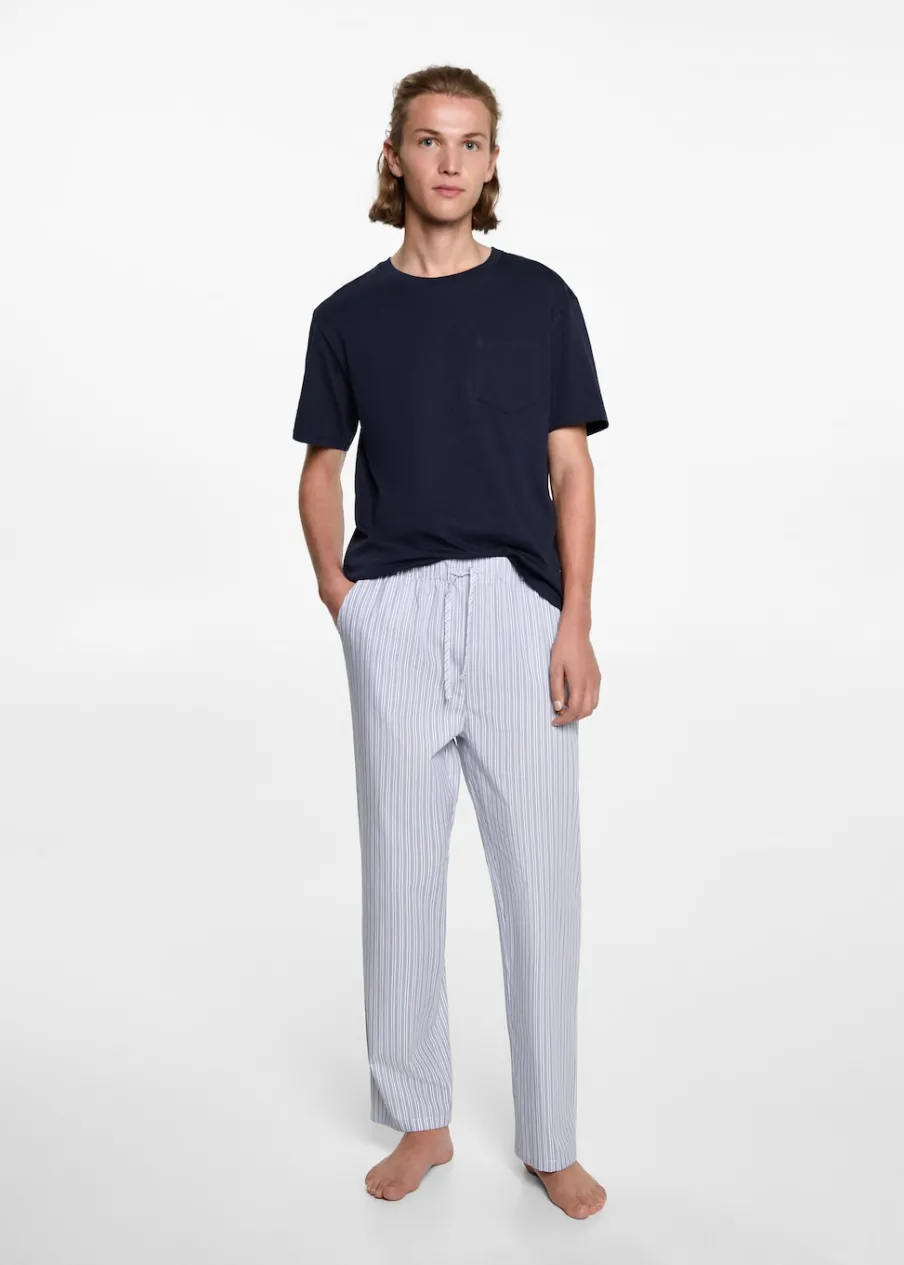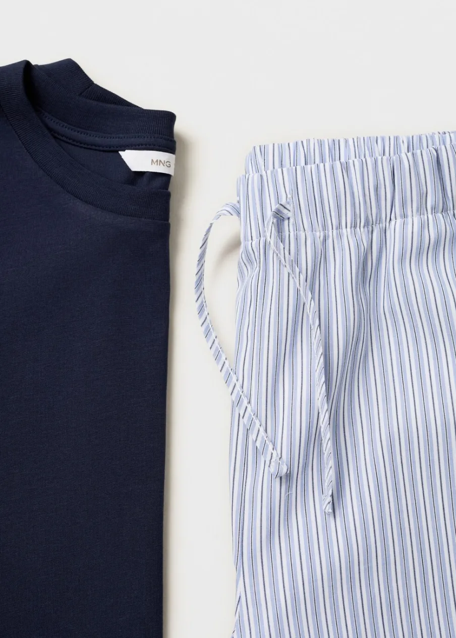 Krótki rękaw. Model prosty. Elastyczny pas. Wzór w paski. Dwie kieszenie boczne. Zapięcie na regulowane wiązanie. Model długi. Okrągły dekolt. Zestaw piżamowy: koszulka i spodnie.