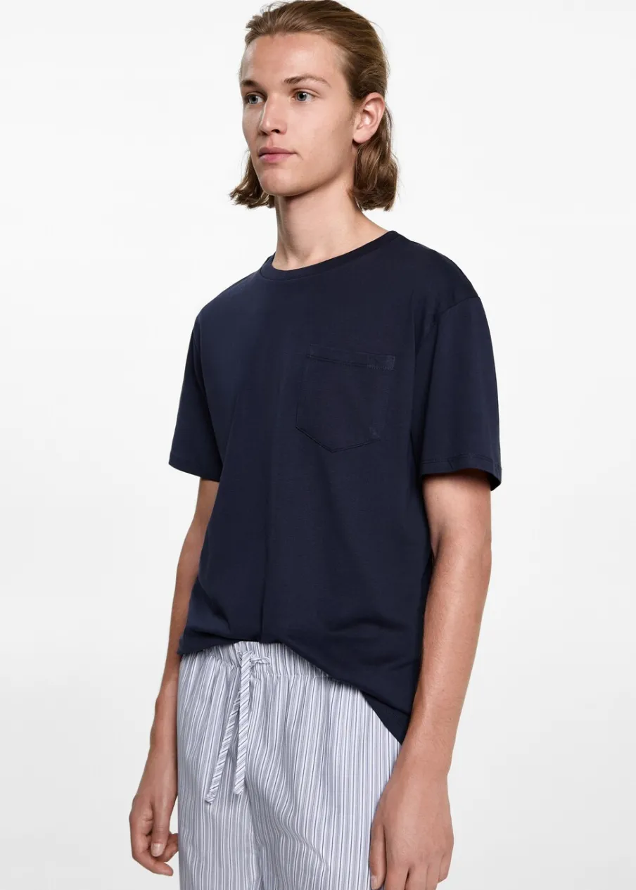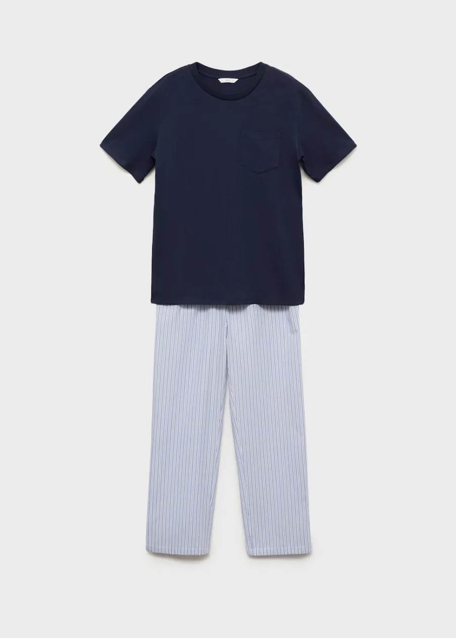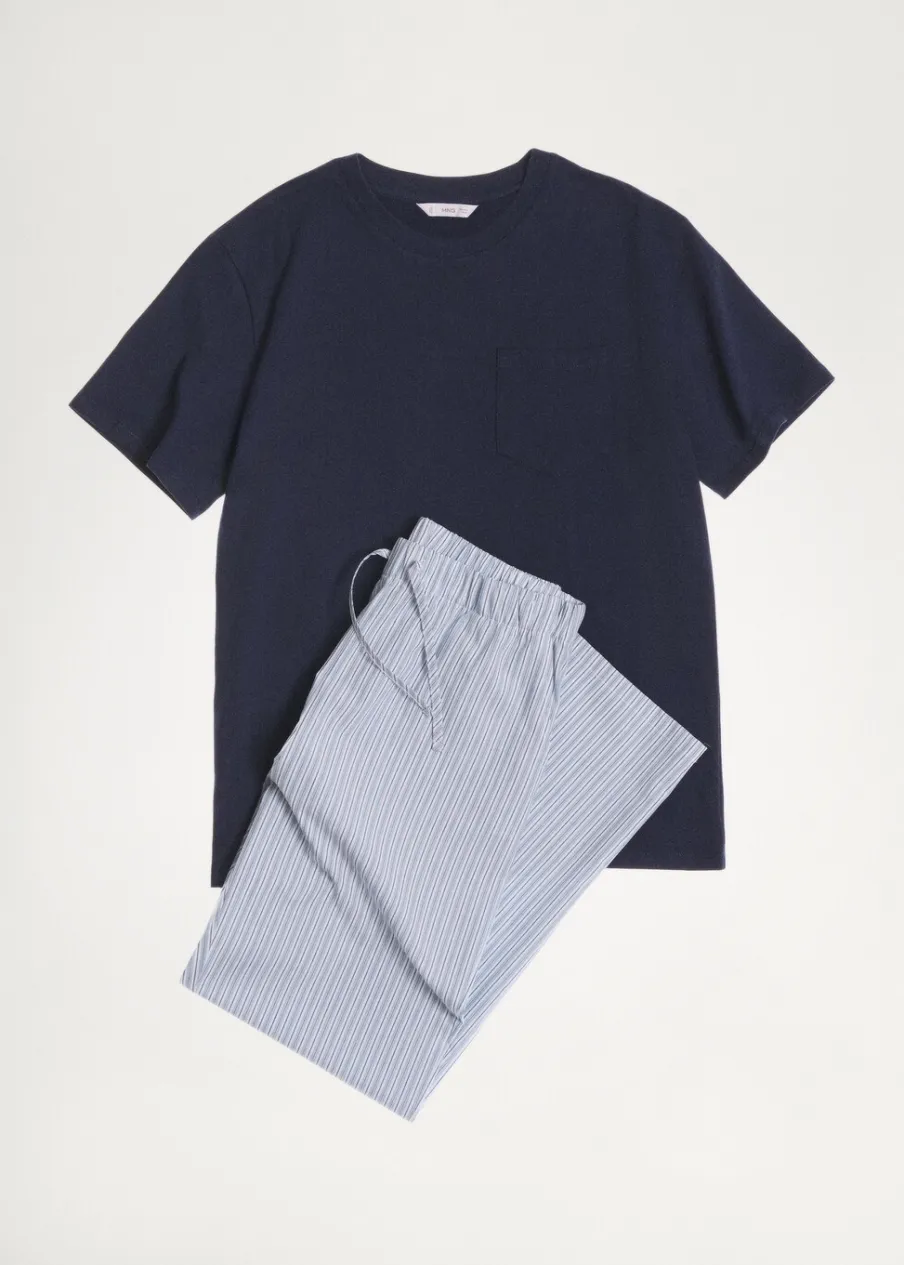 Krótki rękaw. Model prosty. Elastyczny pas. Wzór w paski. Dwie kieszenie boczne. Zapięcie na regulowane wiązanie. Model długi. Okrągły dekolt. Zestaw piżamowy: koszulka i spodnie.