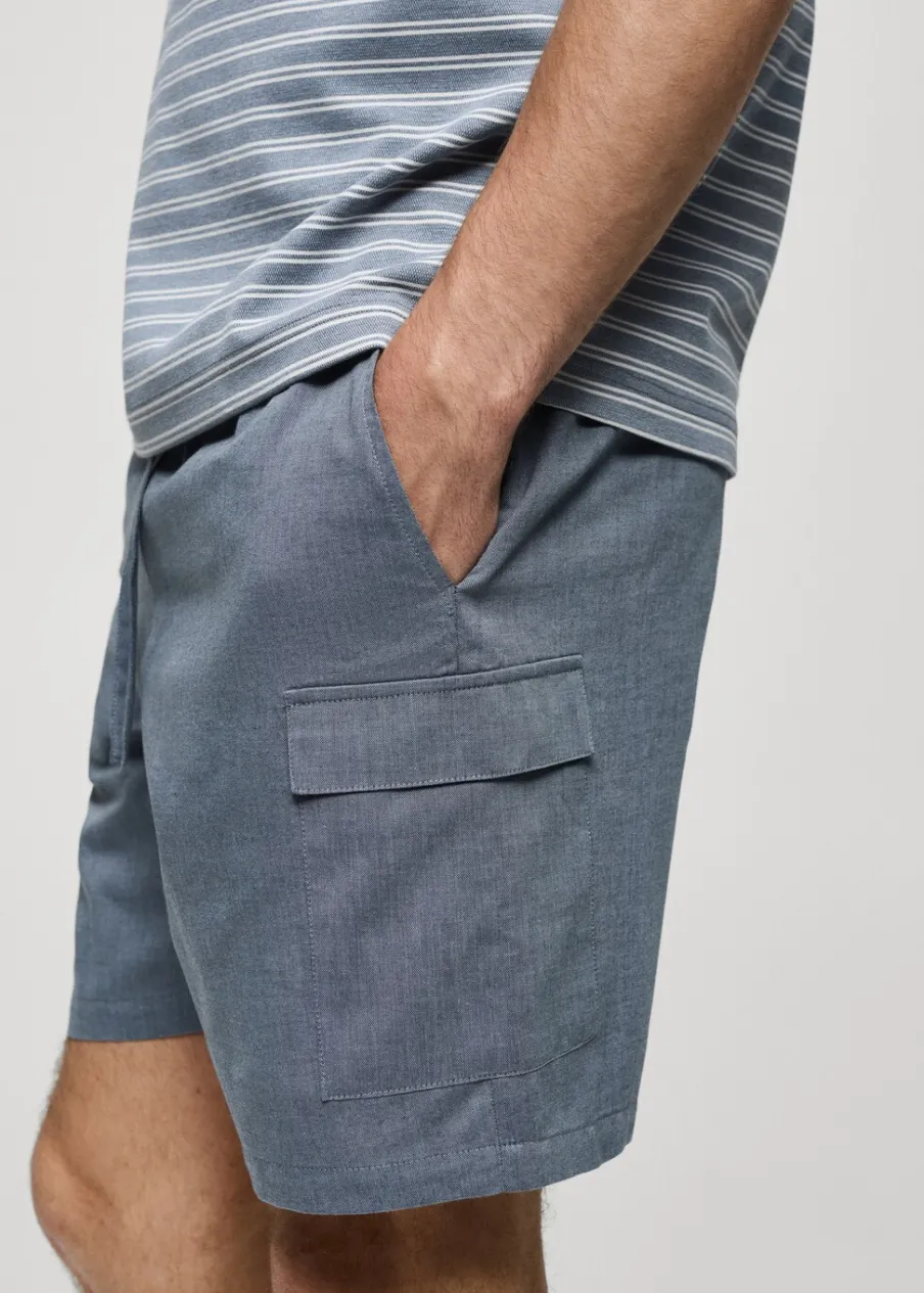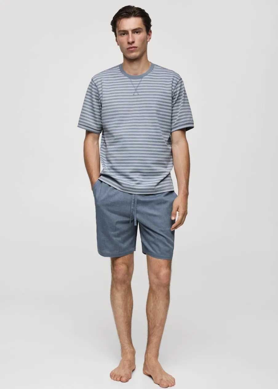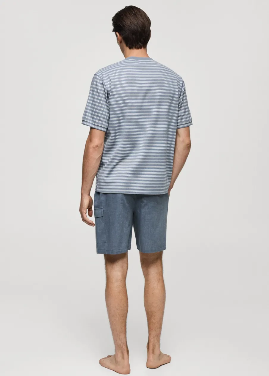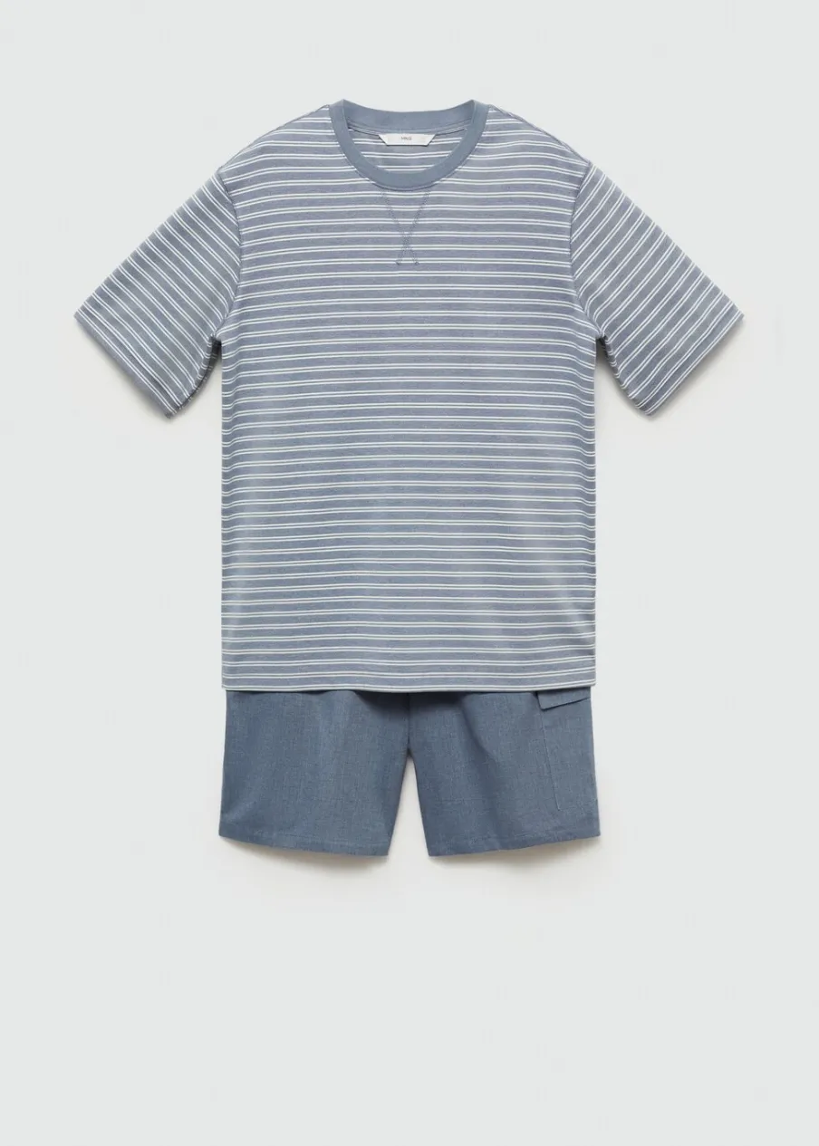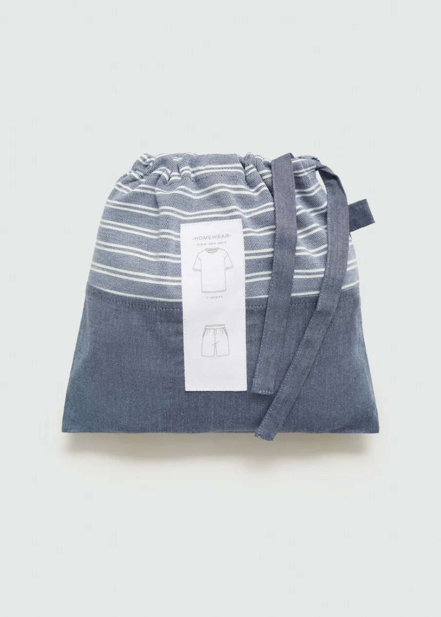 Zestaw piżamowy: koszulka i spodnie. Zawiera torebkę z tkaniny. Koszulka bawełniana w paski. Krótki rękaw. Okrągły dekolt. Prosty dół. Krótkie spodenki. Dwie naszywane kieszenie z patką na nogawce. Elastyczny pas z regulowanym sznurkiem. Model ma 185 cm wzrostu i nosi rozmiar M.