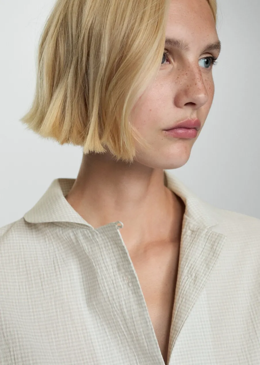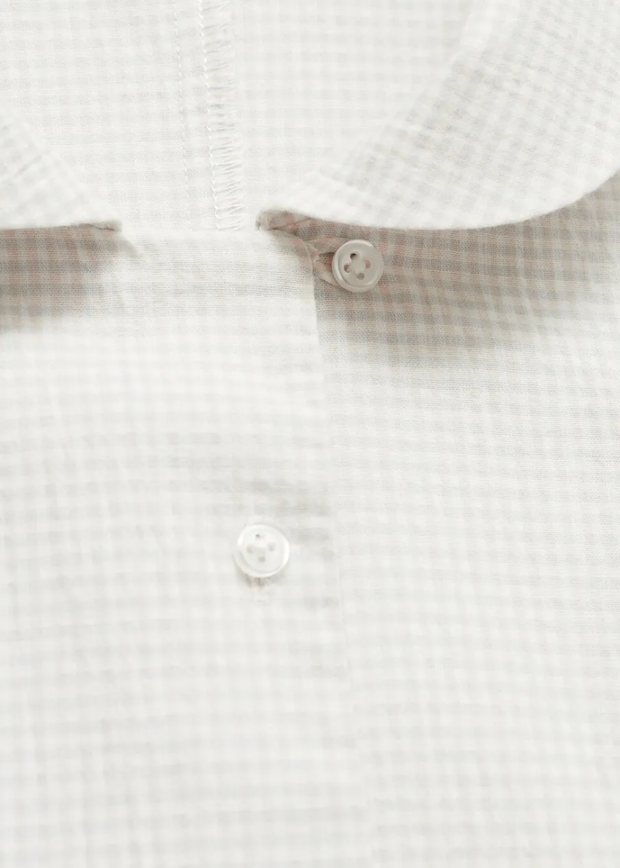 Tkanina bawełniana. Model długi. Model dostępny w wersji gładkiej lub ze wzorem. Koszulowy kołnierz. Długi rękaw. Zapięcie z przodu na guziki. Elastyczny pas. Elastyczny pas z wiązanym zapięciem. Wzór w kratkę vichy.