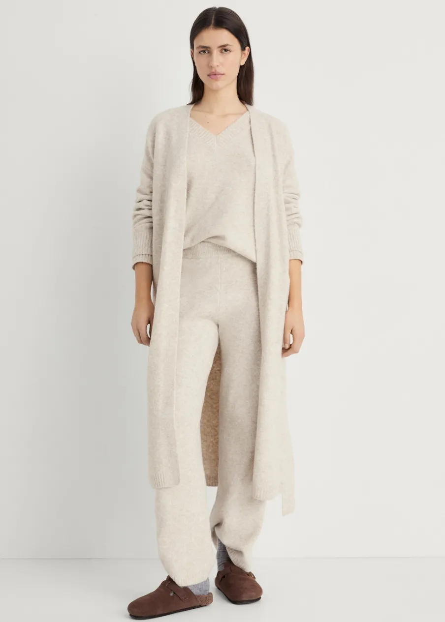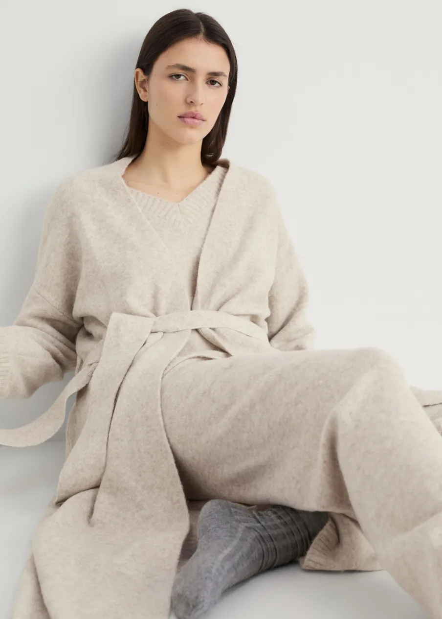 Dzianina średniej grubości. Model długi. Zakładany dekolt V. Długi rękaw. Dekoracyjny pasek. Total look.