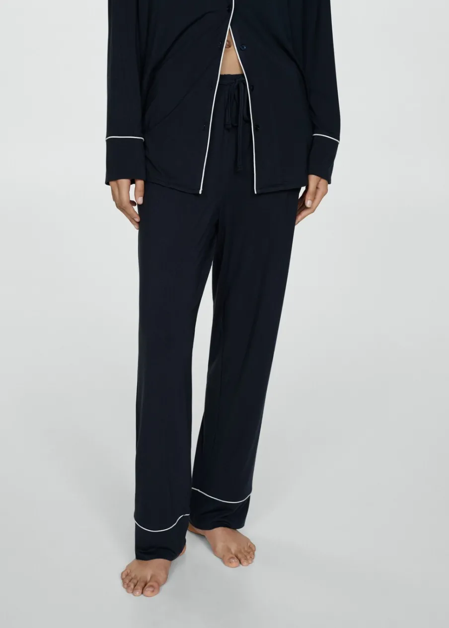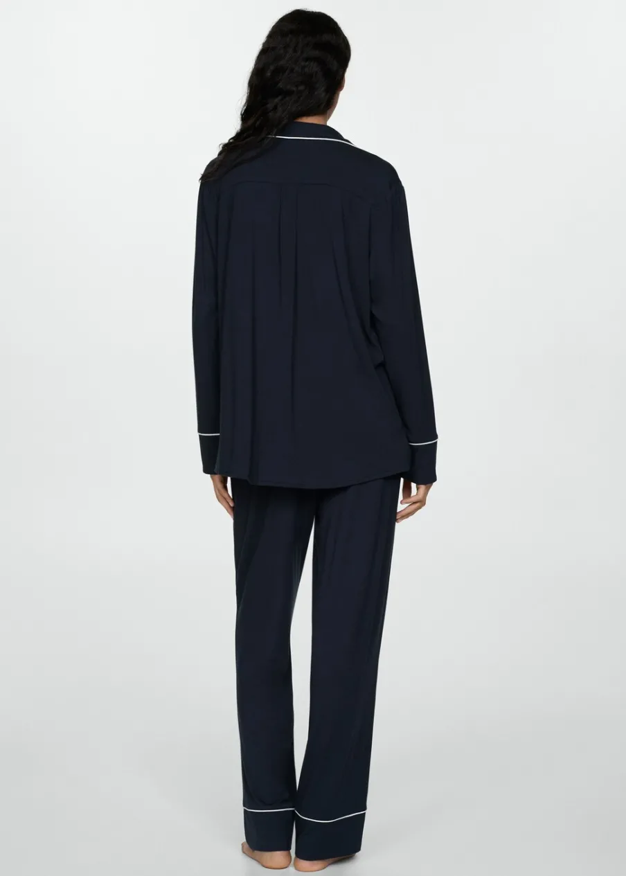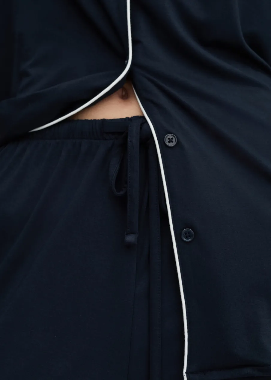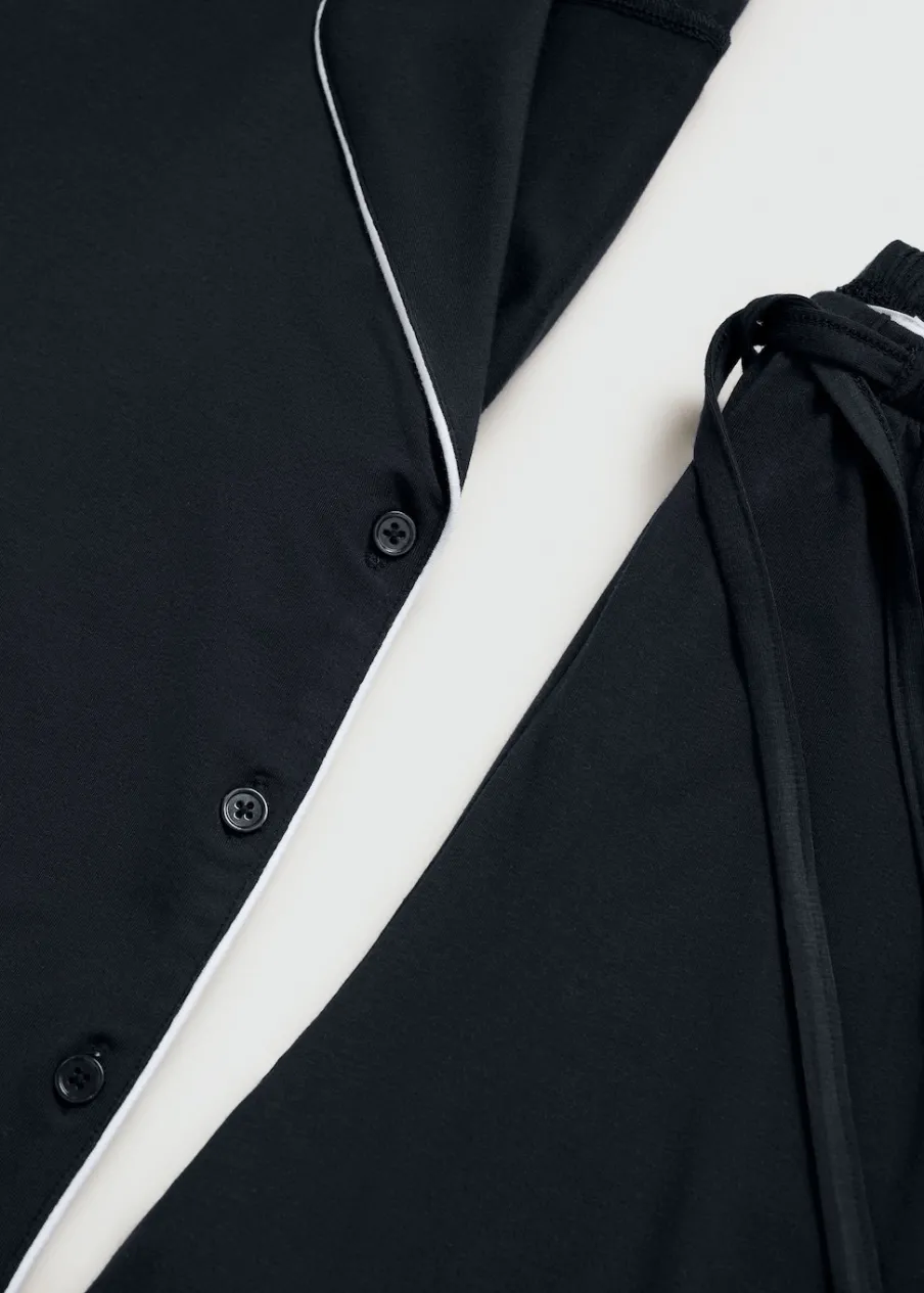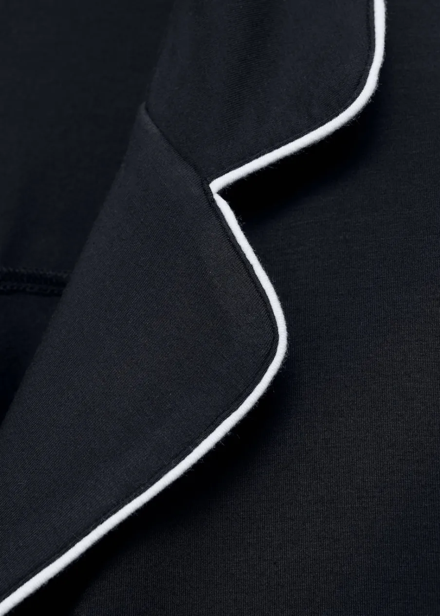 Lejąca tkanina. Model długi. Model prosty. Kołnierz z klapami. Klapy z nacięciem. Długi rękaw. Elastyczny pas z wiązanym zapięciem. Kontrastowe lamówki. Model dwuczęściowy. Wyłącznie online. Zapięcie na guziki z przodu.