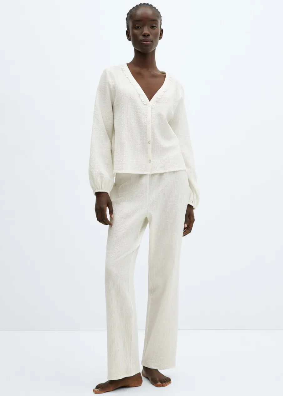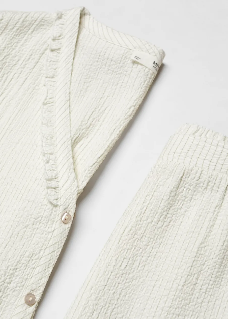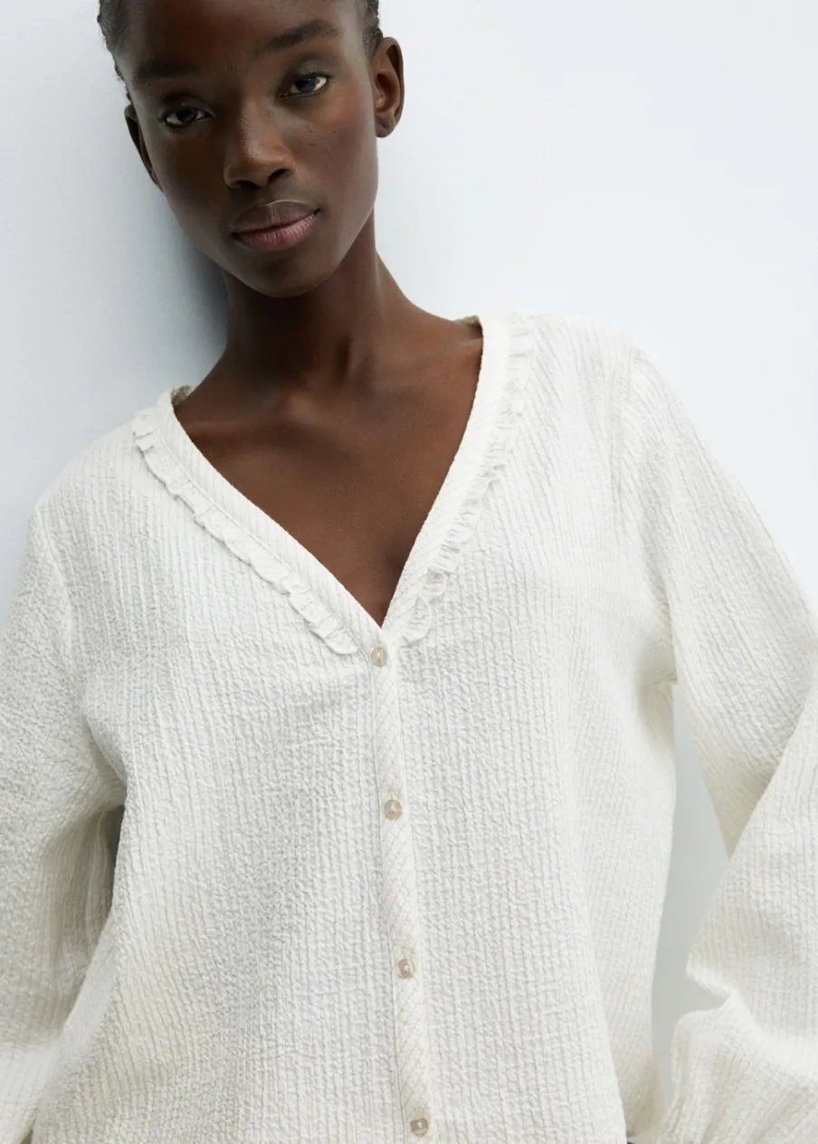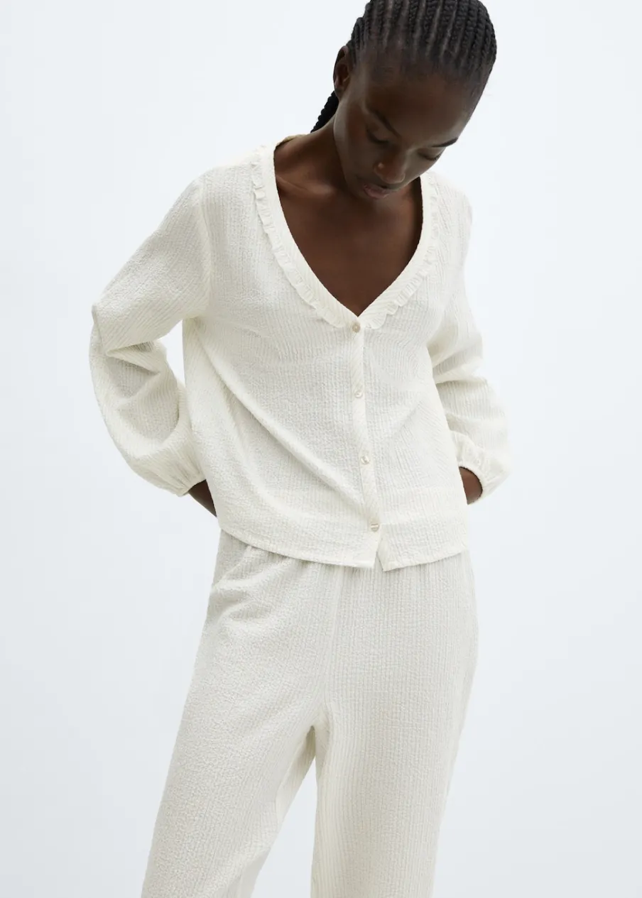 Zestaw dwóch sztuk. Tkanina bawełniana. Model oversize. Krótki krój. Koszulowy kołnierz. Falbanki pod szyją. Długi bufiasty rękaw. Elastyczne mankiety. Zapięcie z przodu na guziki.