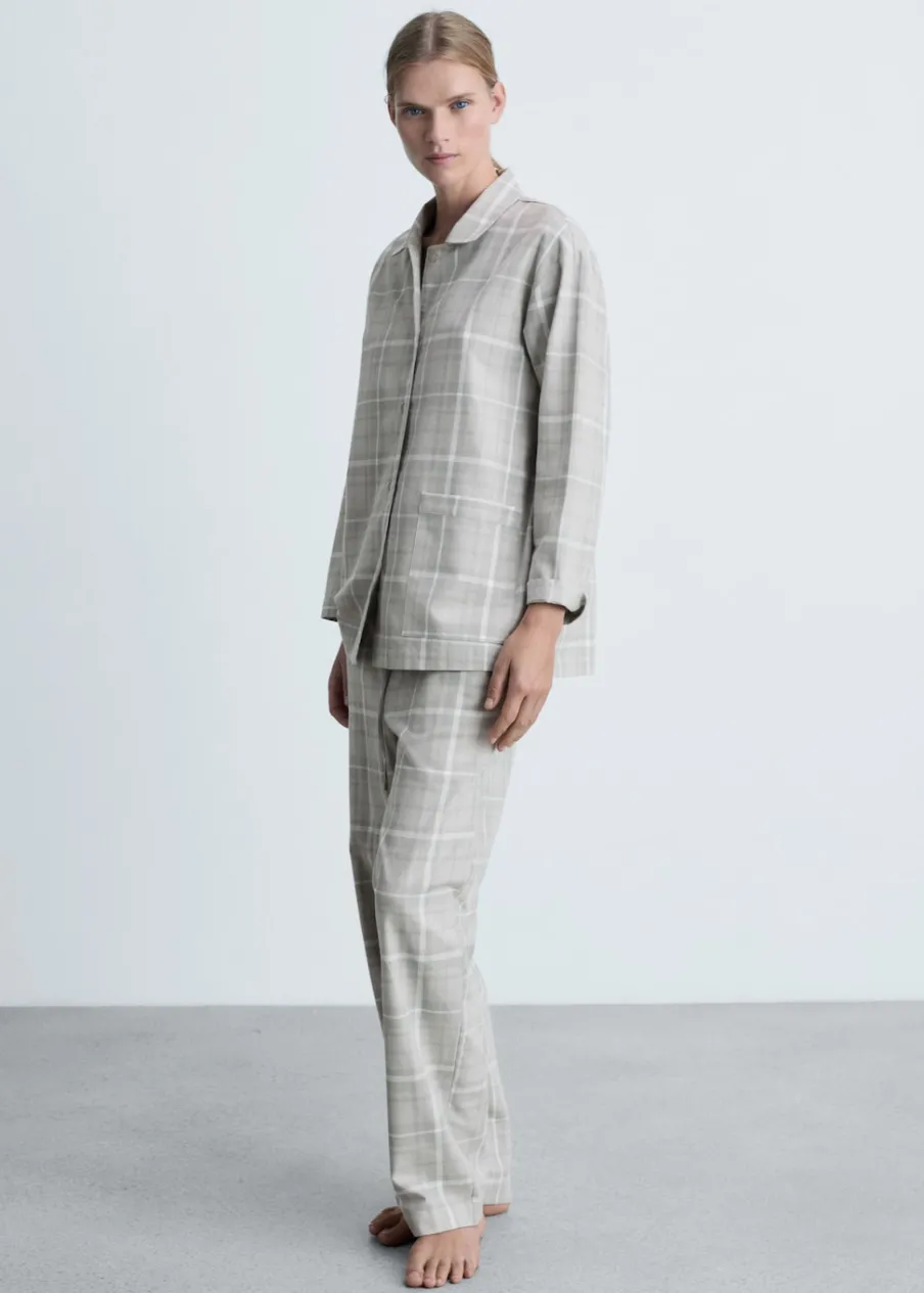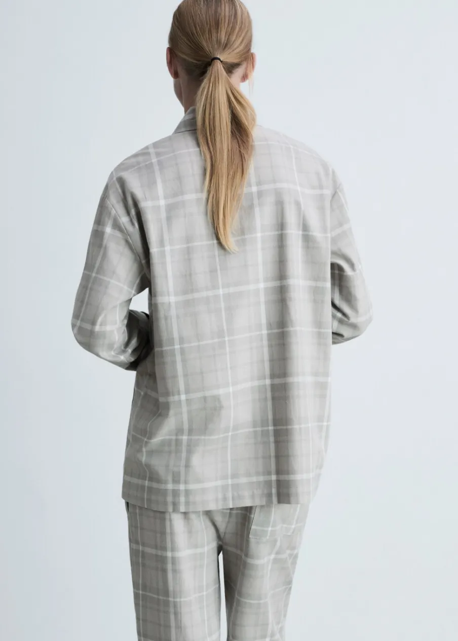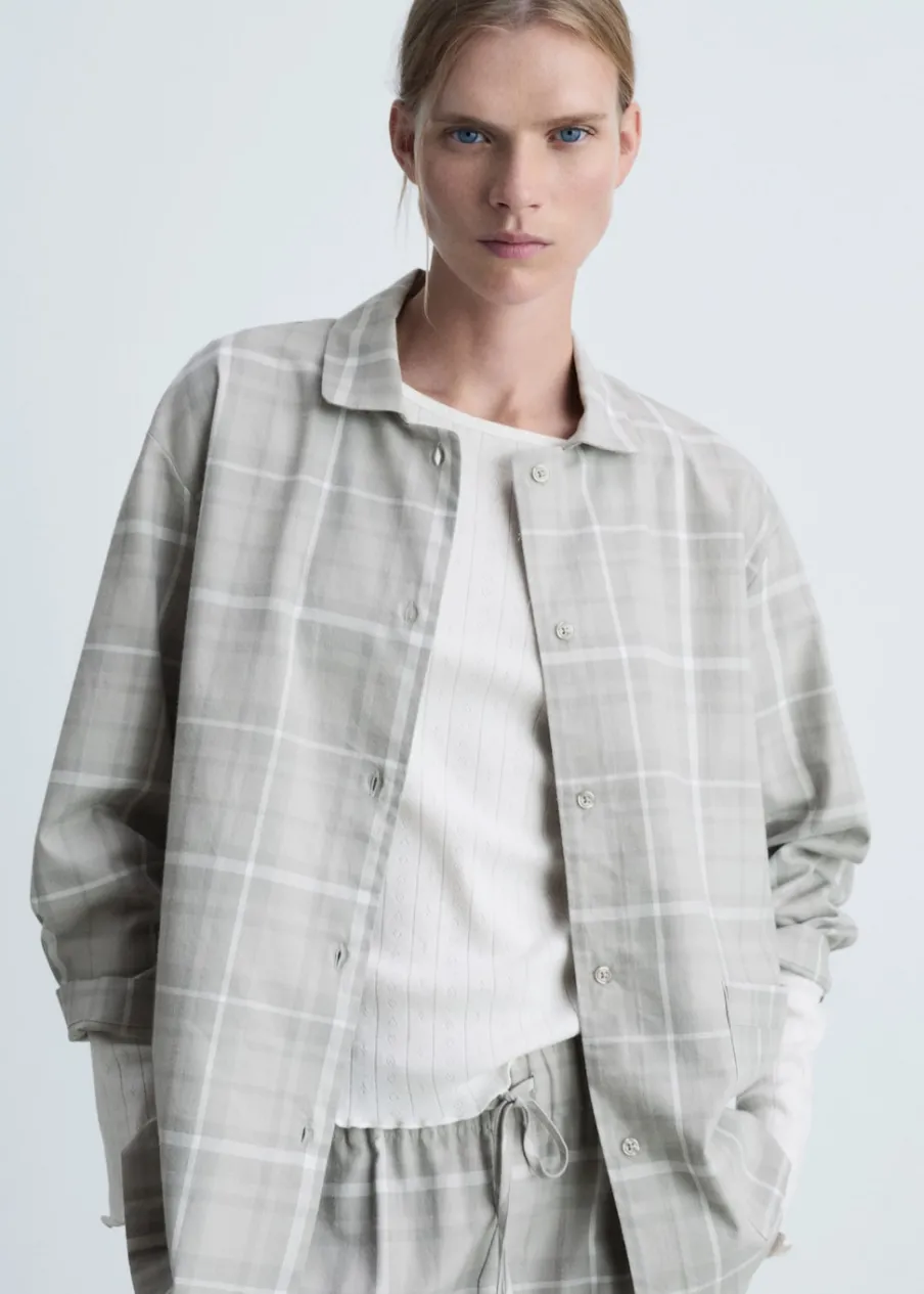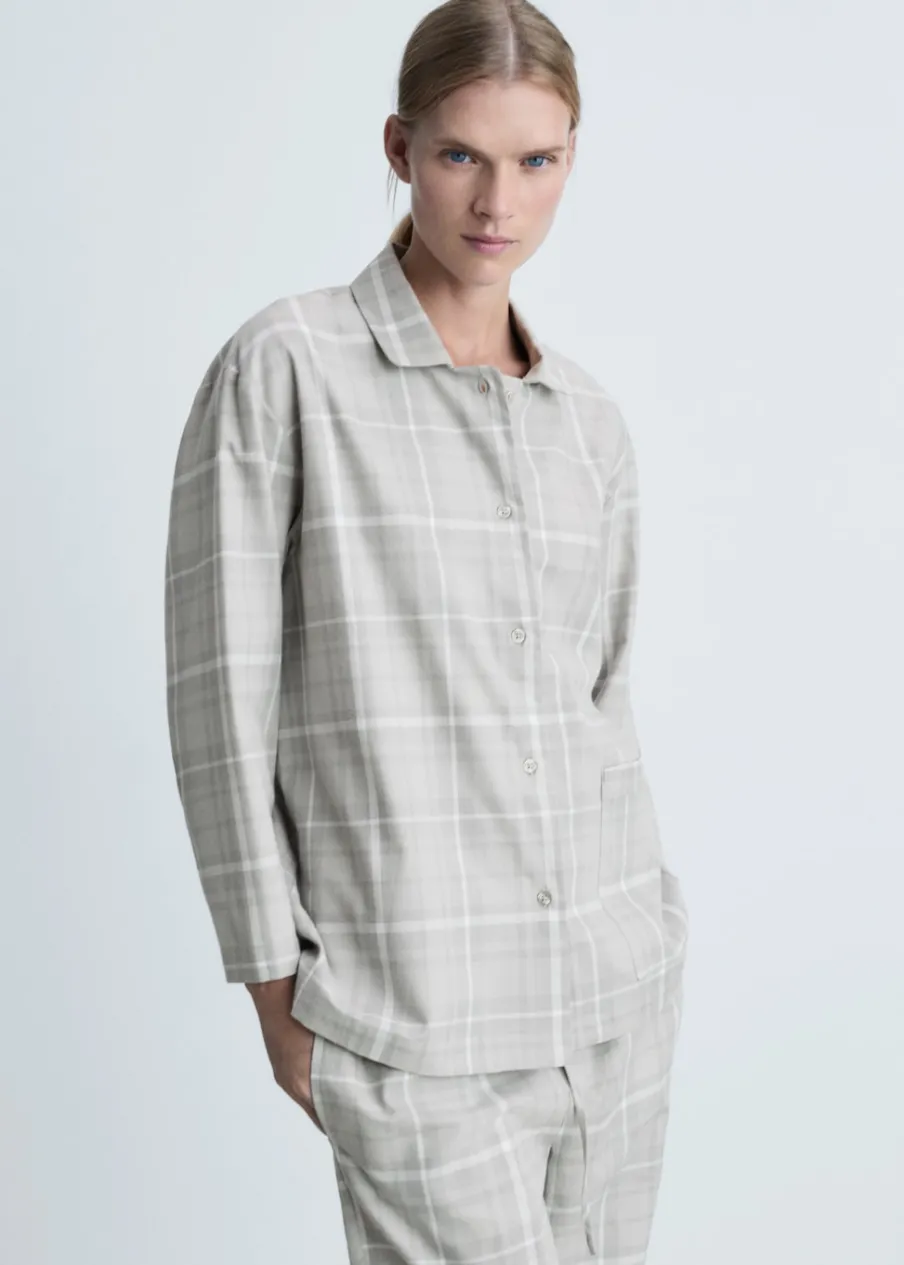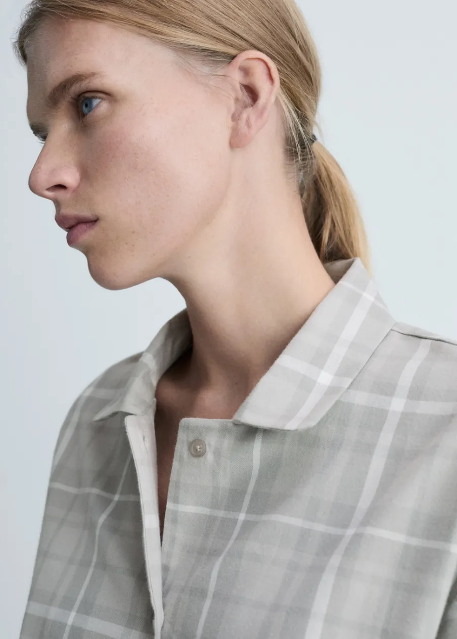 Tkanina flanelowa. Wzór w kratę. Koszulowy kołnierz. Zapięcie na guziki. Modelka ma 178 cm wzrostu i nosi rozmiar S/36. Miękka flanela bawełniana. Flanela jest idealnym materiałem na zimną pogodę, ponieważ zatrzymuje ciepło i pochłania wilgoć. Jest wygodna i wytrzymała. To doskonały wybór na jesienne i zimowe noce. Miękki i ciepły materiał zapewniający komfort w domu. Zapewni wypoczynek w cieple i komforcie zimą.