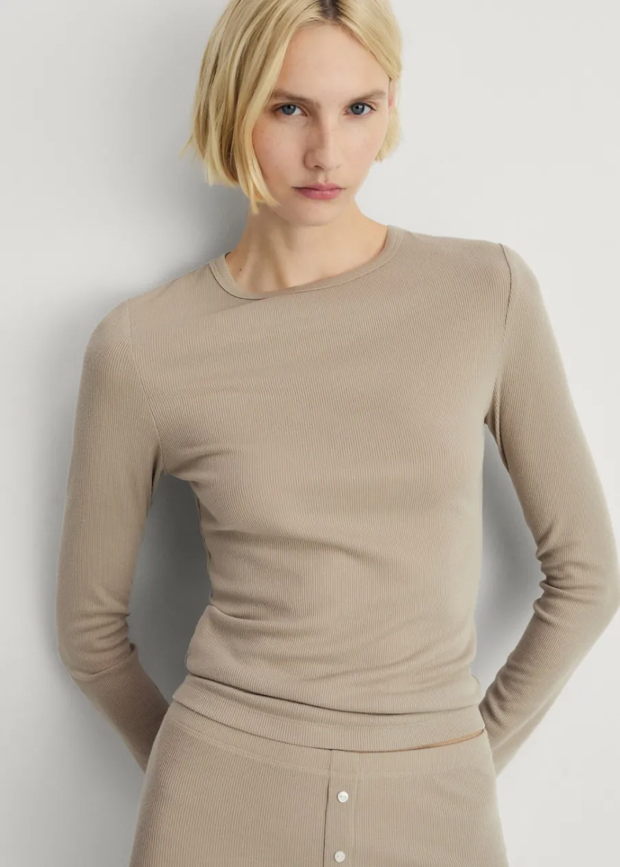 Ściągaczowa dzianina. Elastyczna tkanina. Okrągły dekolt. Długi rękaw. Model wcięty. Bez zapięcia.